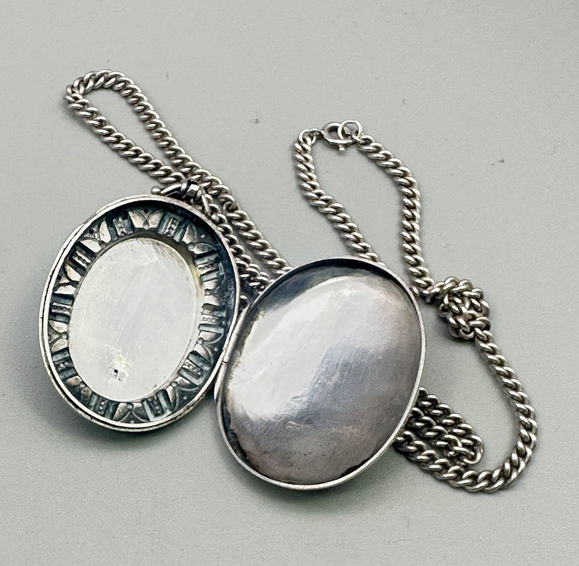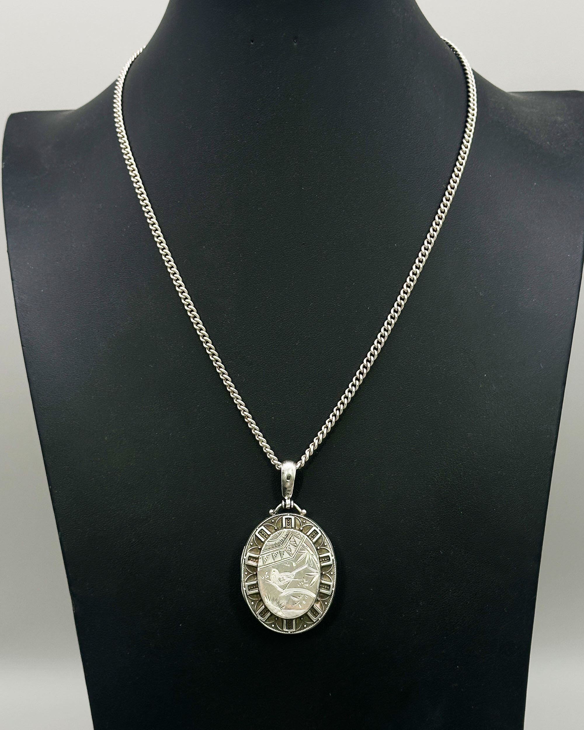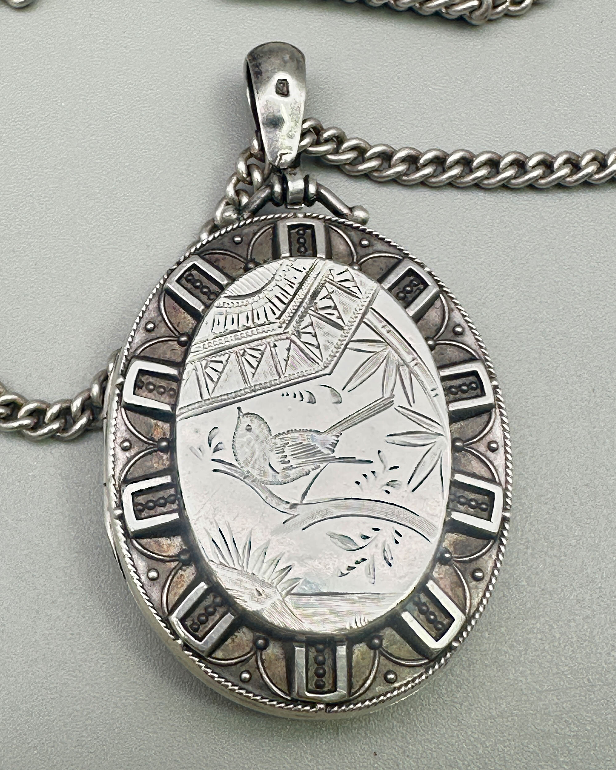This is an amazing locket that is a perfect example of the Aesthetic Movement in Britian. This was aligned with Arts and Crafts but the Aesthetic designs featured classical and Japanese designs that were considered more opulent and elegant than the over the top designs of the Victorian period. It was a response to the mass consumerism that was taking over Britian during this time. This locket is marked with full English marks. It is paired with a belcher chain of a similar age.| Size: | Locket is 44 x 32.5 mm without the bale, Necklace is 50 gm long |