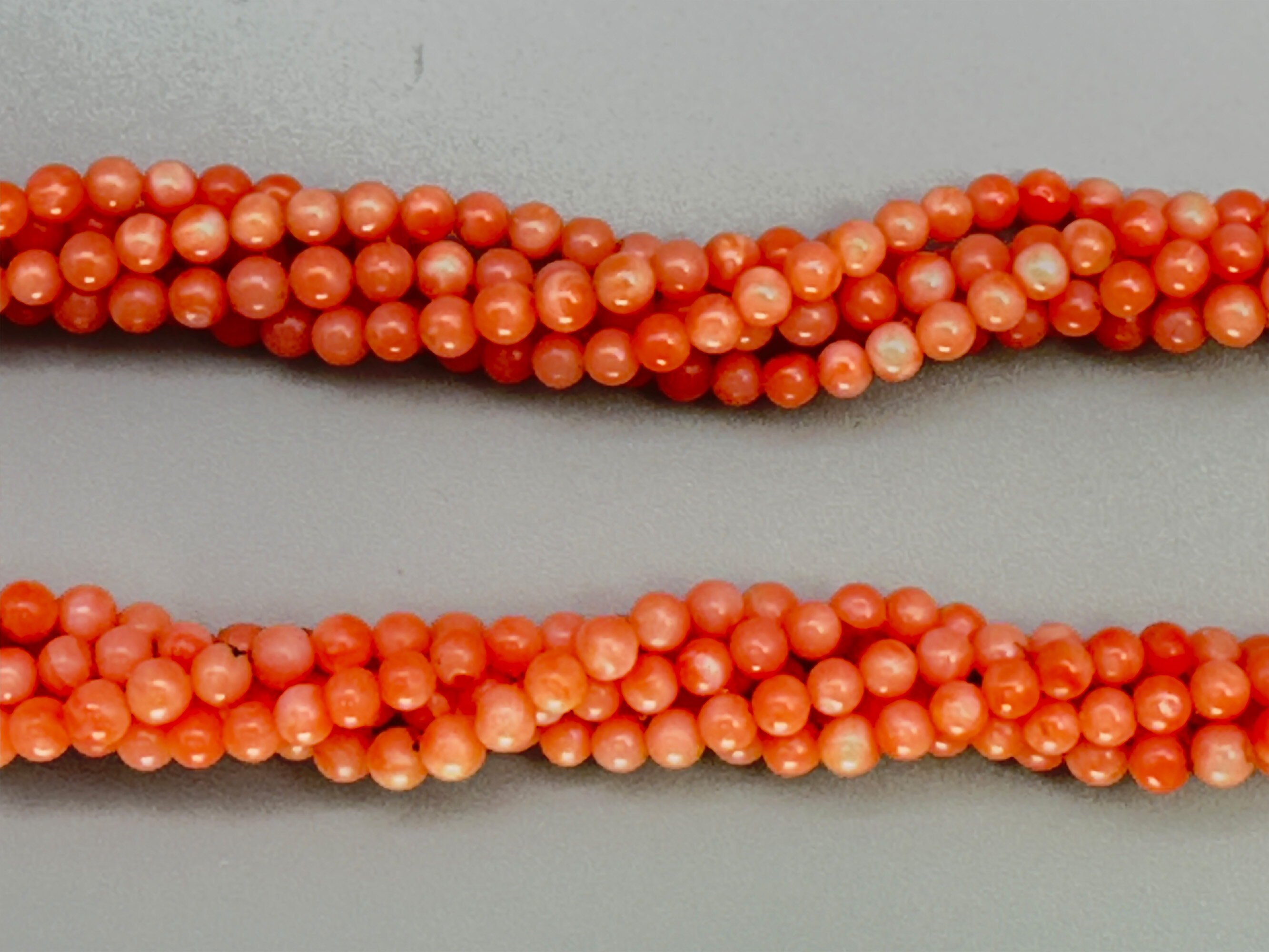 This is quite an unusual necklace comprising five strands of small coral beads that are twisted together. It has a matching clasp that is set with a coral stone. The beads are angel skin coral which comes from mainly Japan and Taiwan. The clasp is gold tone. The beads are most likely colour enhanced due to the uniformity. This is very common but it does effect the value somewhat.| Size: | Beads are 3.6 mm, Length is 44 cm |