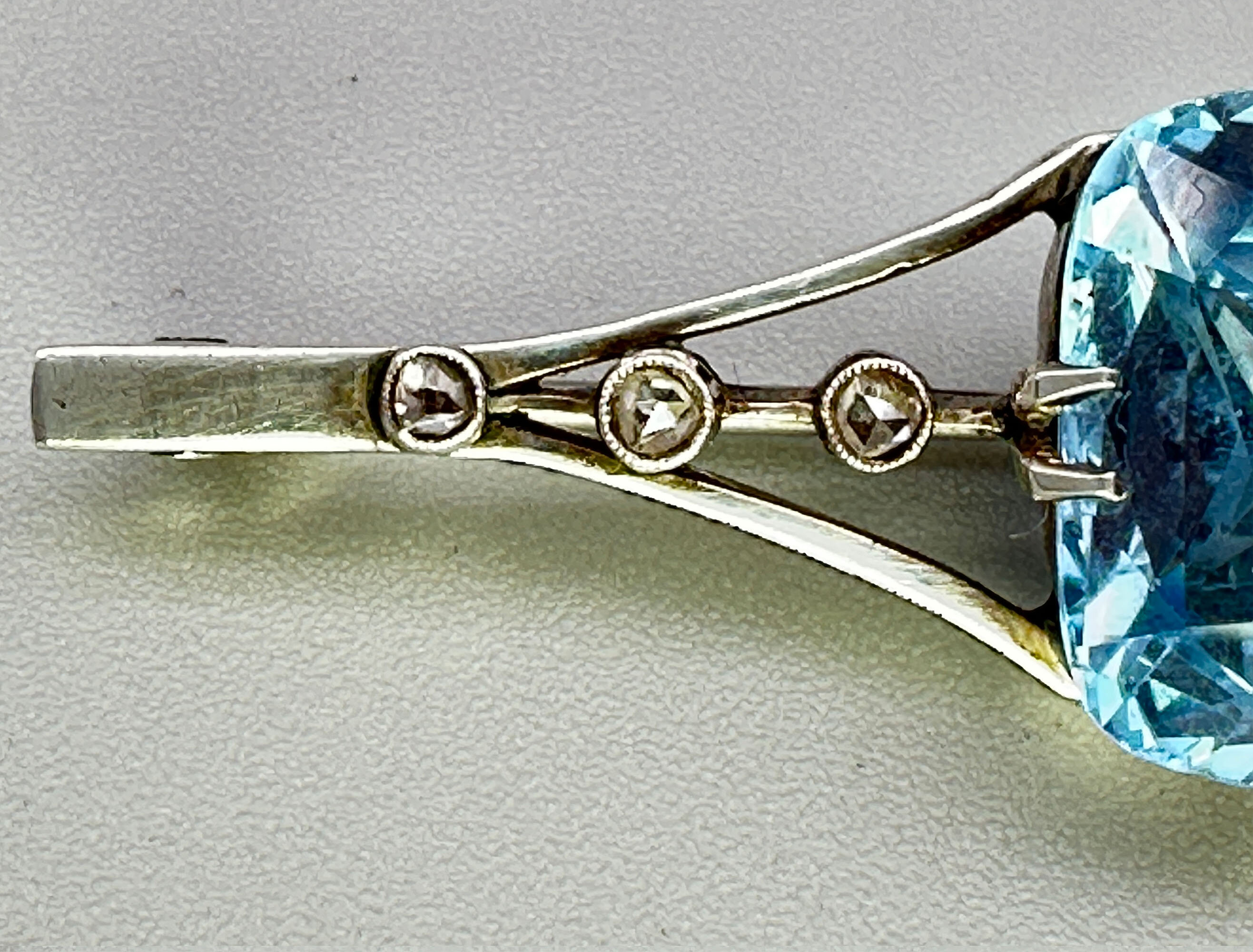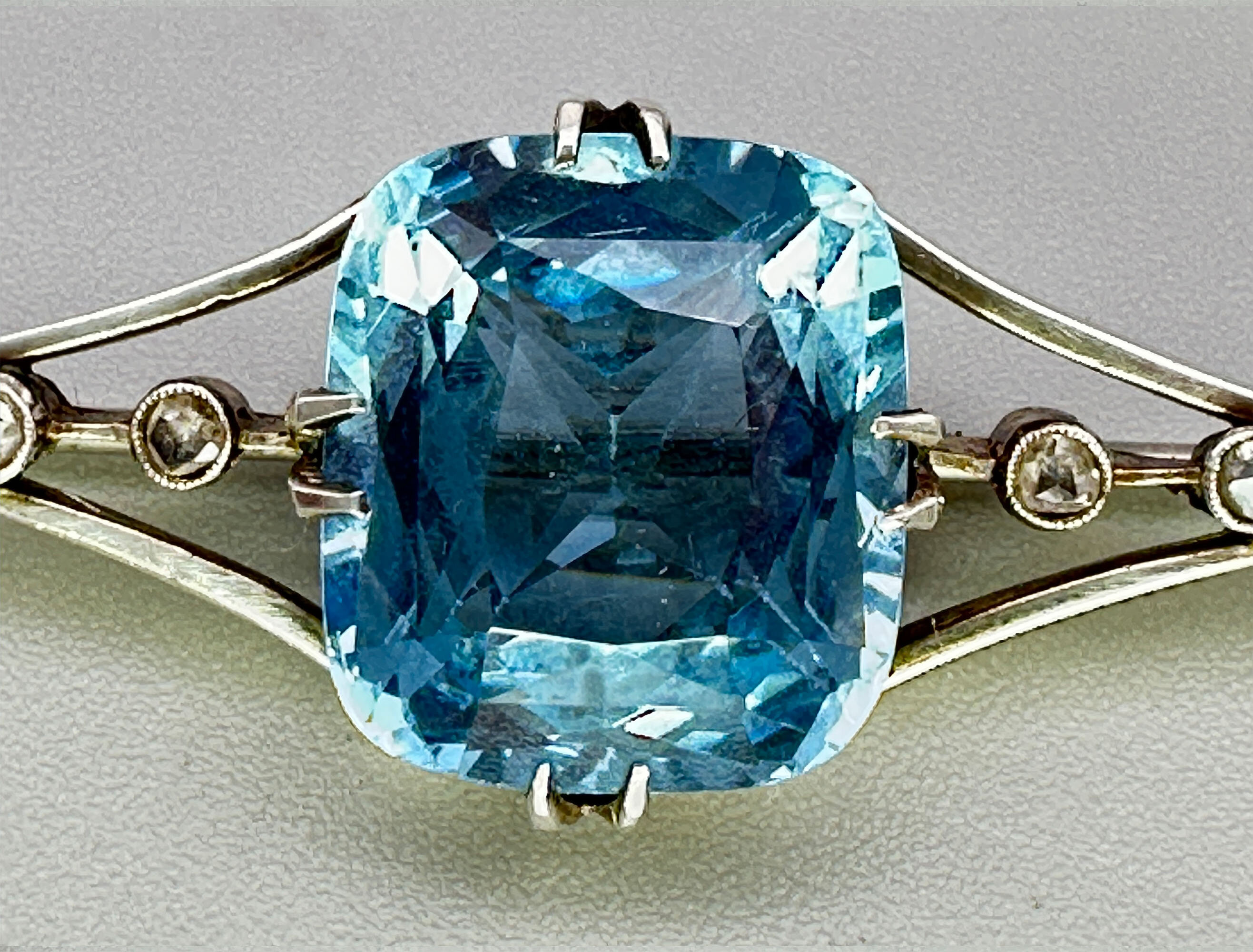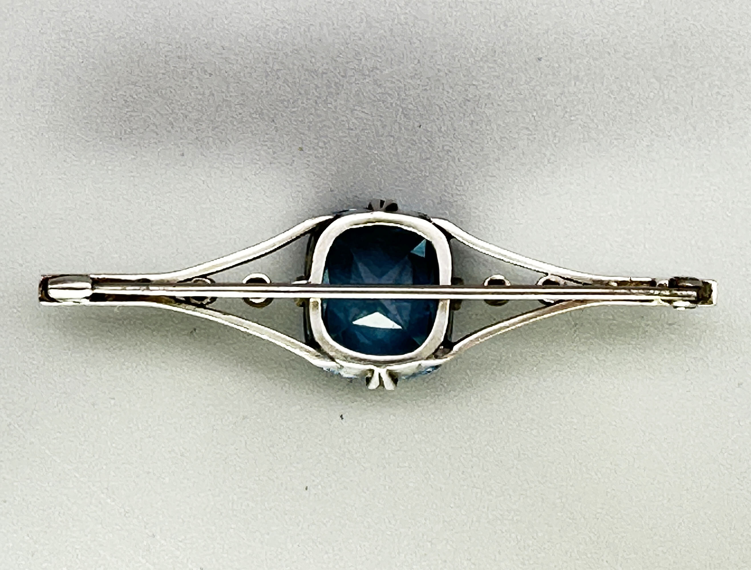 This is a silver bar brooch set with European cut diamonds and a large blue zircon. It is set in an elegant Art Deco design that shows off the central stone. It is unmarked.| Size: | 59 x 16 mm Central stone is 15 x 13 mm |
