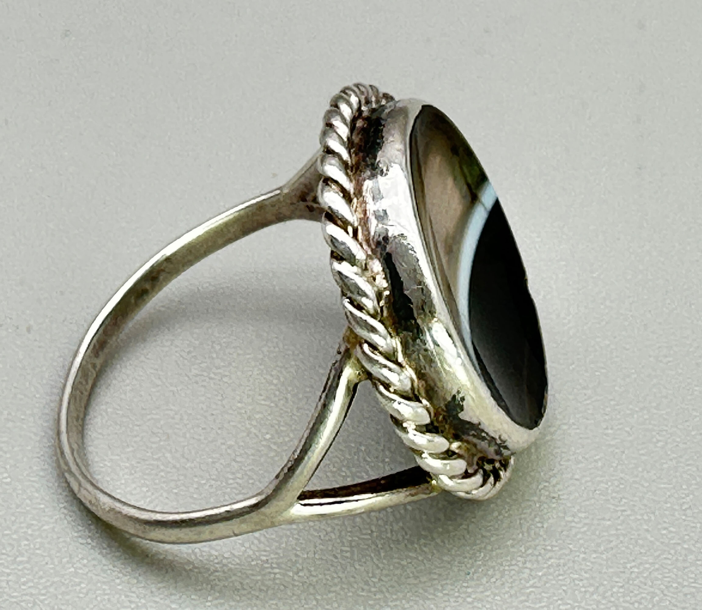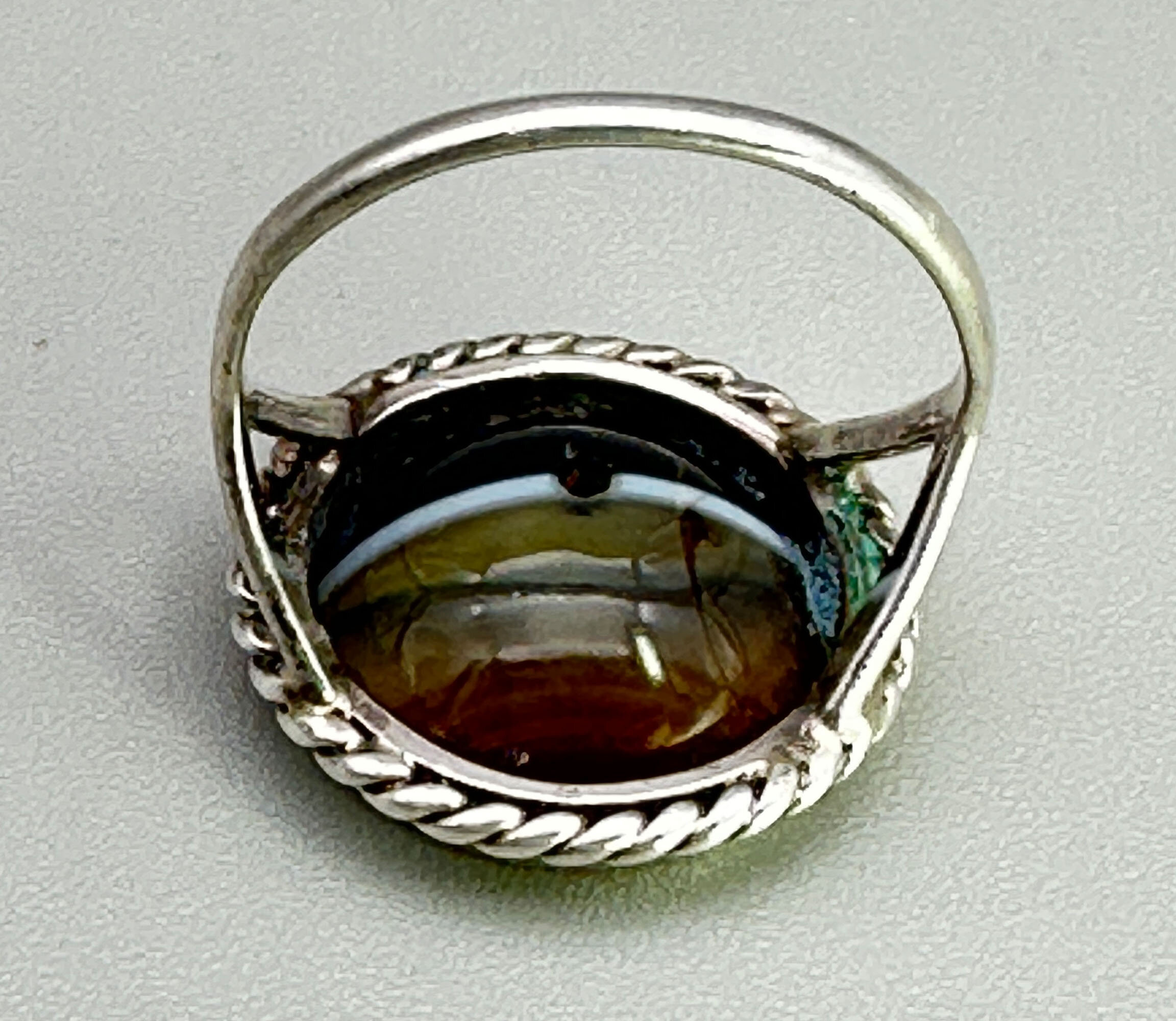 This is a very usual ring due to its central stone. The stone is a typical Scottish agate that has been carved into a concave shape. It is set in silver and surrounded with milgrain work.| Size: | The setting measures 19 mm in diameter, Ring size is UK M, US 6.5 |