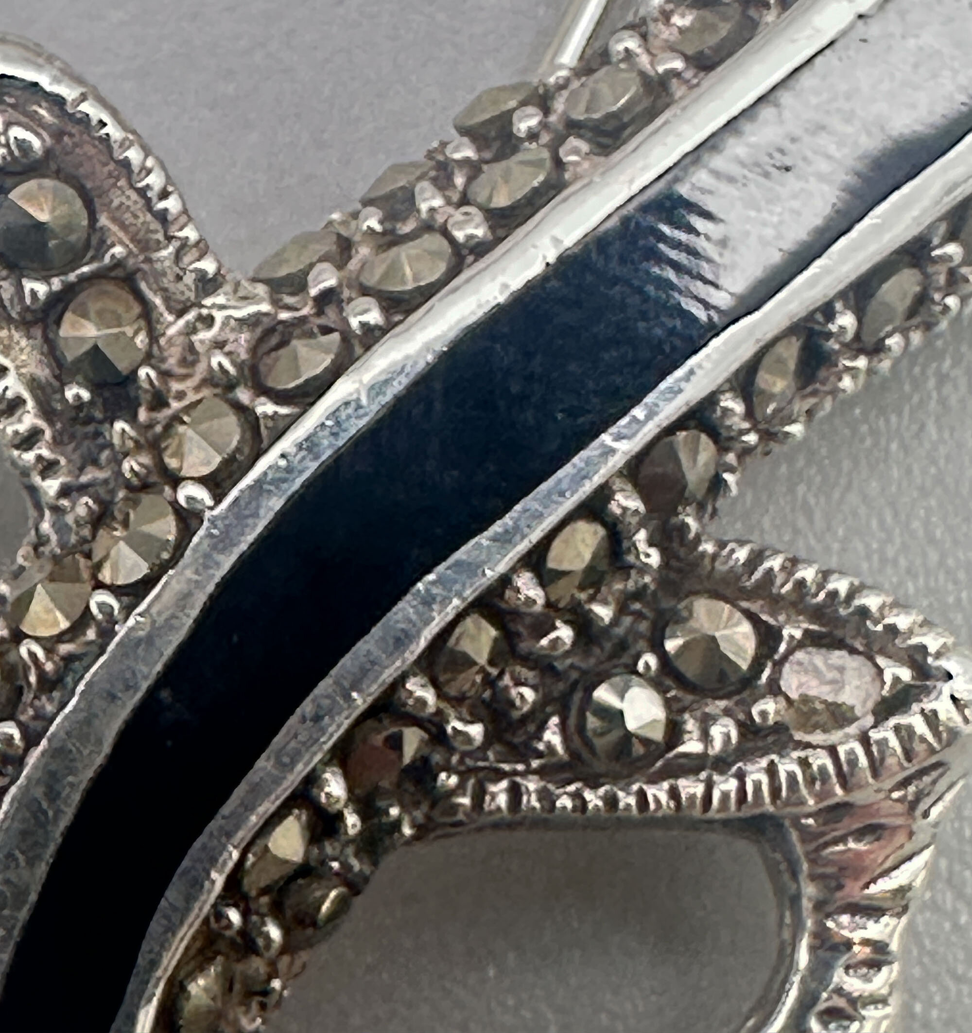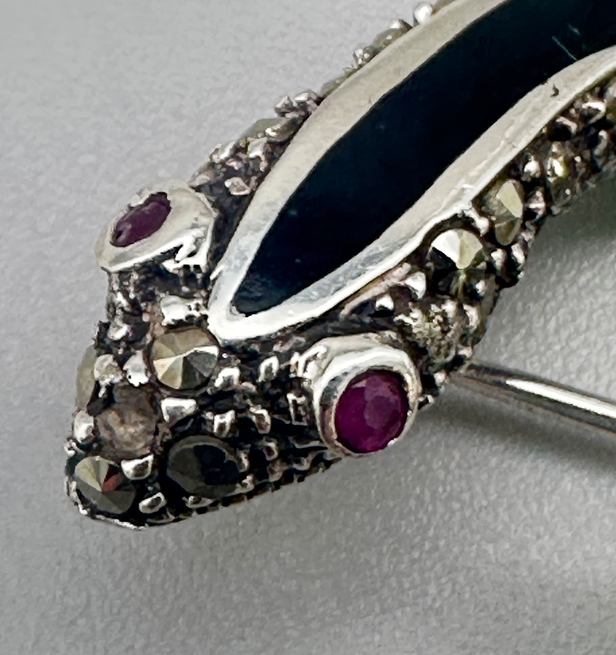 This is a striking large brooch that is in the shape of a crawling lizard. It is encrusted with marcasite stones and has a black enamel back. The eyes are rubies. It is marked 925.| Size: | 109 x 29.3 mm |