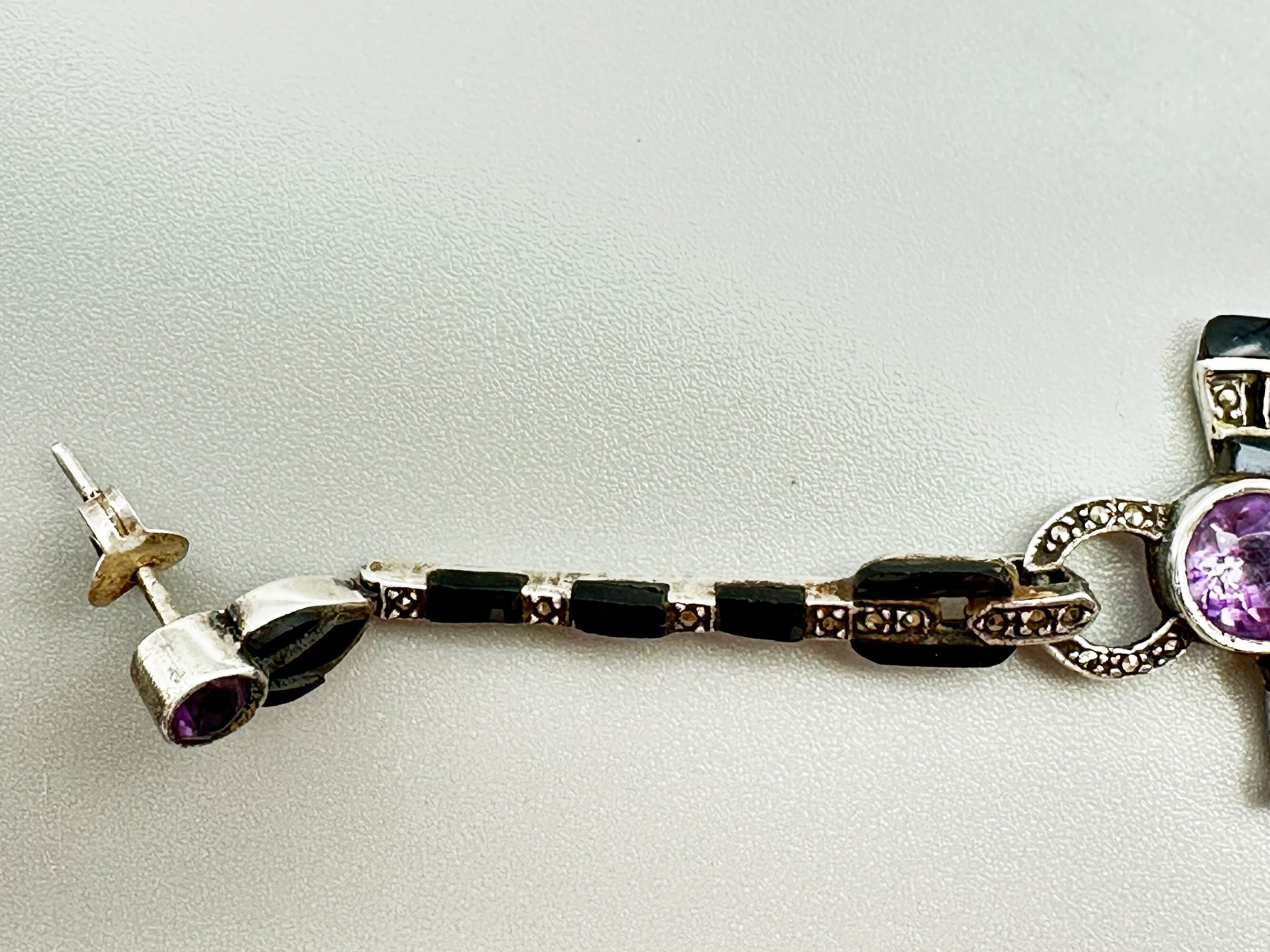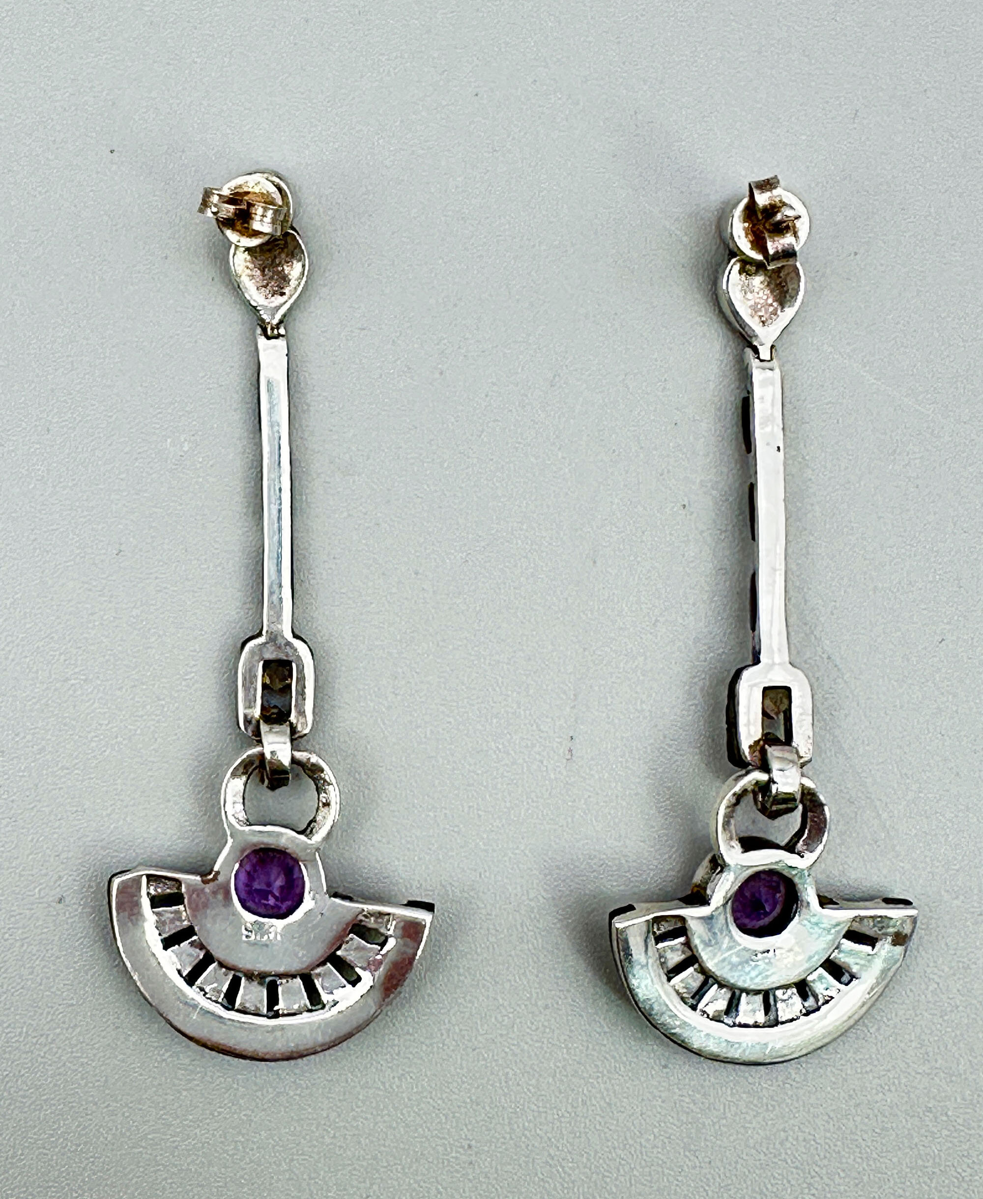 This is a pair of earrings that have a quintessential Art Deco design. They are set with onyx stones (not enamel), marcasites and amethysts. They are marked 925. These are not from the Art Deco period but show how popular these designs remain in the present day.| Size: | 61 x 22.5 mm |