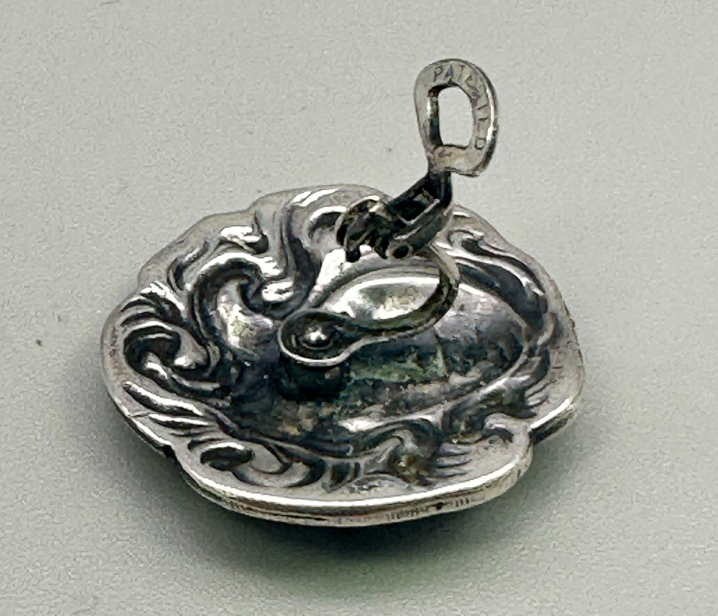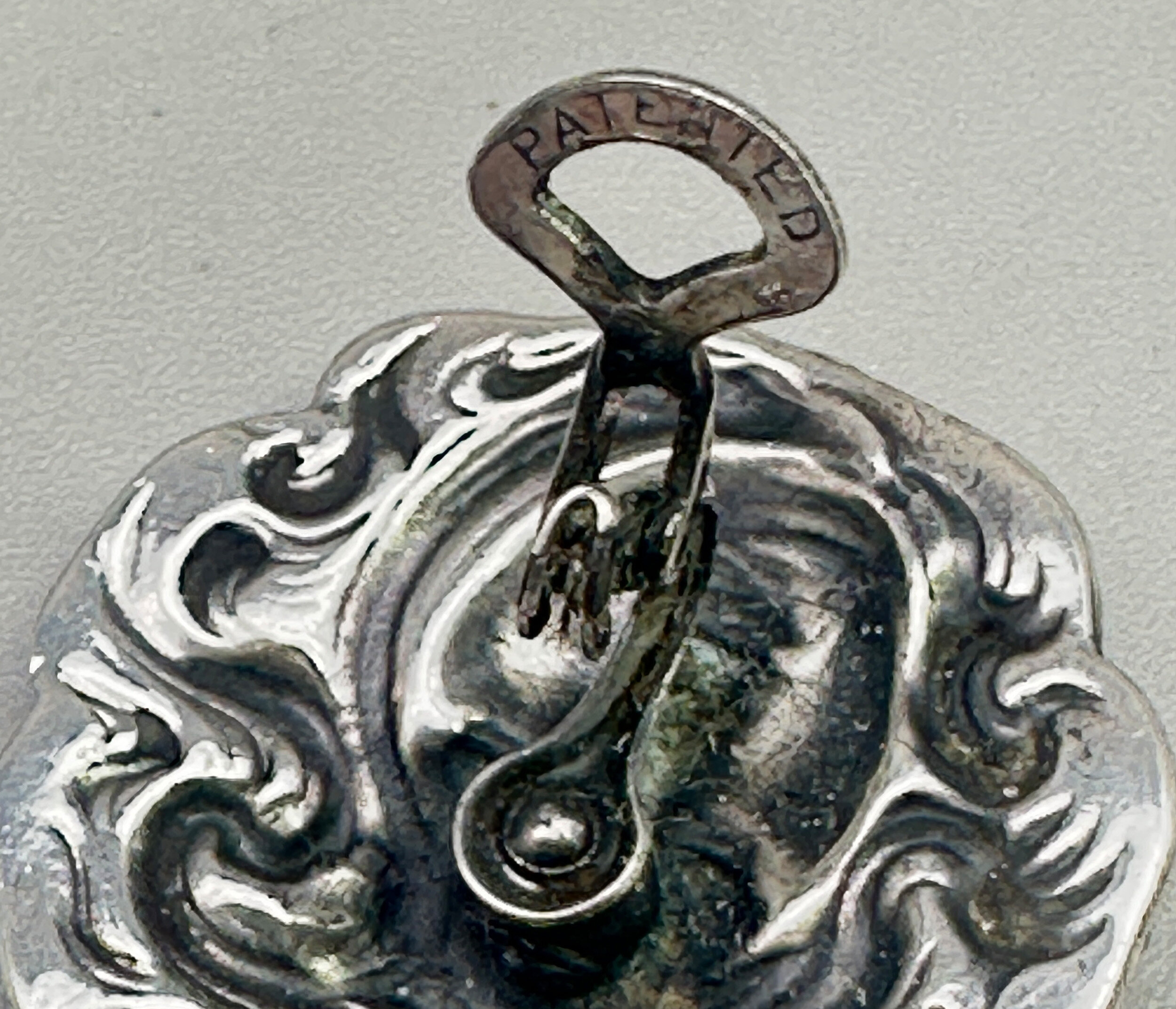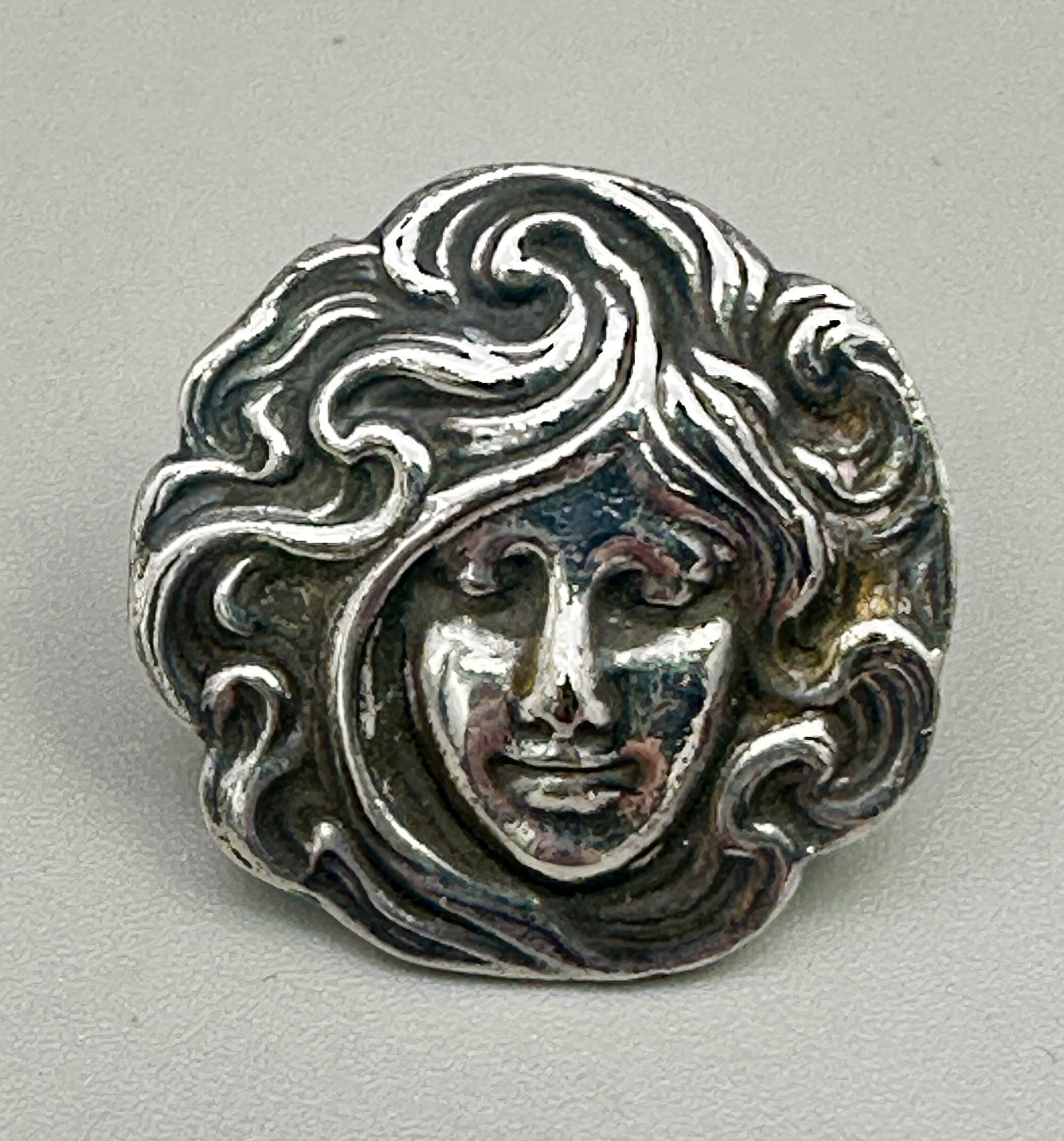 This is a wonderful pair of earrings that are true period pieces of Art Nouveau. They are clip earrings that feature the typical image of a ladies face with her hair swirling around her. They are most likely Belgian or Austrian. These are an exciting find for Art Nouveau collectors. They are unmarked silver with clips that are marked Patent.| Size: | 26.7 mm diameter |
