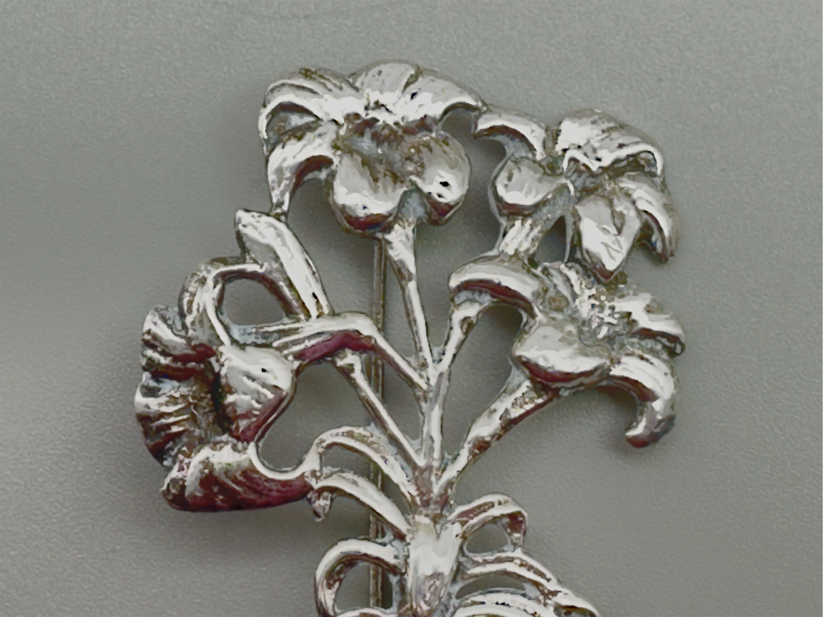 This is a large brooch with a lily spray design. It is marked 'silver' and there is a makers mark. The origin of this piece isn't clear.| Size: | 62 x 39 mm |