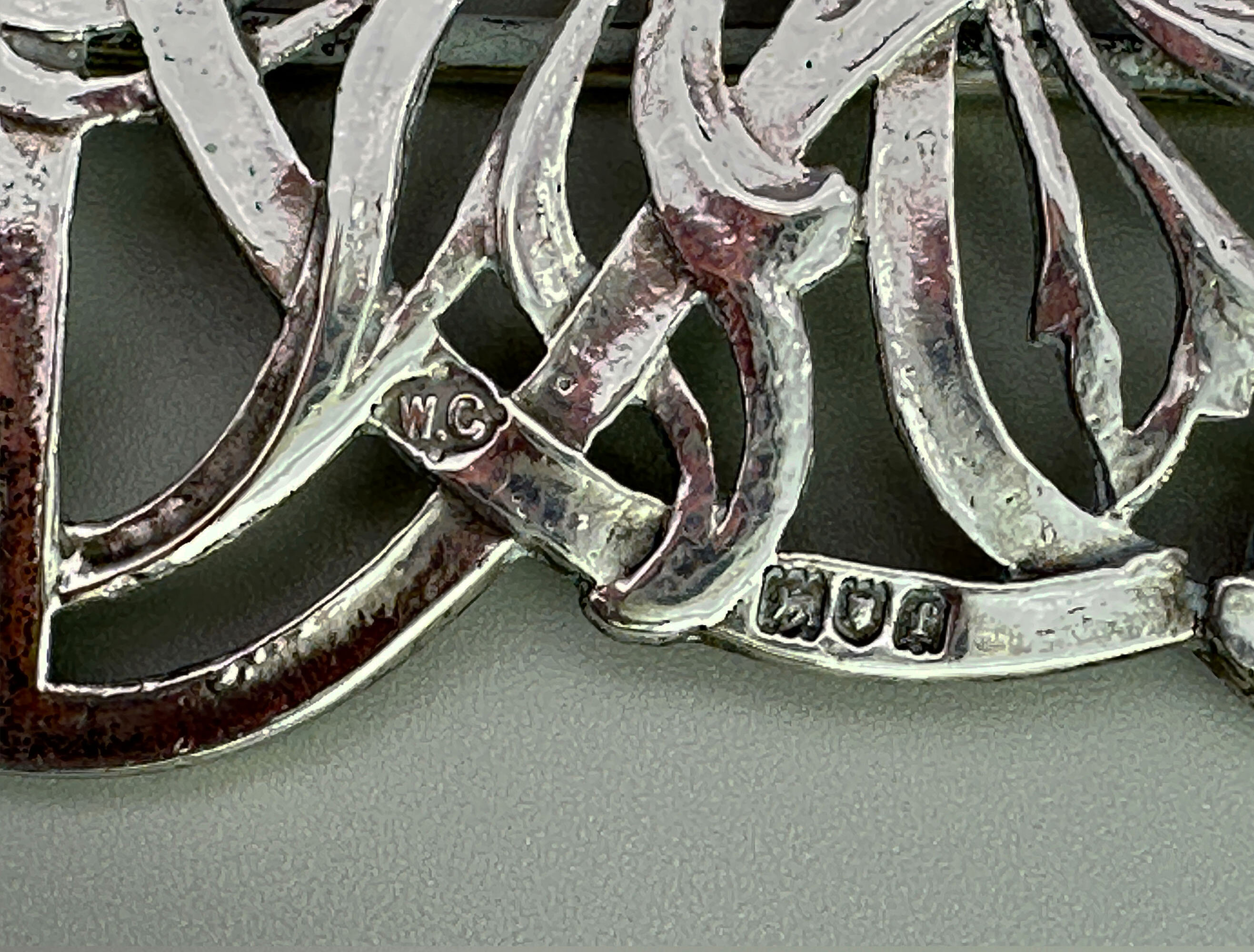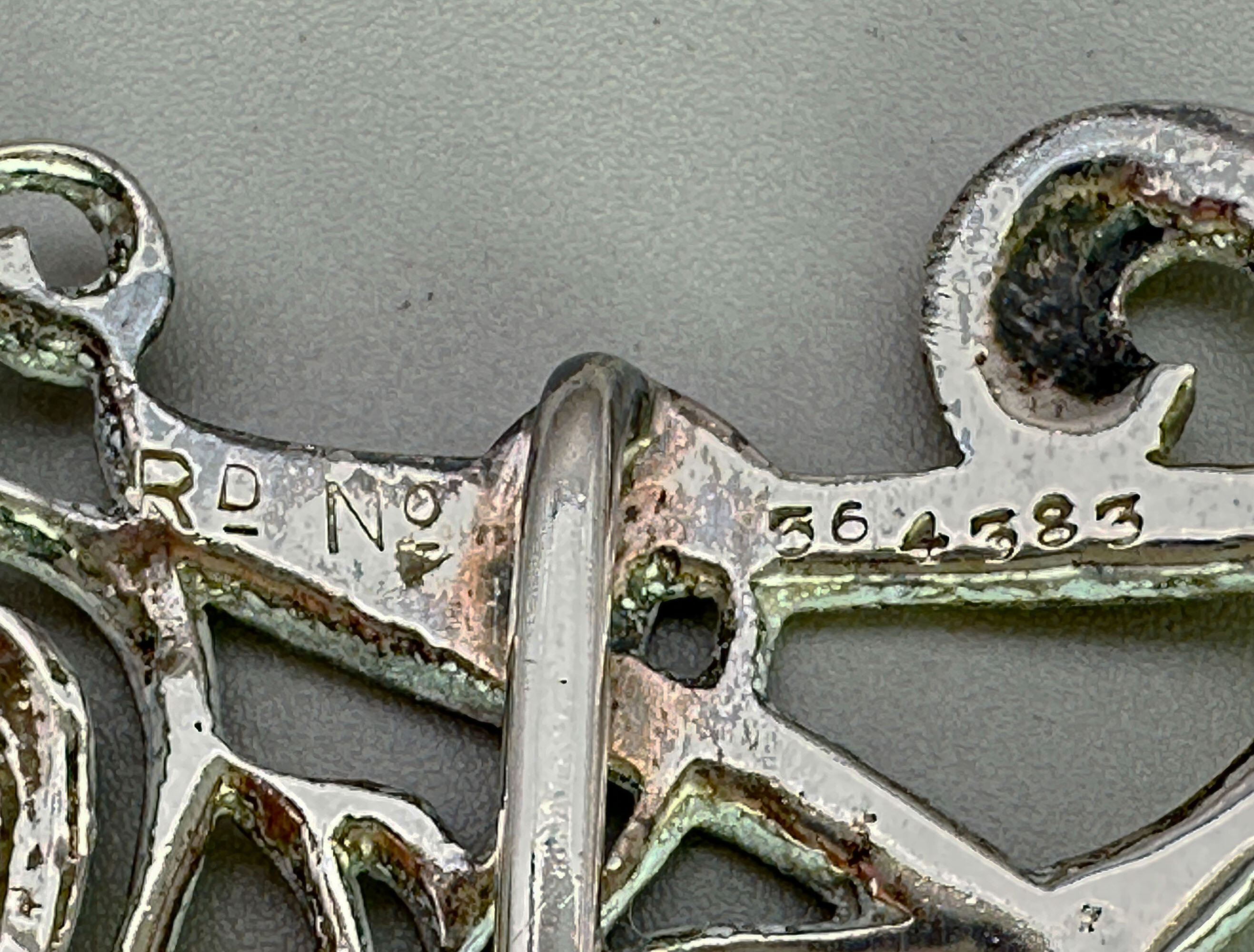 This is a piece of true Art Nouvea design. It is a ladies silver buckle by silver maker William Comyns. It bears the hallmarks for Comyns, London 1901. There is also a design patent number Rd No 564 383.William Comyns founded the company in 1858. He initially operated from the former premises of silversmith Robert Tagg at 2 Carlisle Street, Soho, London, where he registered his first maker’s mark (W.C in a four-tipped oval) in 1859. Comyns’ silverware was retailed by some of the world’s most prestigious firms, including Tiffany & Co., The Goldsmiths & Silversmiths Company, and leading London retailers such as Henry Lewis and Howell & James.