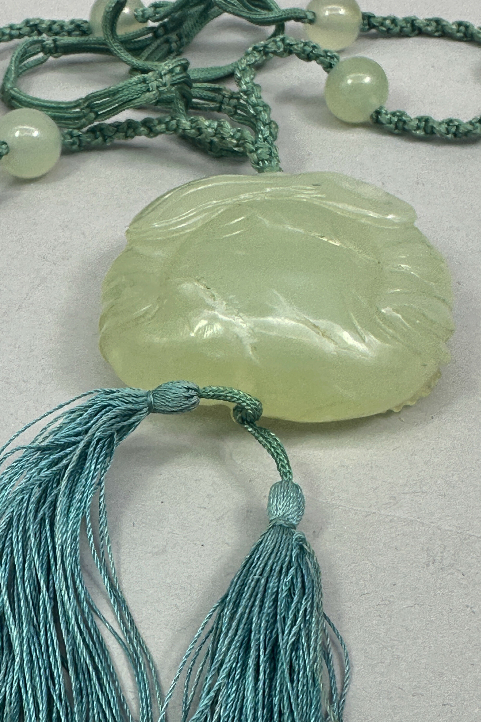 This is a beautiful and long necklace that features a large carved Buddha pendant figure in celadon jade. It is strung on the original silk cord that also has bead stations. (Please note that although this is jade, we are not specialists in this field and cannot be sure whether or not the jade has been treated in some way.)| Size: | Carving : 46.2 mm x 47 mm wide; beads :10.9 mm; necklace length 70 cm |