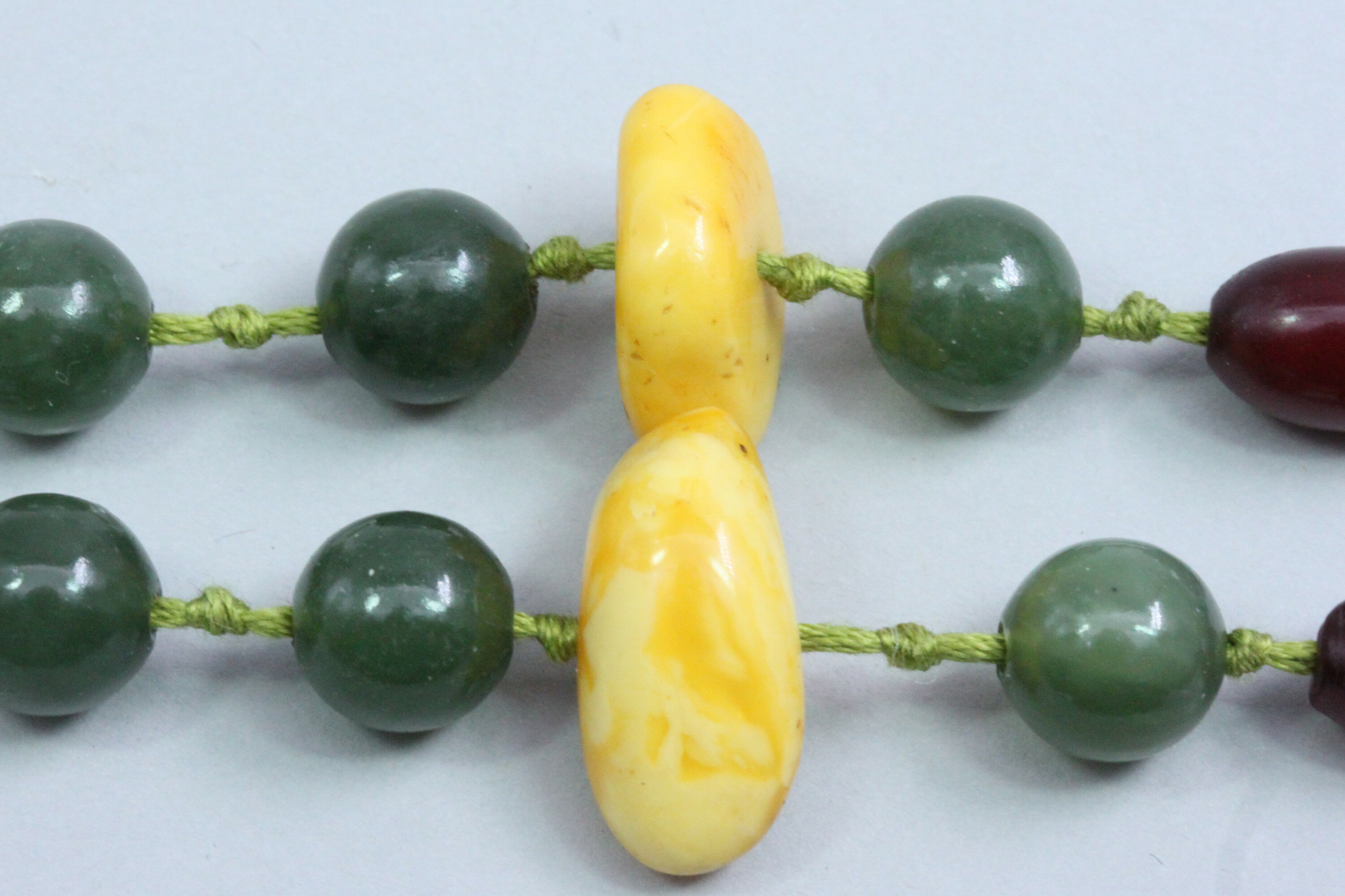 Constructed necklace with jade, egg yolk amber and cherry amber, C20th