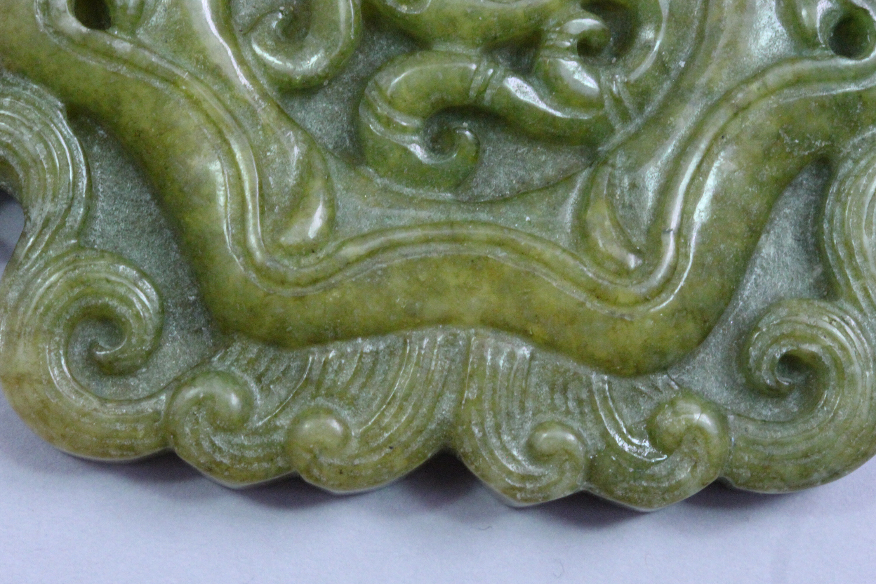 This necklace is a wonderful ensemble comprising cherry and egg yolk amber beads together with jade beads, terminating in a very large carved jade plaque which is a very fine example of Chinese carving, with an allegorical motif of a dragon's mouth around a smaller dragon, and formed from golden spinach jade, an unusual colour.| Size: | 64 cm long, drop is 13 cm, pendant 6.2 cm x 8 cm |