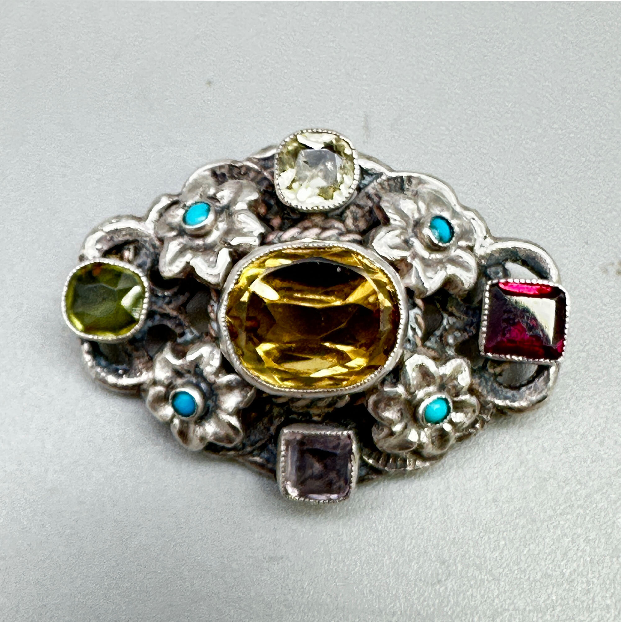 This is a wonderful necklace in the Egyptian Revival style comprising silver filigre stations mounted with large Cairngorm citrine stones that vary in size from 63 mm and 105 mm. It is inscribed "Hedydd from her godparents C A.M. J J.H-J E.H-J July 14th 1910"| Size: | 38 cm long, 5 cm wide |