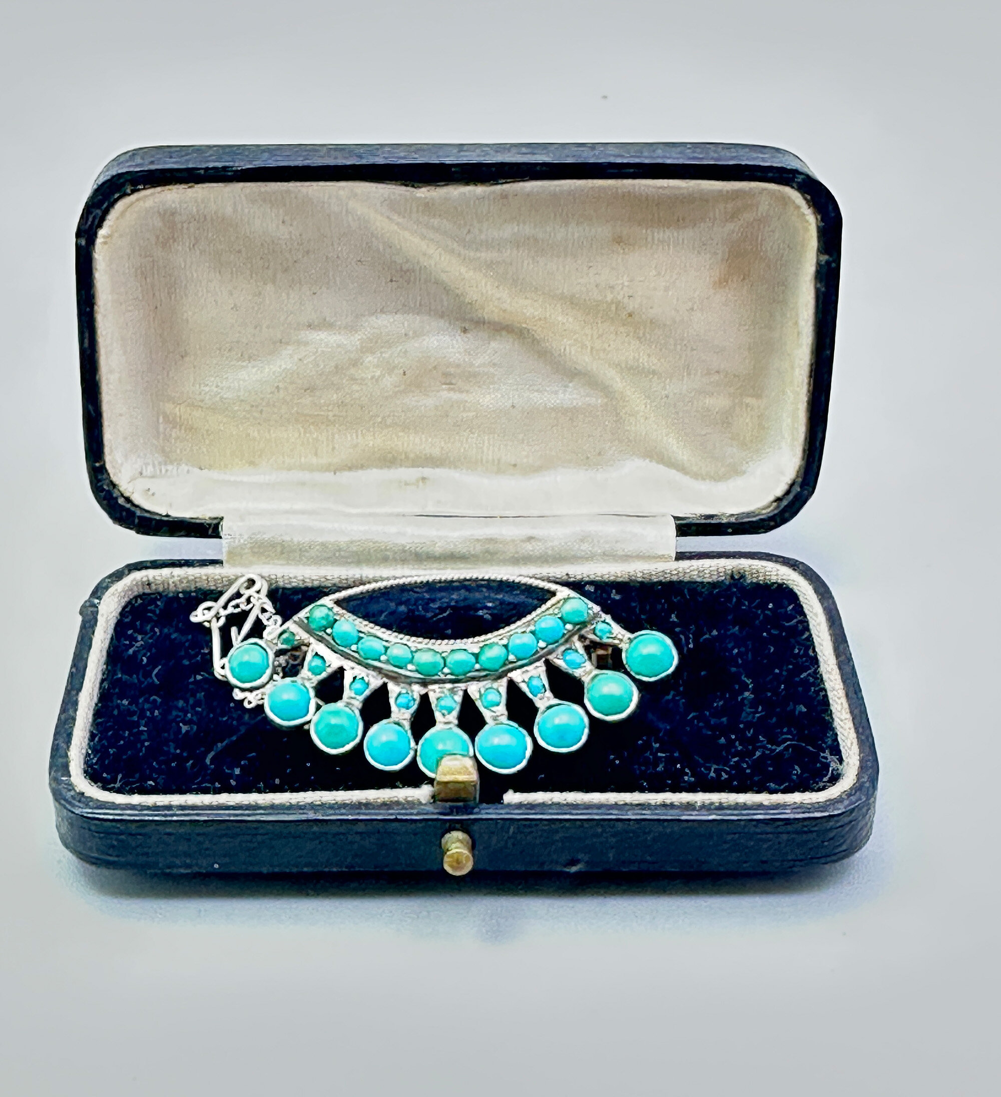 This a very unusual brooch created from silver set with turquoise stones. It is in a crown shape and has nine large stones and numerous smaller stones. It is continental with the turquoise being most likely from the Middle East. It is unmarked and comes in its original box.| Size: | 41 x 19 mm |