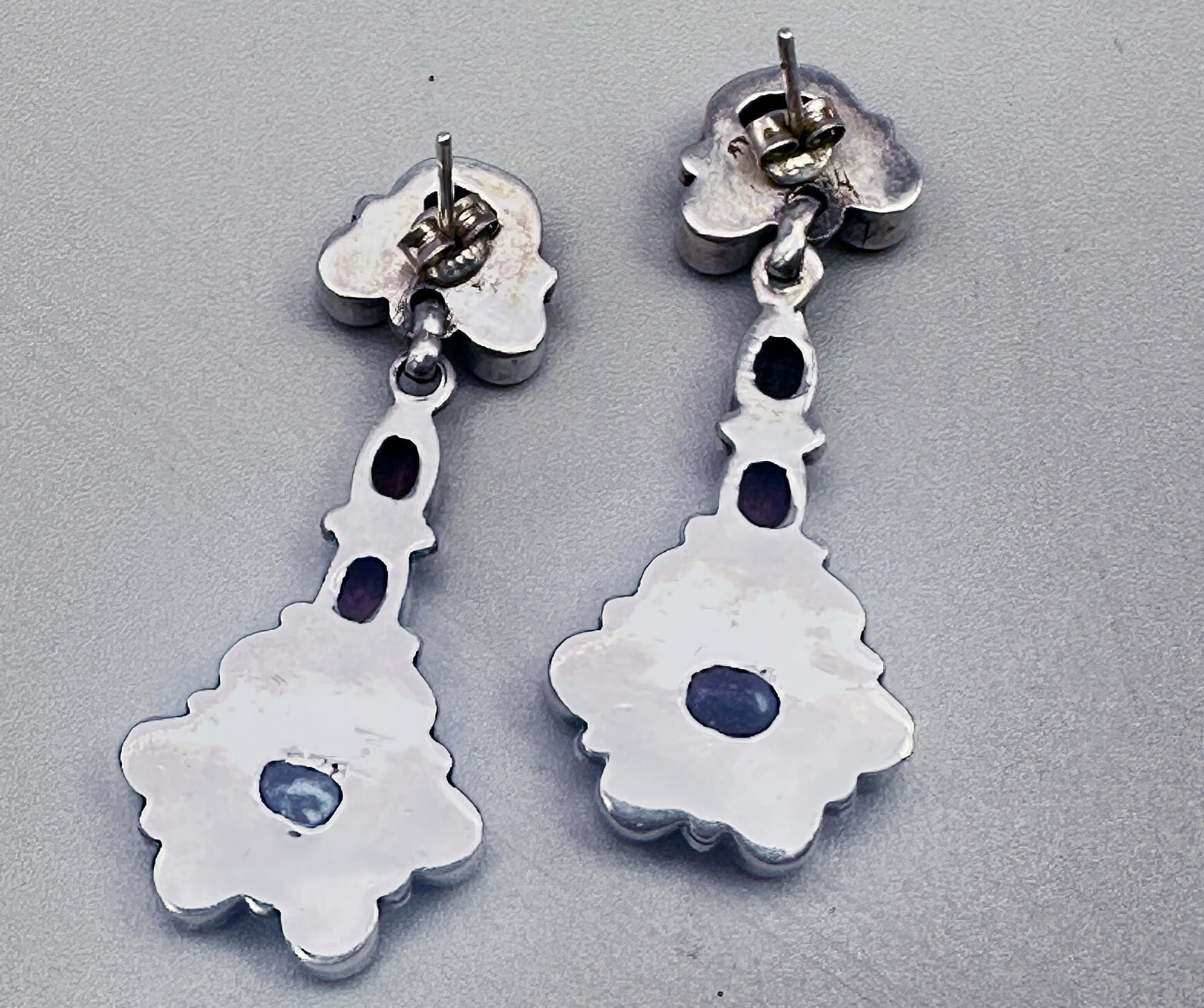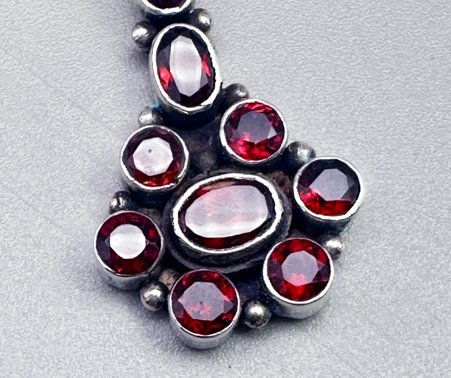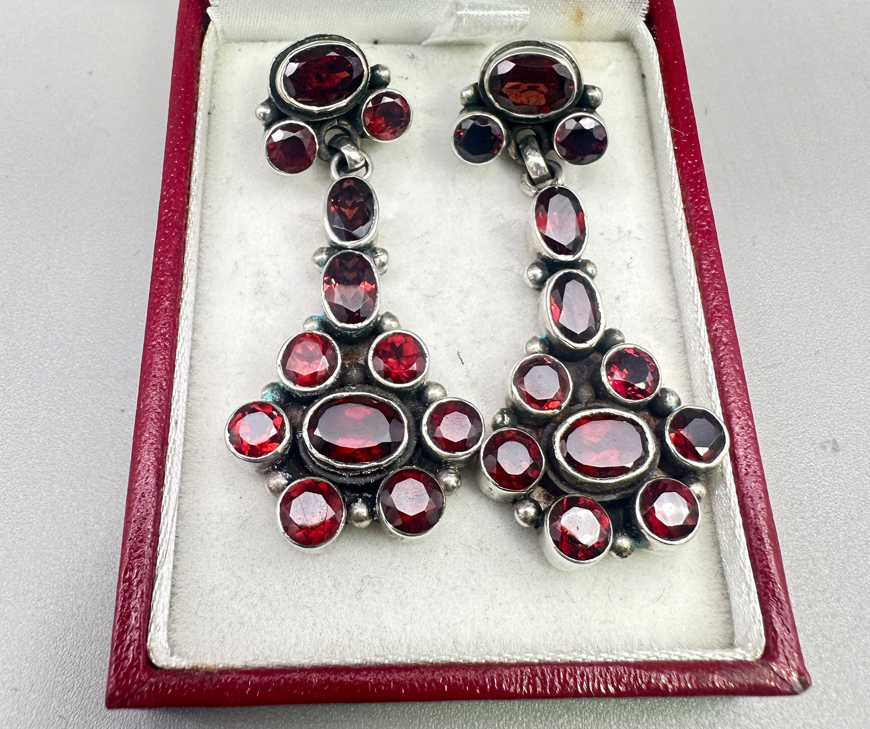 These are very vivid pair of earring that are set with beautiful garnets in both oval and round facetted stones. They are unmarked but test as 925 silver. They are Indian in origin.| Size: | Each measures 45 x 18 mm |