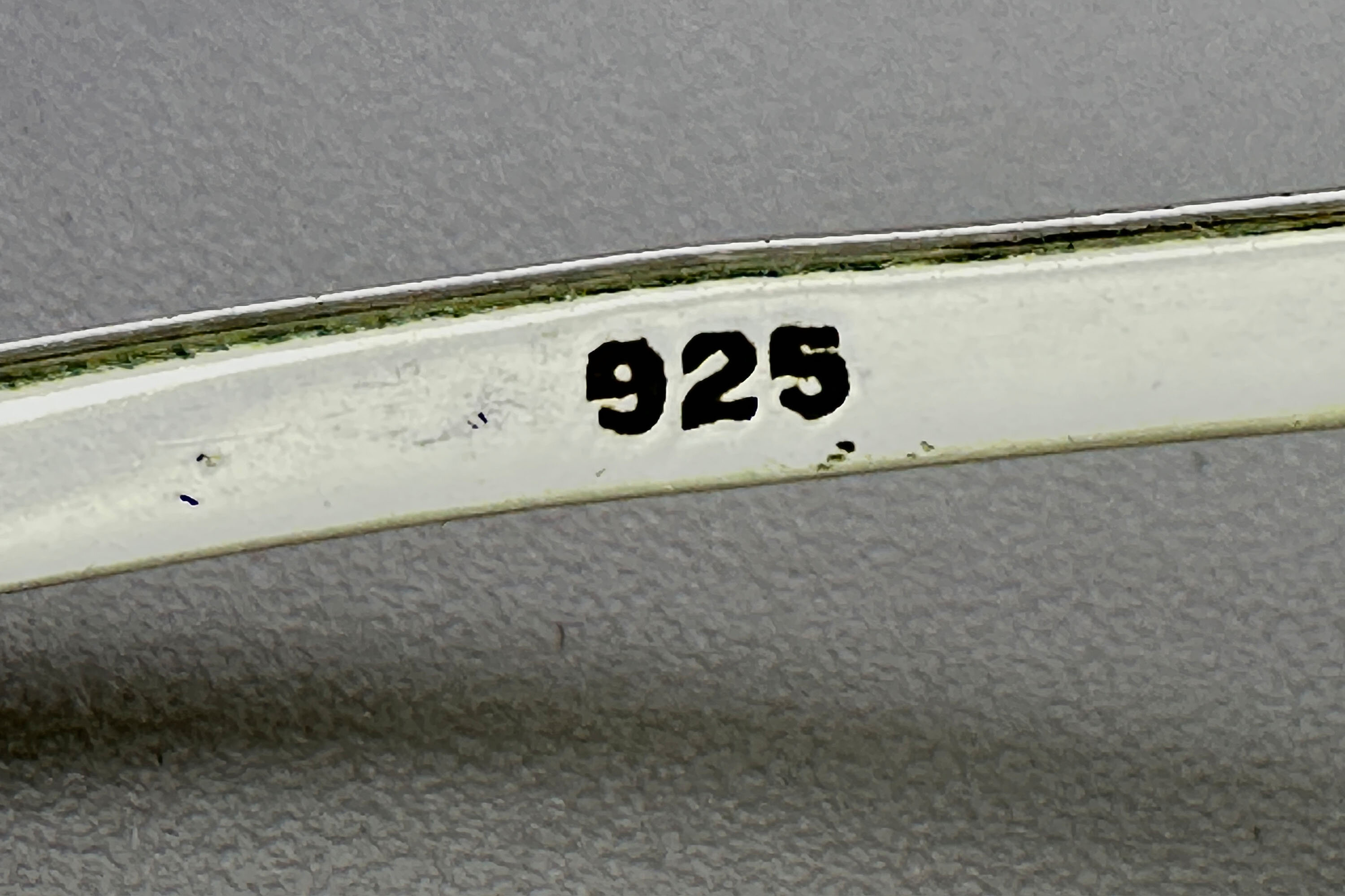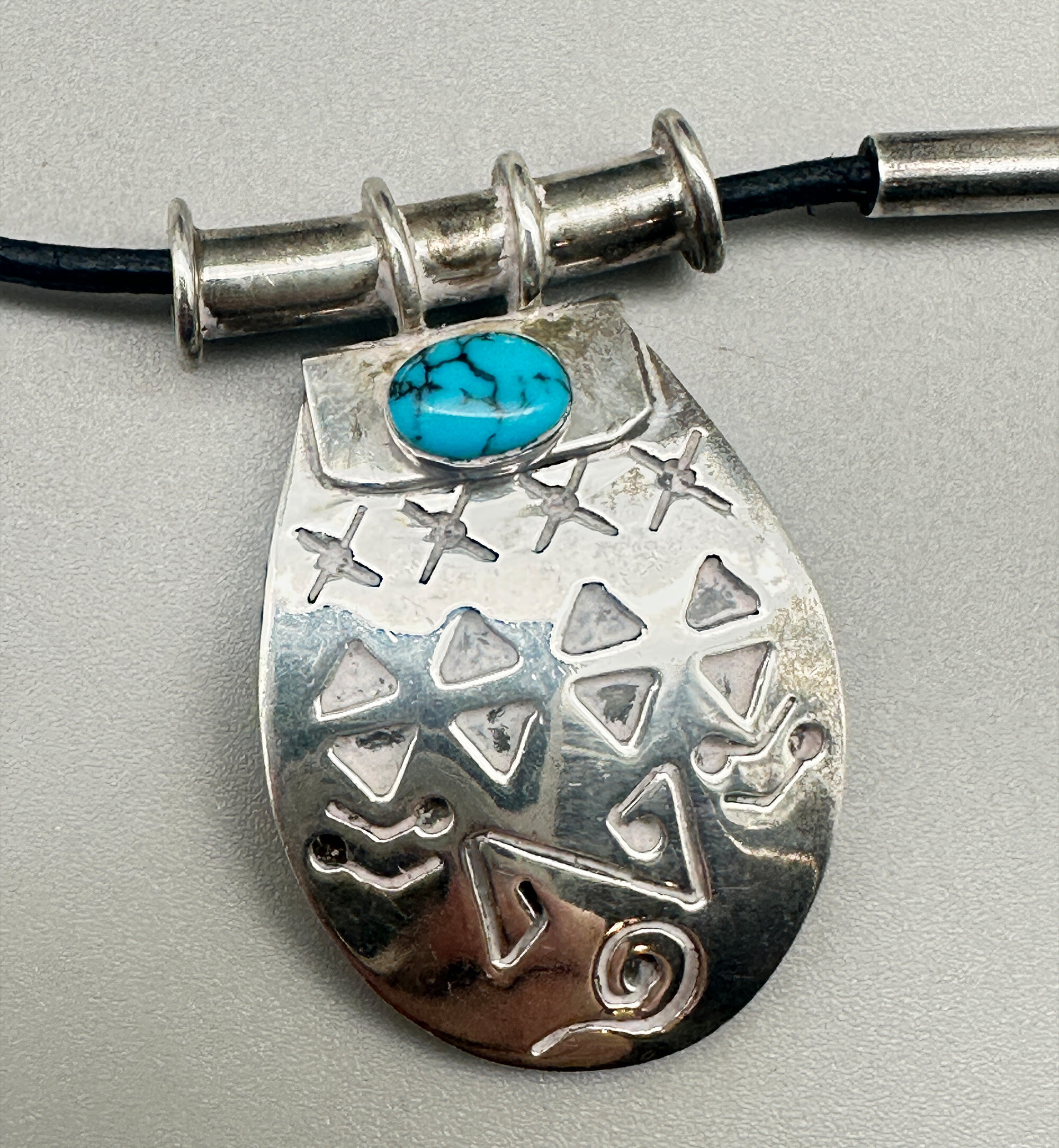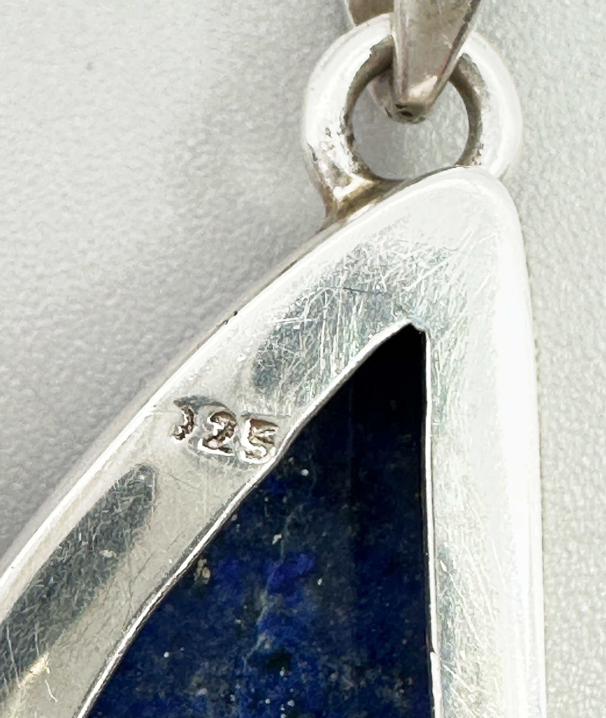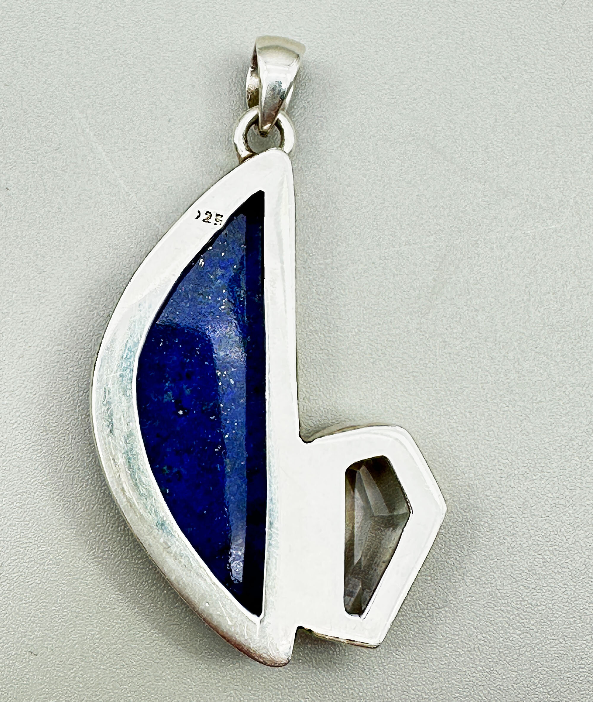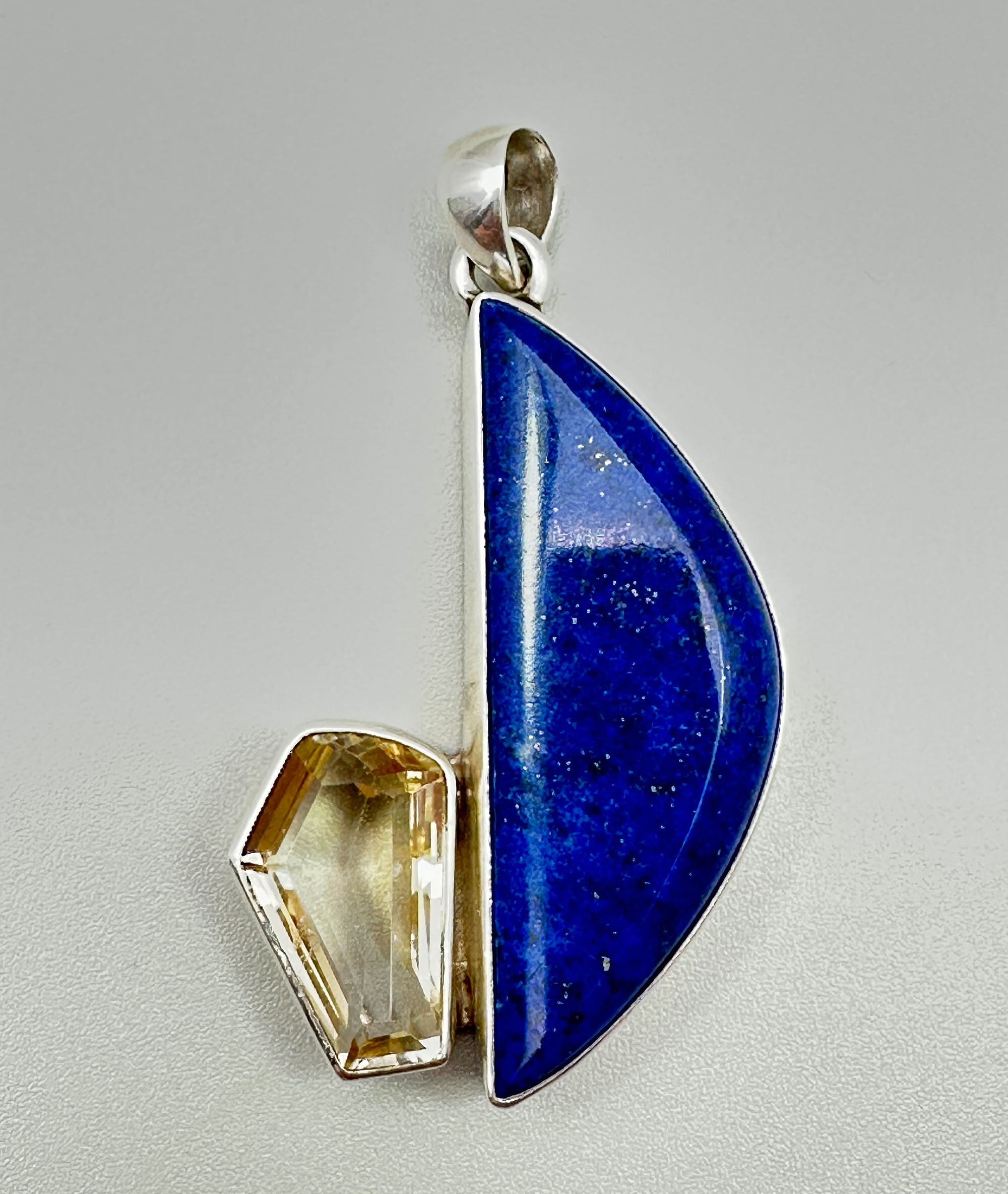 This is a very sleek necklace with a geometric pendant on a torque necklace. The pendant has a half moon shaped Lapis Lazuli stone and a fancy cut five sided lemon quartz stone. This is a very elegant and balanced piece. Both pendant and necklace are marked 925.| Size: | Pendant without bail 56.4 x 38.7 mm, necklace is free size and is 3.3 mm wide |