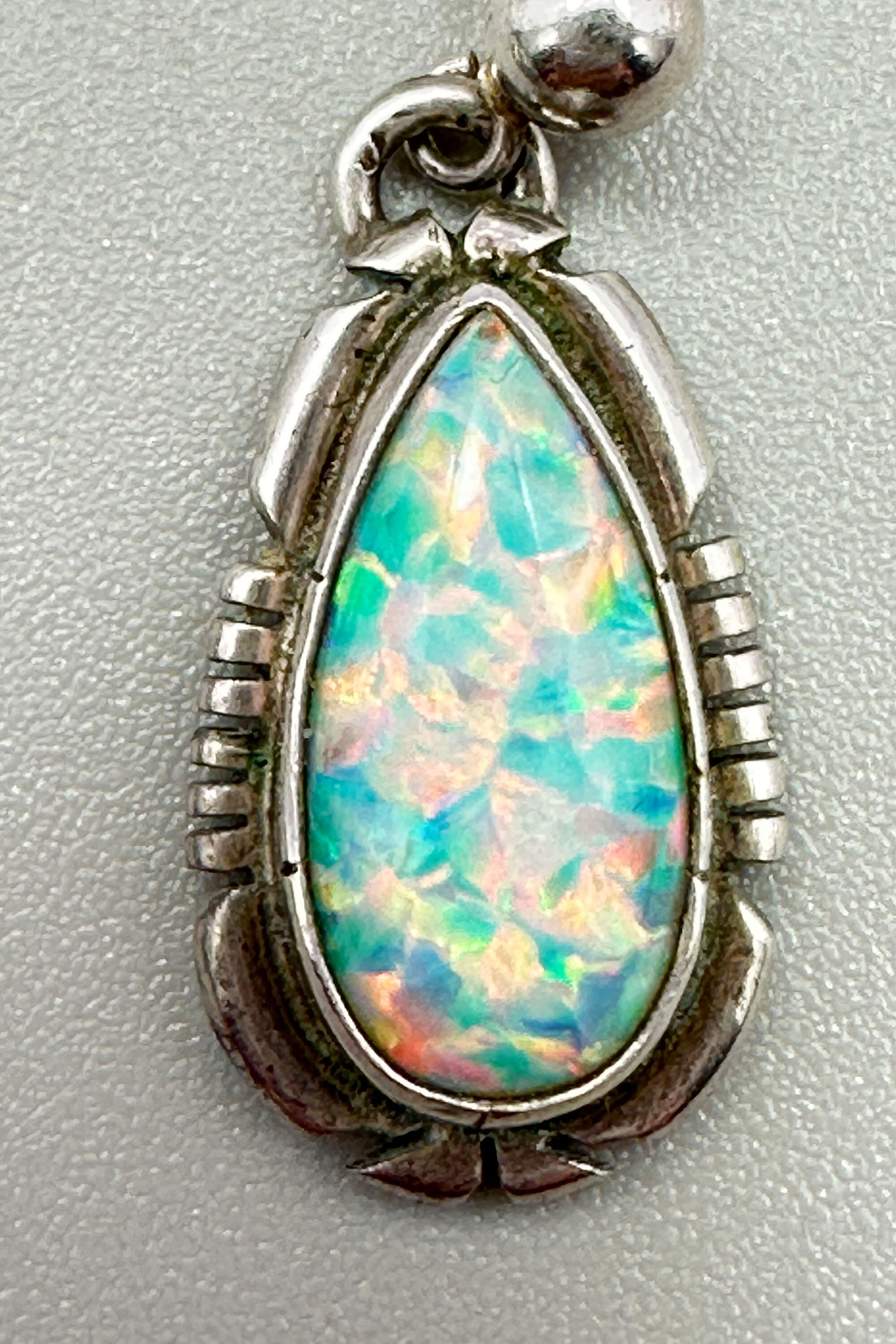 This is a very rare pair of earrings that are set with large pear shaped opals from the Spencer mine in Idaho. They are set in a typical Native American setting, most likely Zuni. They are marked Spencer Sterling to indicate the origin of the opals.| Size: | Opals are 15 x 8 mm |