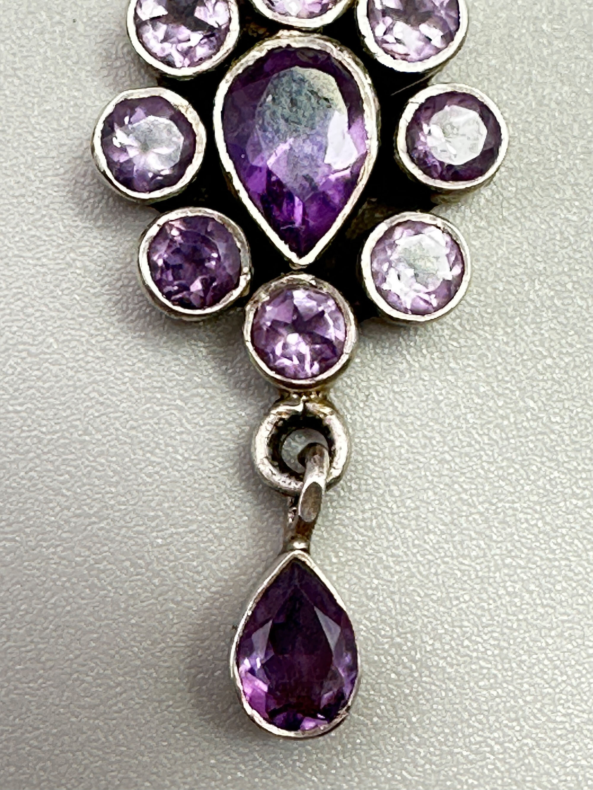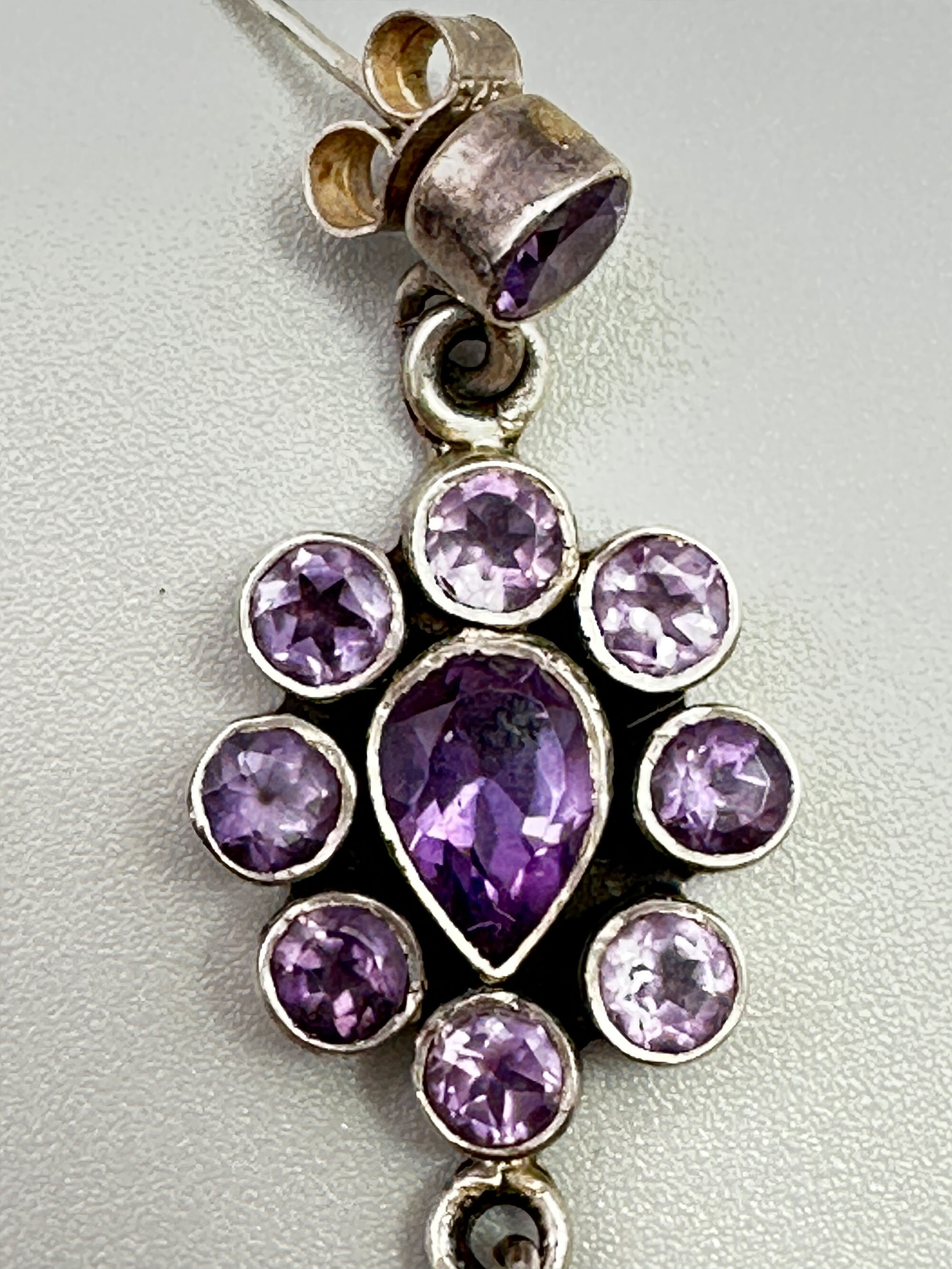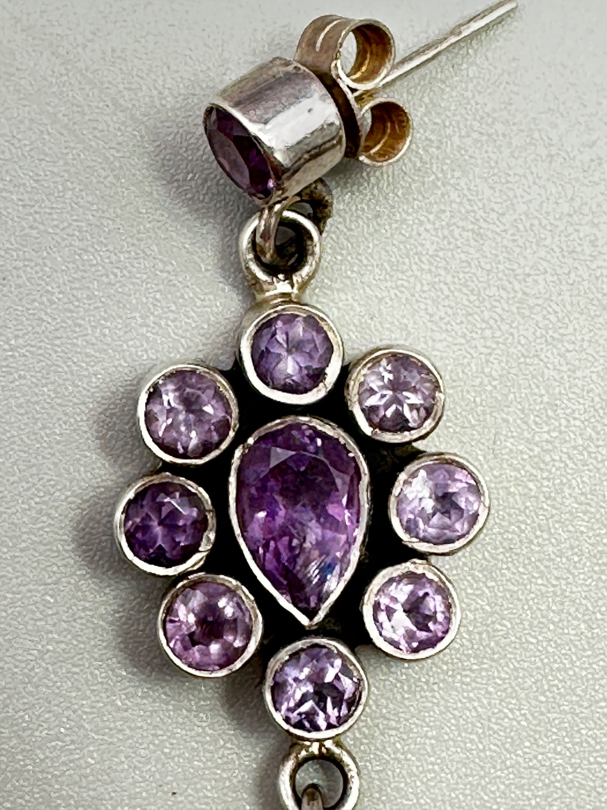 This a quite indricate paid of earrings bezel set with 11 amethyst stones. The stones are great quality with lots of sparkle. They are post and butterfly and are marked 925. They are most likely Indian in origin.| Size: | 47.4 x 17.3 mm |