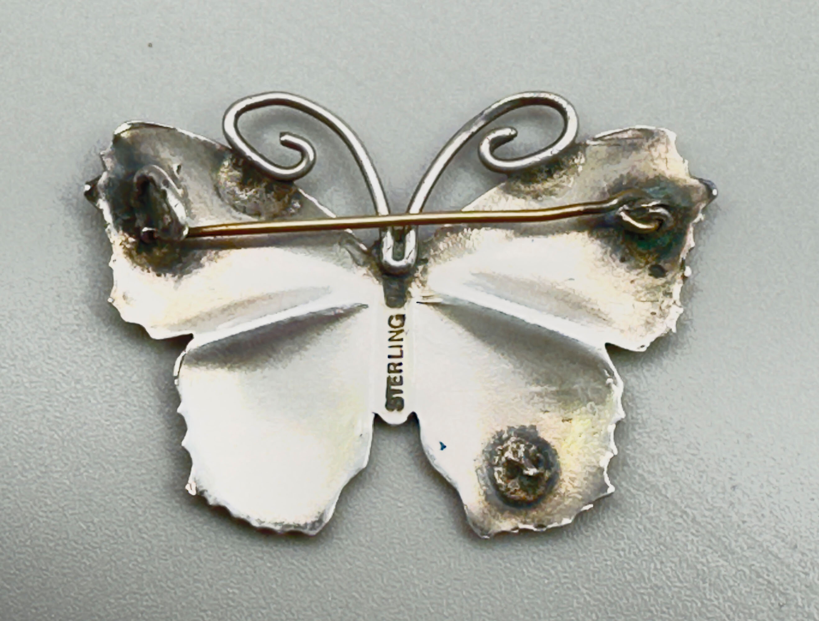 This is a very lovely quality guilloche enamel butterfly brooch in pink, yellow and lavendar. It is from Norway and can be attributed to Hroar Prydz but it is not marked with his mark so it could be from another workshop. This design was very popular so there would have been those who made similar designs. It is marked Sterling.| Size: | 44.2 x 29.8 mm |