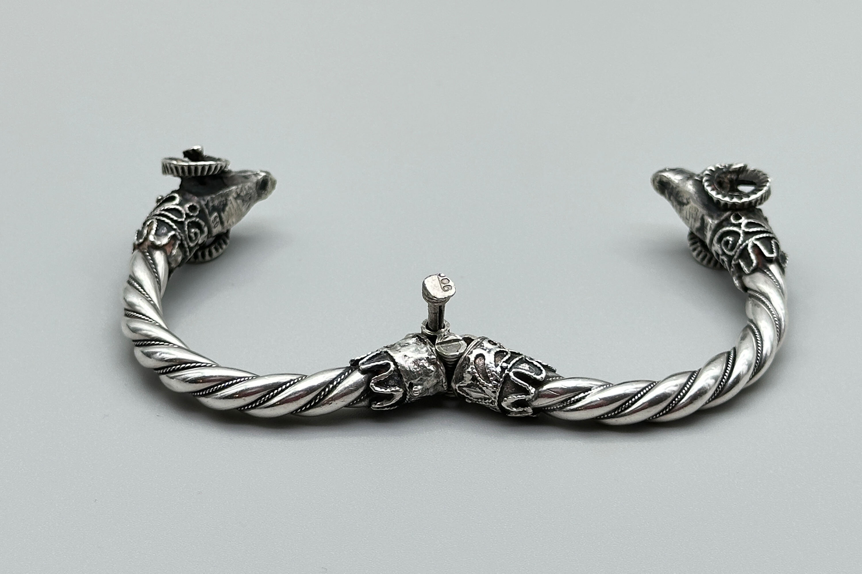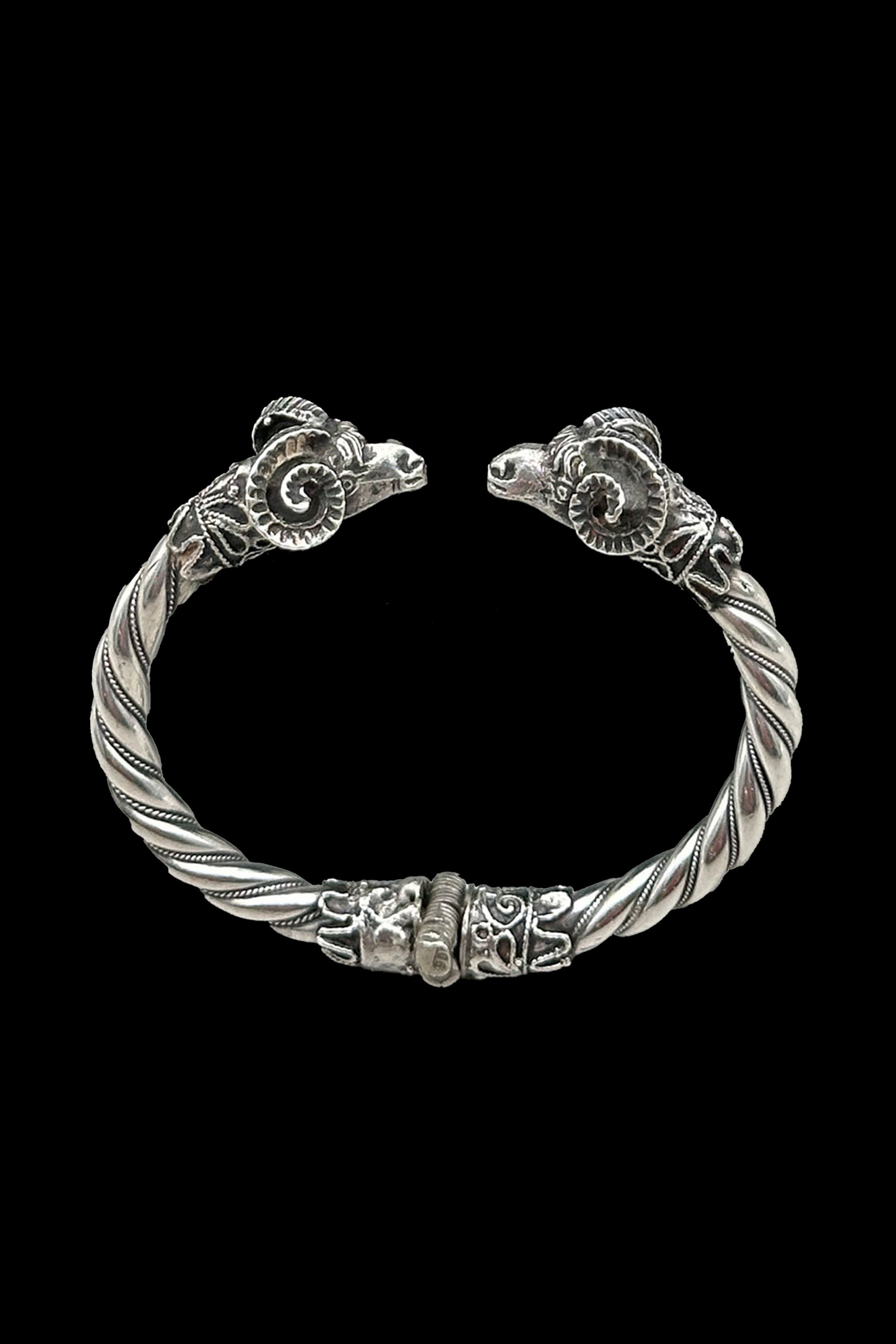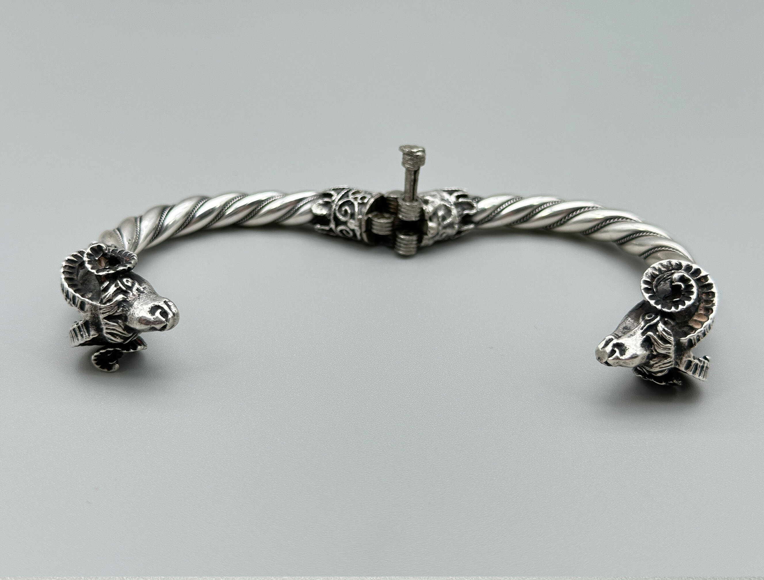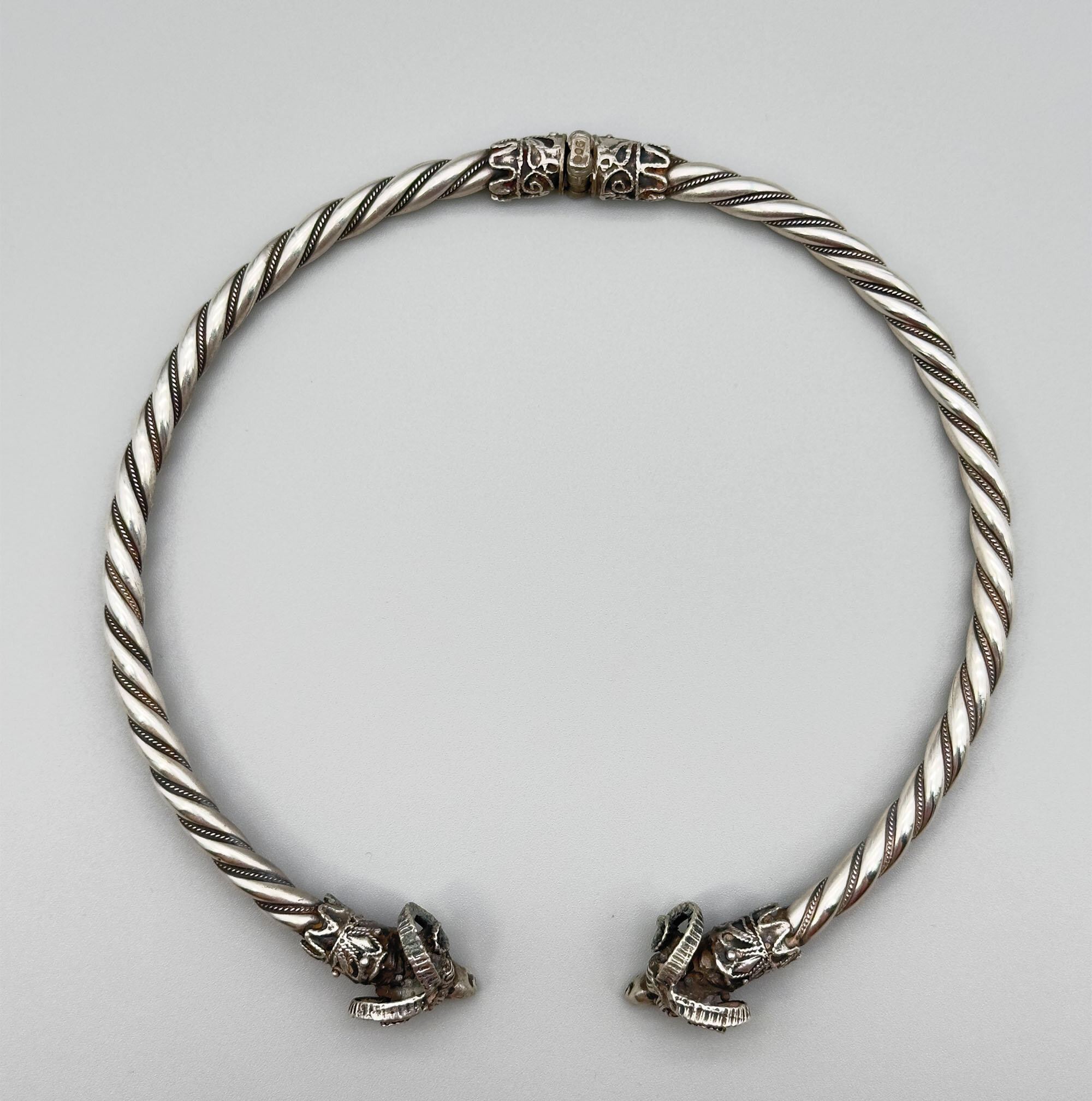 This is a very rare set of a necklace and bracelet that is Indian in origin. It is very heavy and has a twisted design with dual rams’ heads. The rams’ heads are very detailed, and this quality continues throughout both pieces. Both have a very strong bolt type clasp that allows the two pieces to open and then it is locked in place. The clasp mechanism is crafted from iron and not silver. This is to ensure that it remains strong and in position. This design is very well known in many cultures but is probably best known in Greek and Etruscan jewellery. These pieces might have been commissioned and were most likely made for a man. The size fits both genders but it is so chunky that it doesn’t seem likely to have been made for a woman during the 1920s. They would look great on anyone today!| Size: | Ram's heads measure 20.3 mm wide and 30.6 mm long, shank measures 6.6 mm wide, necklace measures approx 50 cm, bracelet measures approx 18 cm |