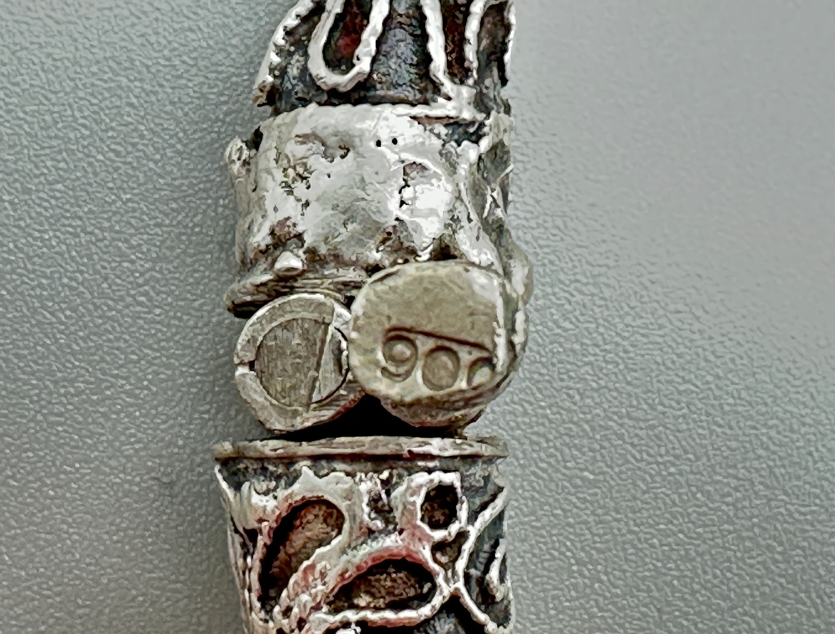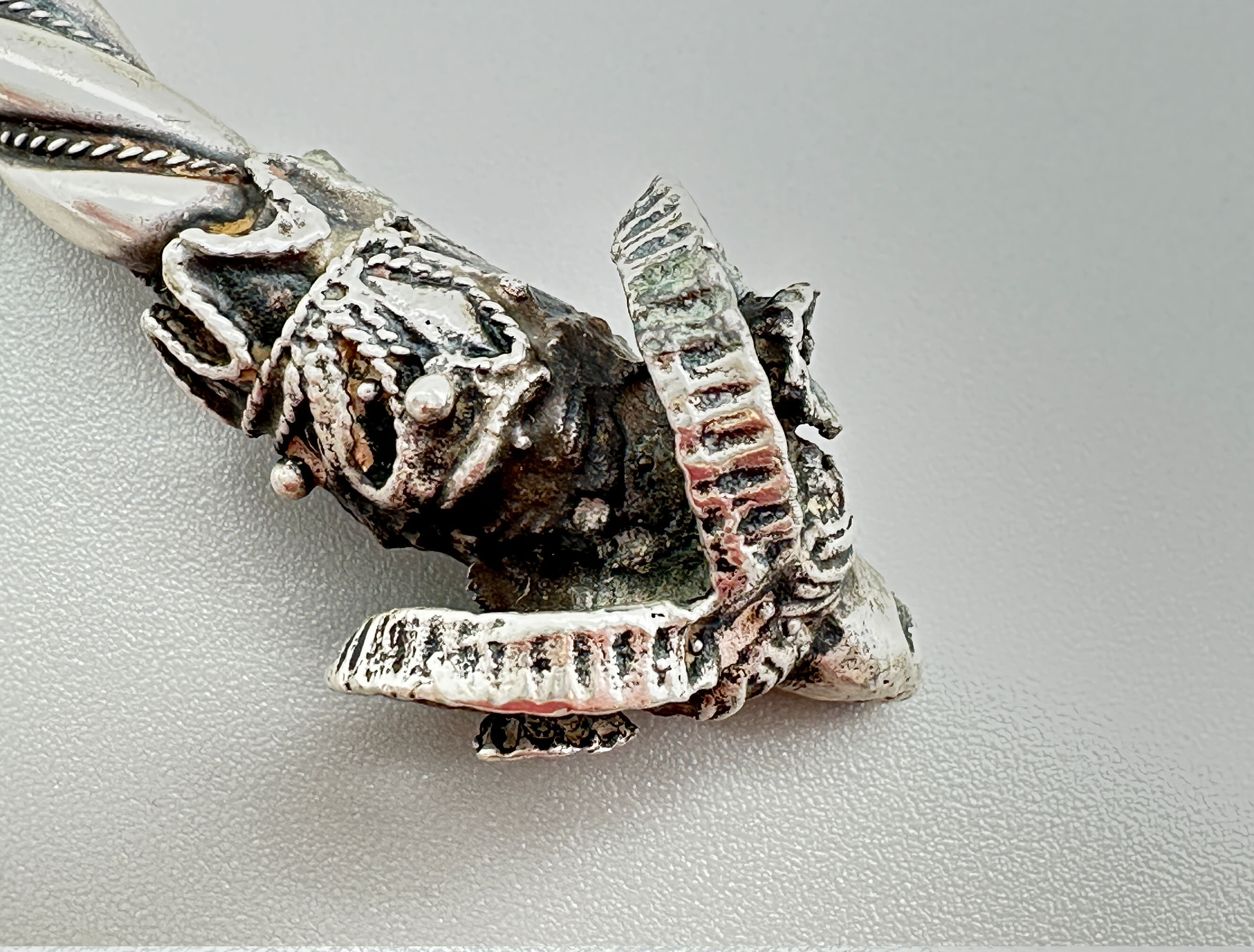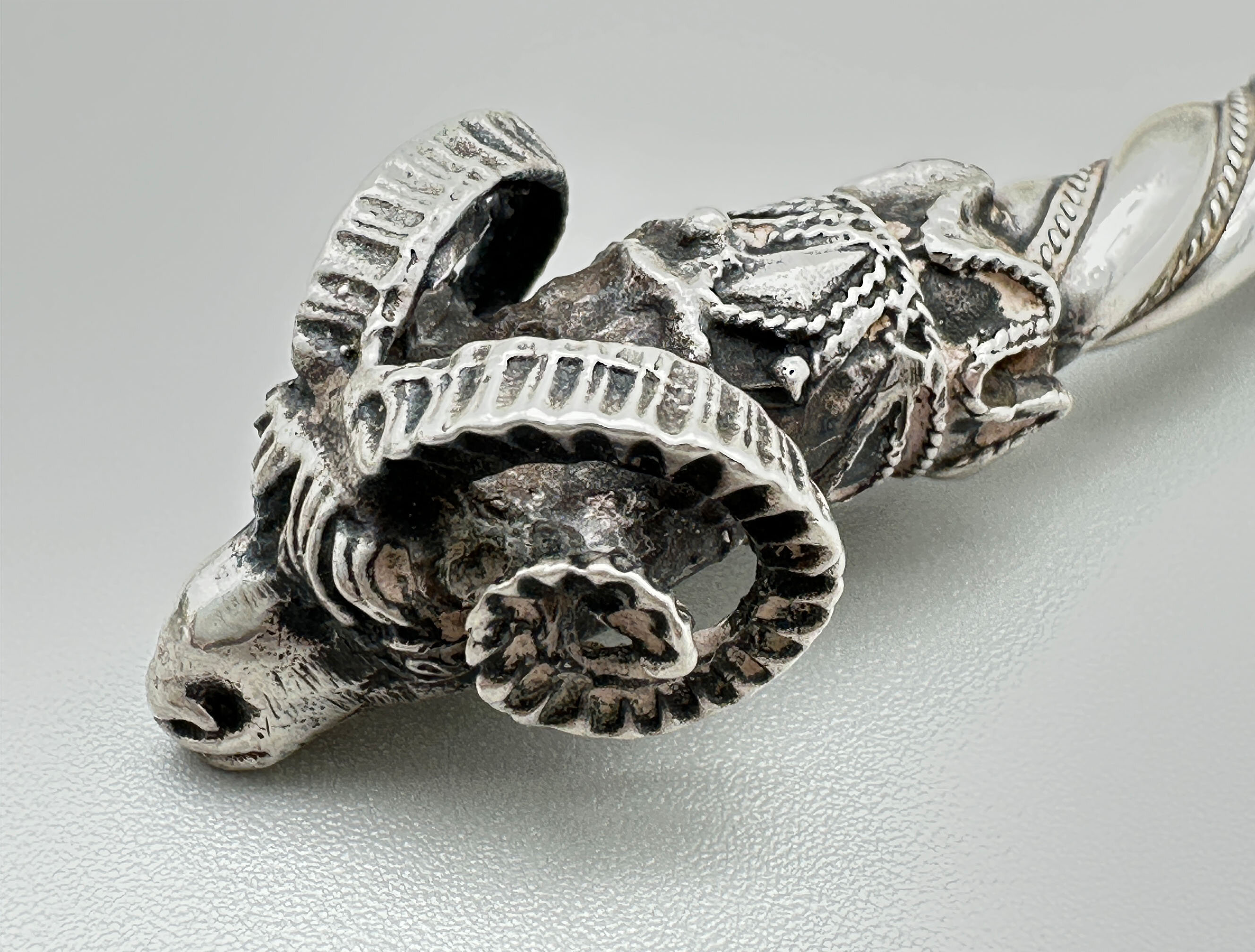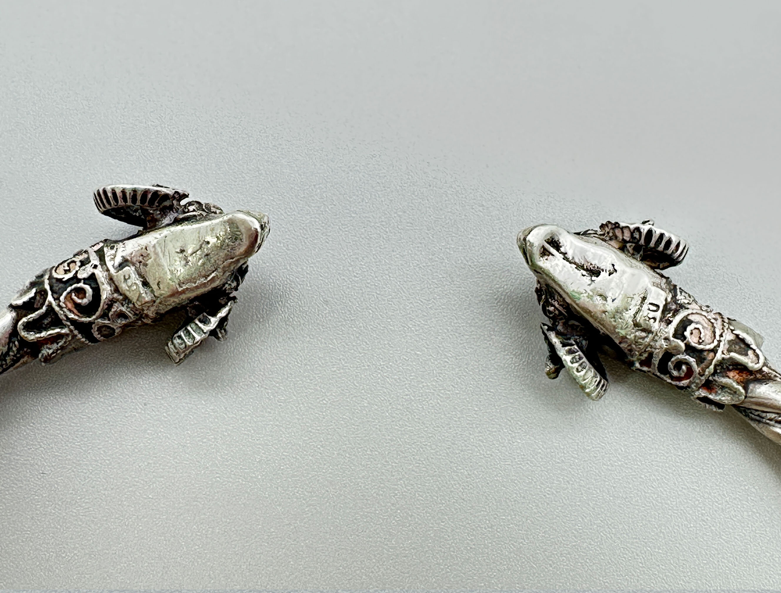This is a very rare set of a necklace and bracelet that is Indian in origin. It is very heavy and has a twisted design with dual rams’ heads. The rams’ heads are very detailed, and this quality continues throughout both pieces. Both have a very strong bolt type clasp that allows the two pieces to open and then it is locked in place. The clasp mechanism is crafted from iron and not silver. This is to ensure that it remains strong and in position. This design is very well known in many cultures but is probably best known in Greek and Etruscan jewellery. These pieces might have been commissioned and were most likely made for a man. The size fits both genders but it is so chunky that it doesn’t seem likely to have been made for a woman during the 1920s. They would look great on anyone today!| Size: | Ram's heads measure 20.3 mm wide and 30.6 mm long, shank measures 6.6 mm wide, necklace measures approx 50 cm, bracelet measures approx 18 cm |