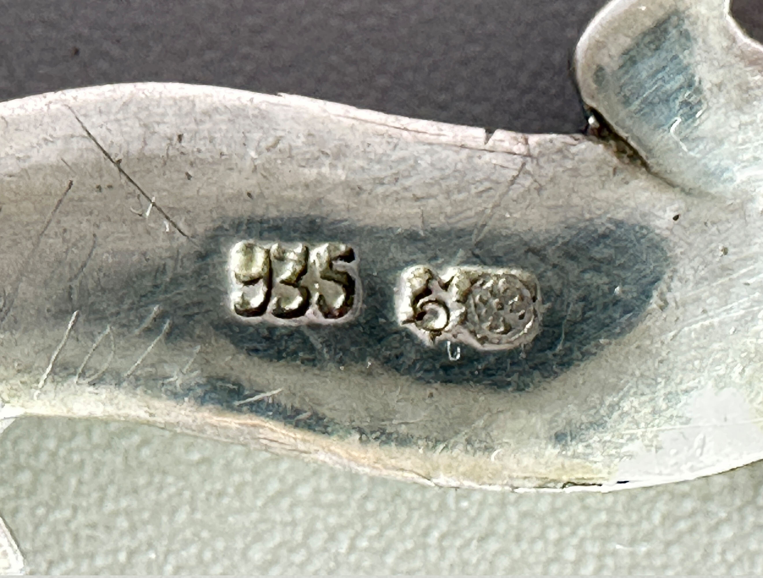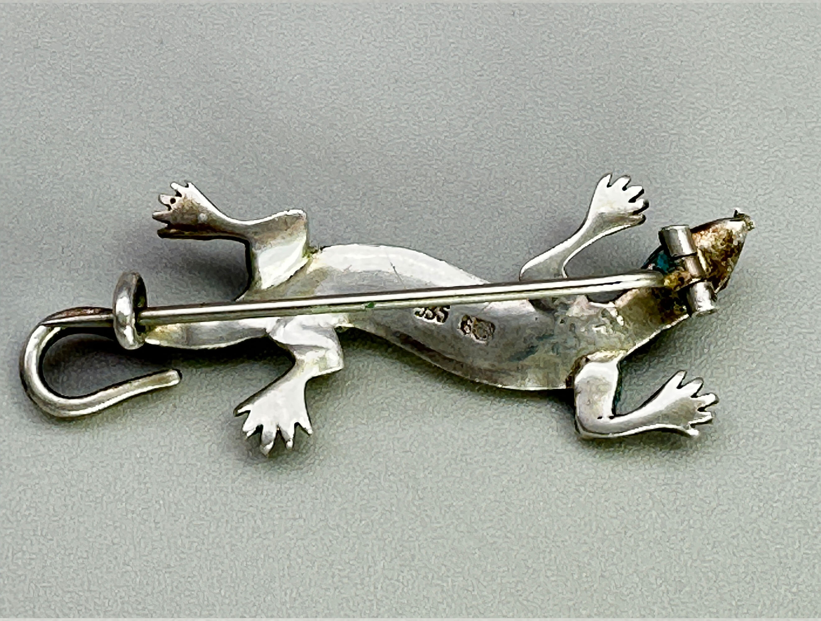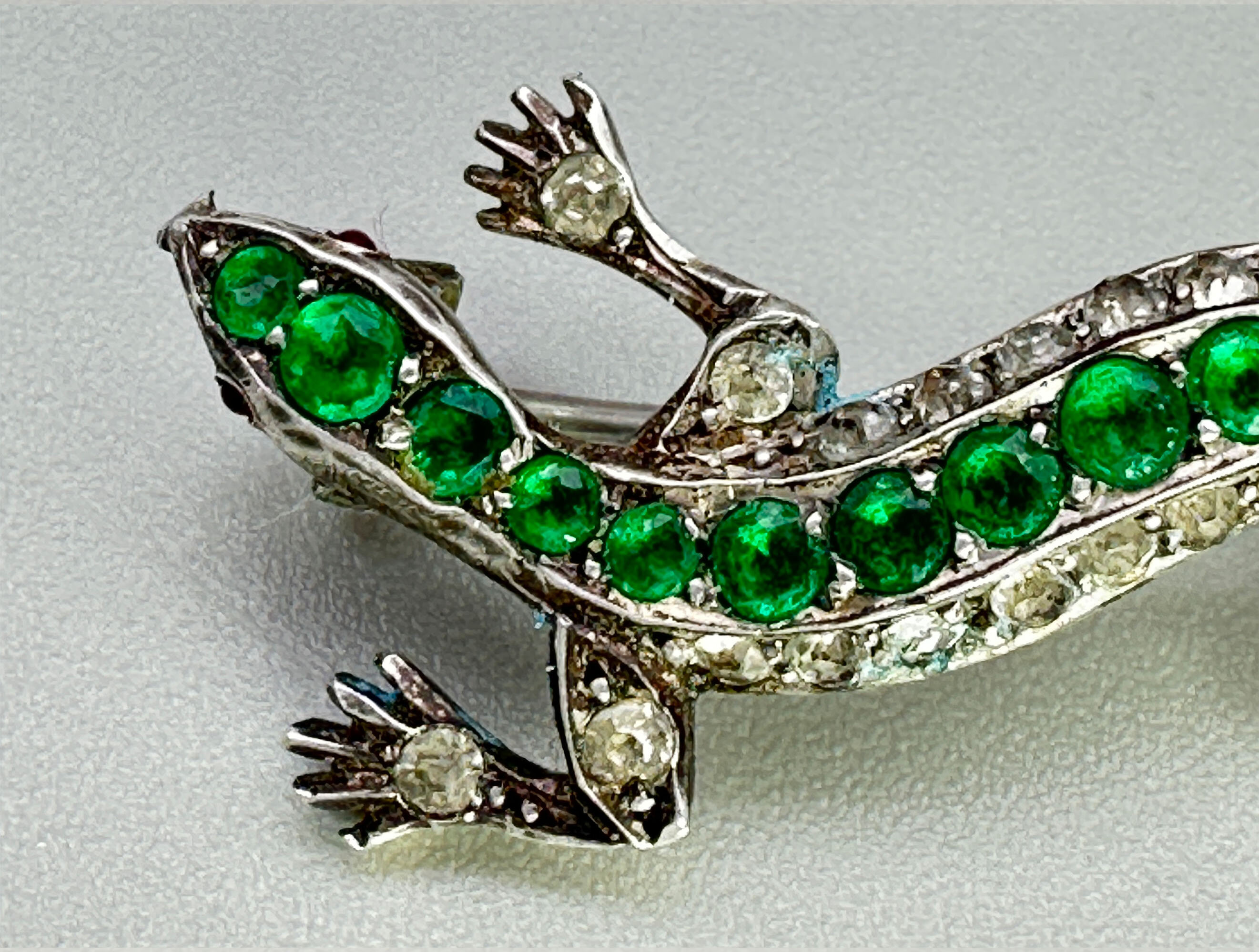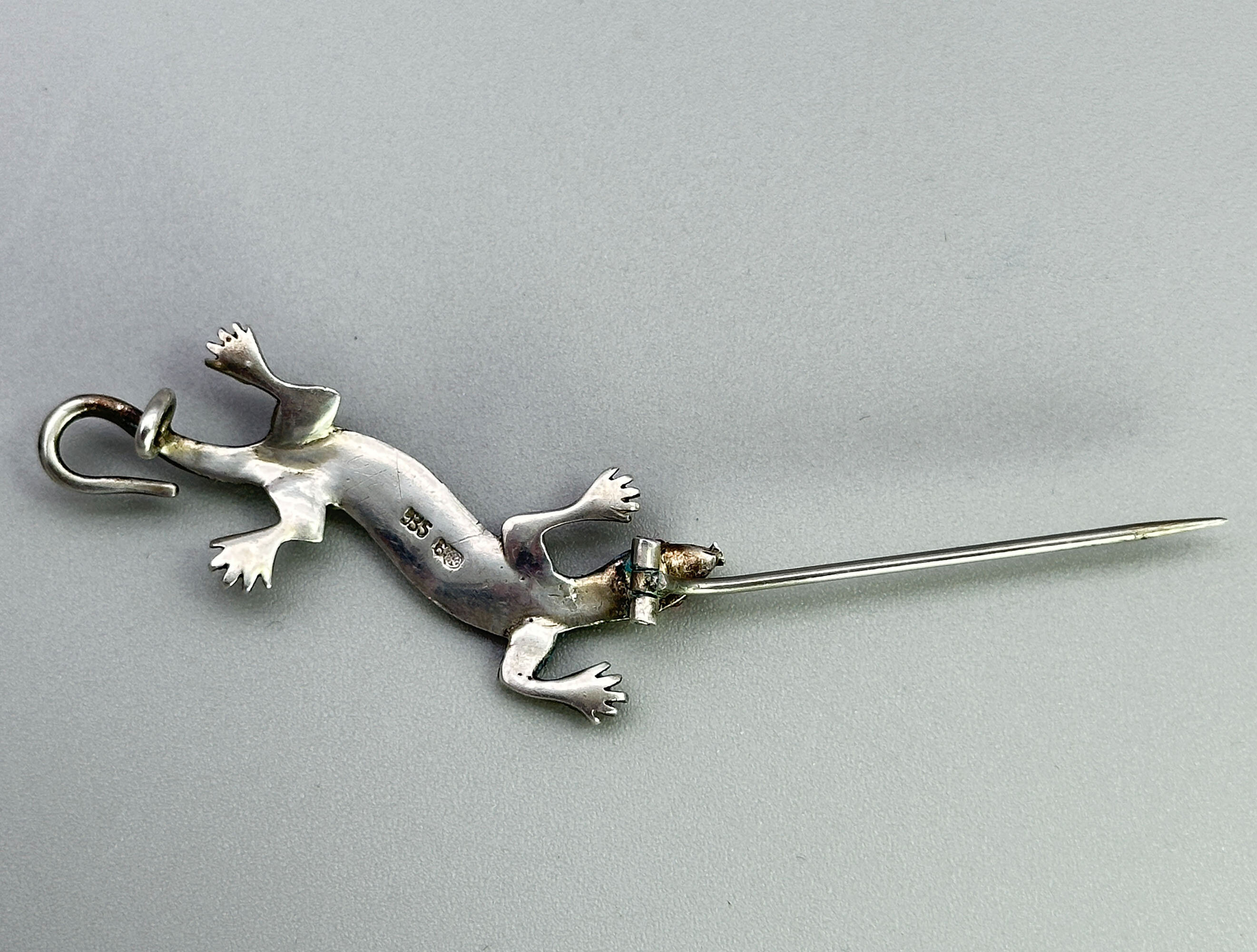 This is a very typical Victorrian brooch in the form of a lizard. It is set with pastes stones. It is marked 935 and there is a mark that looks like a wheel shape. It is continental, possibly German.| Size: | 46 x 14 mm |