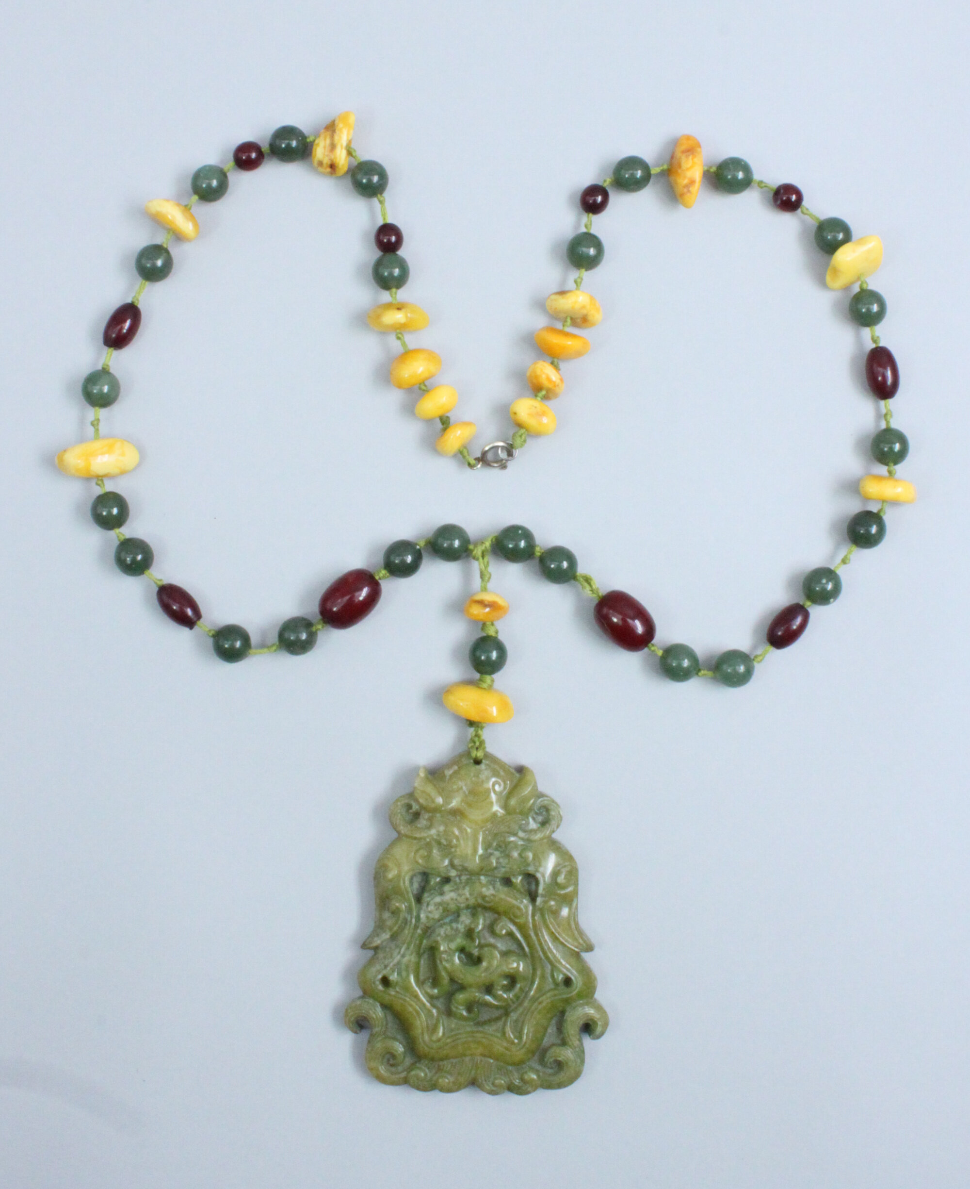 Constructed necklace with jade, egg yolk amber and cherry amber, C20th