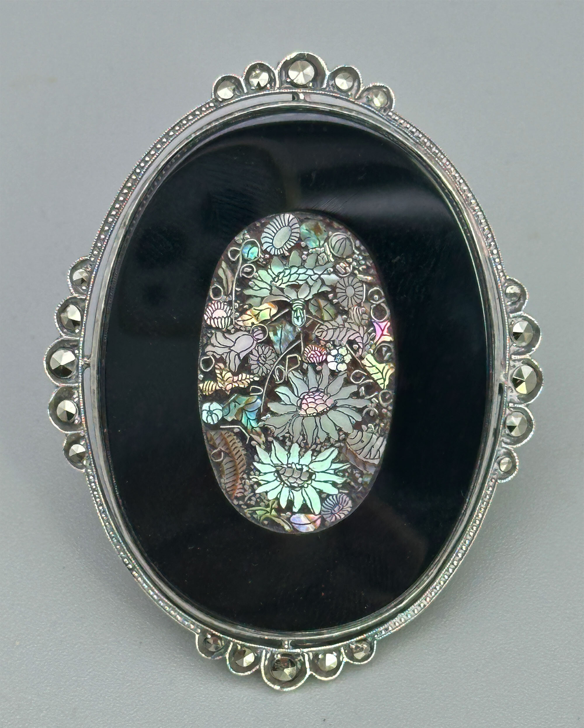 Art Deco brooch with Shibayama style mother of pearl plaque c1920