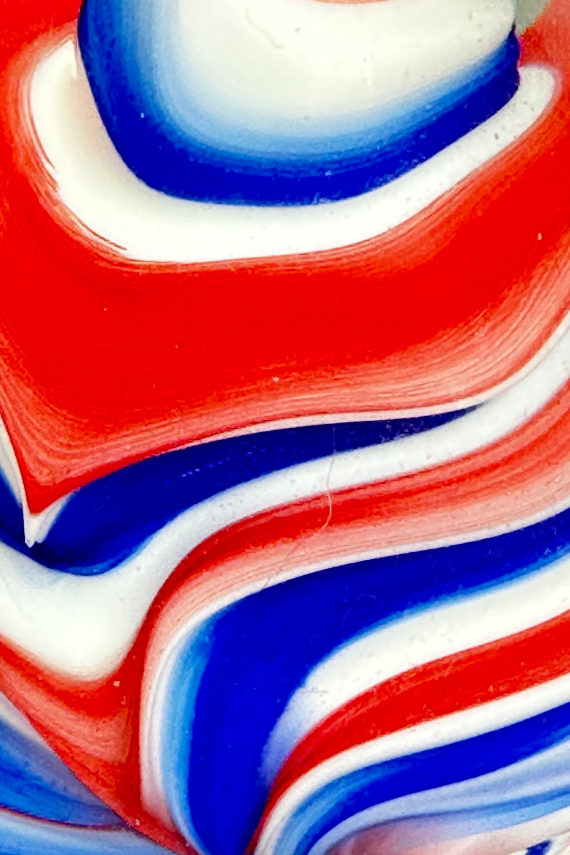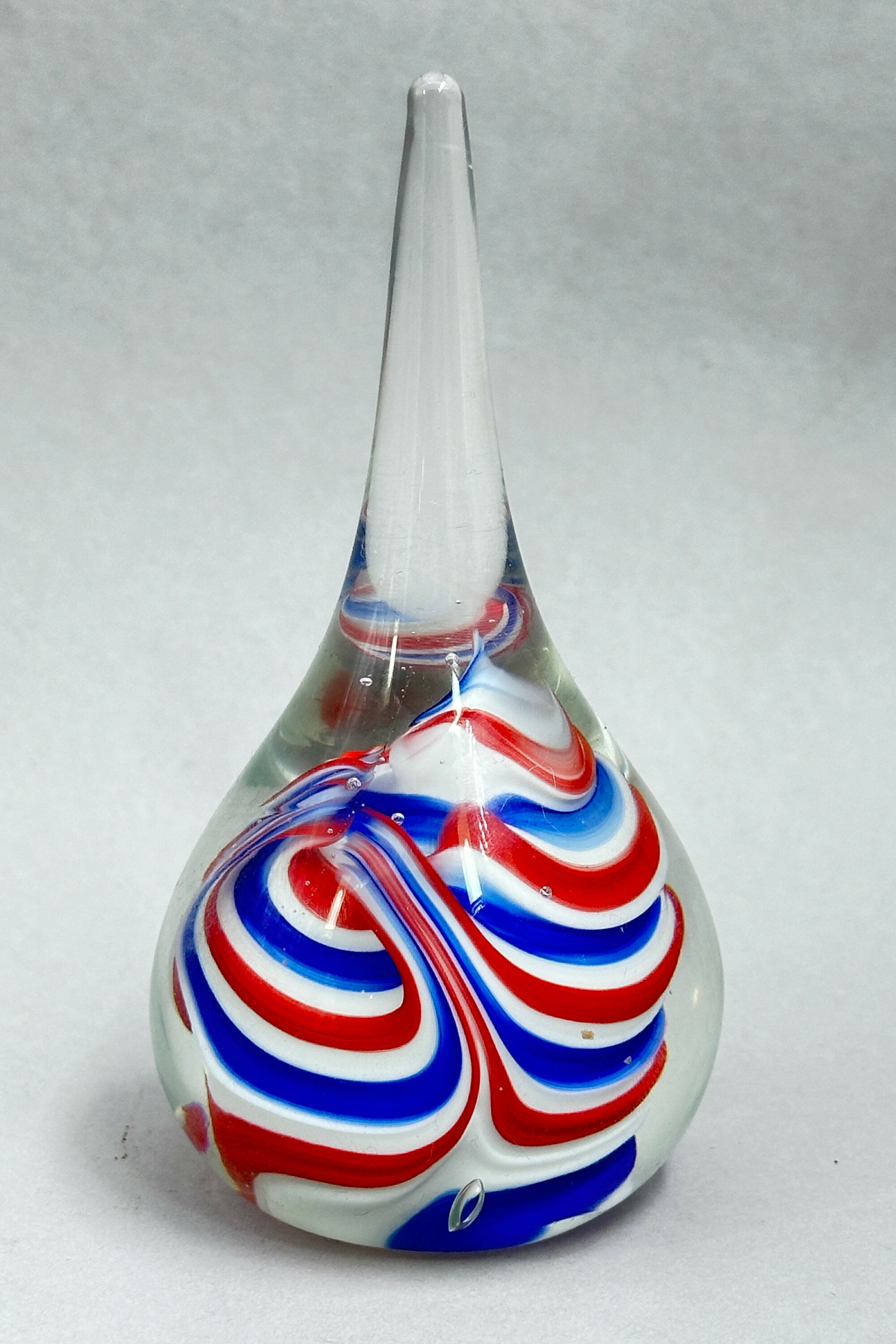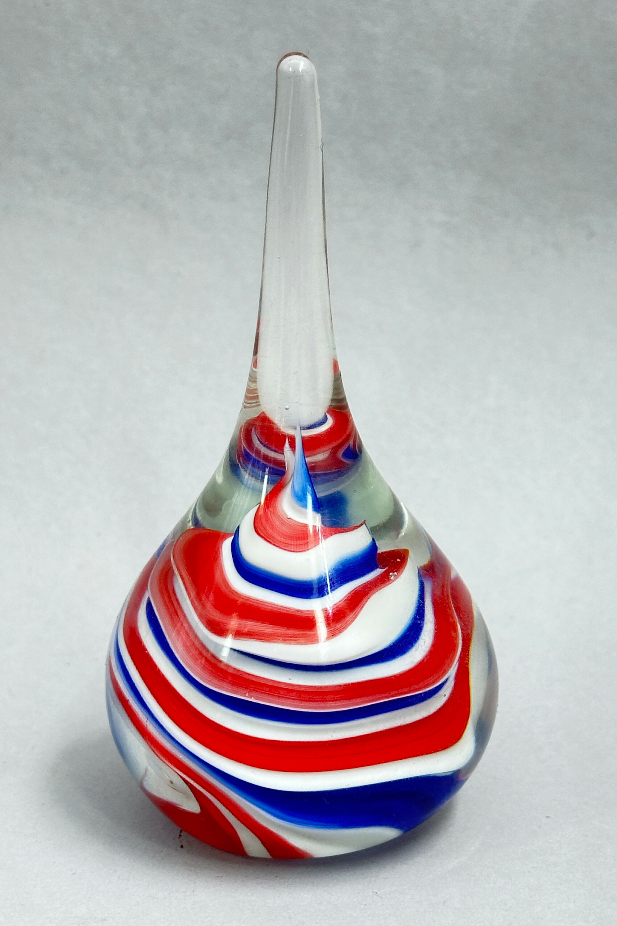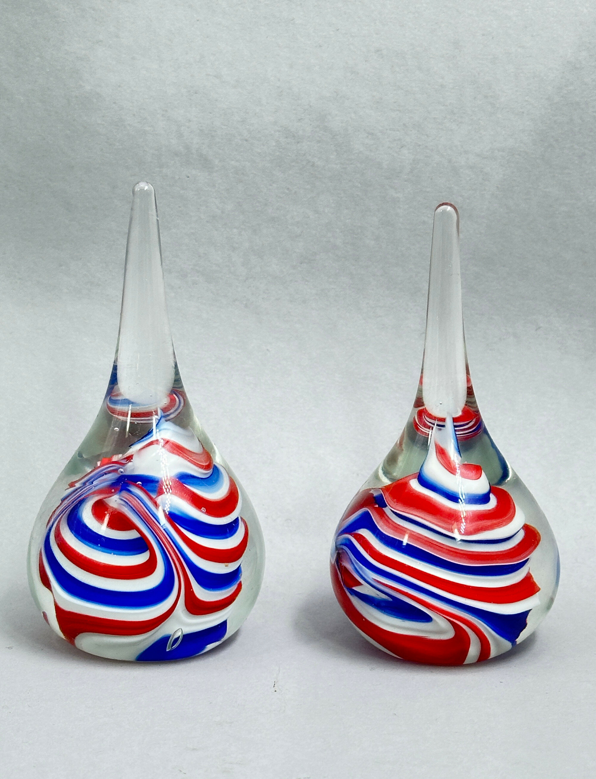 A pair of Glass Vases of bottle form the pear shape bodies rising to slender necks, each decorated in a complimentary design of swirling ribbons in red white and blue, the bases with a clear smooth slightly irregular circular foot. While obviously with decorative appeal the weight and form of these pieces suggest that they might also have been intended as paperweights. Similar pieces, but with slightly different decoration were made by the Selkirk Glass factory in Scotland and bear their paper label and the provenance of this pair of vases is most likely the same. The business was set up by Peter Holmes and Ron Hutchison in 1977. Peter Holmes left in 2002 and Caledonian Investments bought it in 2004 but the firm was finally closed in 2006.Size: | Ht 11.5cm and 12cm, Max Width 6cm |