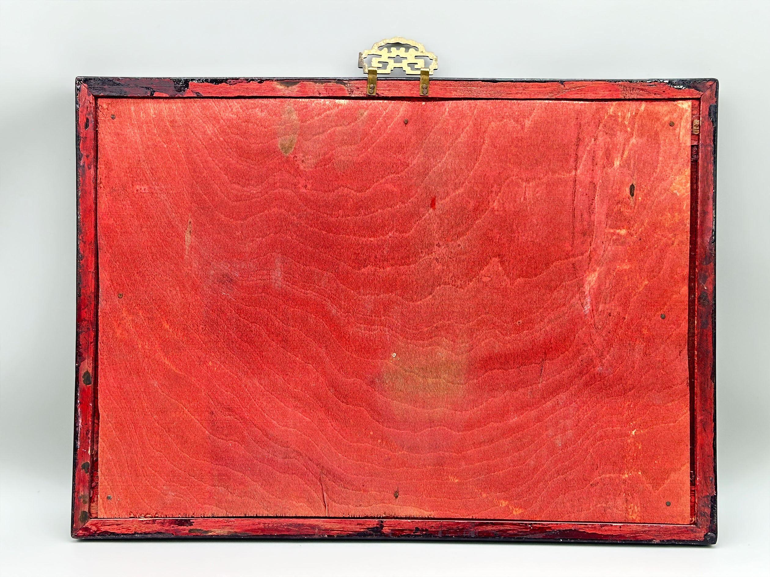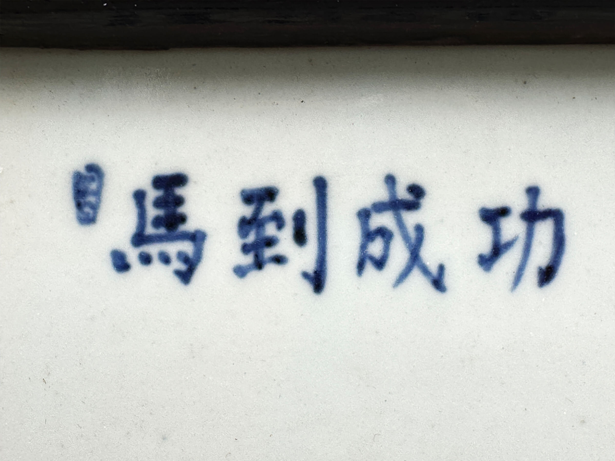 A Chinese porcelain plaque decorated in underglaze blue with underglaze copper red detail depicting two horses galloping across a field with rocks, two calligraphic inscriptions to the top left. The theme of two horses in Chinese tradition refers to harmony, partnership, and swift success. They are associated with the motto ‘Ma Dao Cheng Gong’ (馬到成功), which translates ‘horses arrive, and with them success’ and the characters of this motto are contained in the left of the two calligraphic inscriptions, the right hand inscription possibly containing the name of the artist. The style of the drawing very loosely resembles that of the famous Chinese artist Wang Bu (1898-1968), known from many fine and original works by his hand but much copied by other porcelain painters in the twentieth century. The general effect of this piece and the flat mirror like finish to the tile itself suggest a dating to the Republican period (1912–1949) and the wood of the frame is not inconsistent with this. The scene here is not commonly found amongst porcelain tiles from this period and the addition of the underglaze copper red detail, again an unusual feature, indicates no small amount of care in the production.| Size: | Frame : 48.5cm x 35cm x 2.2cm Plaque (measured within frame) 36.2cm x 22.8cm |