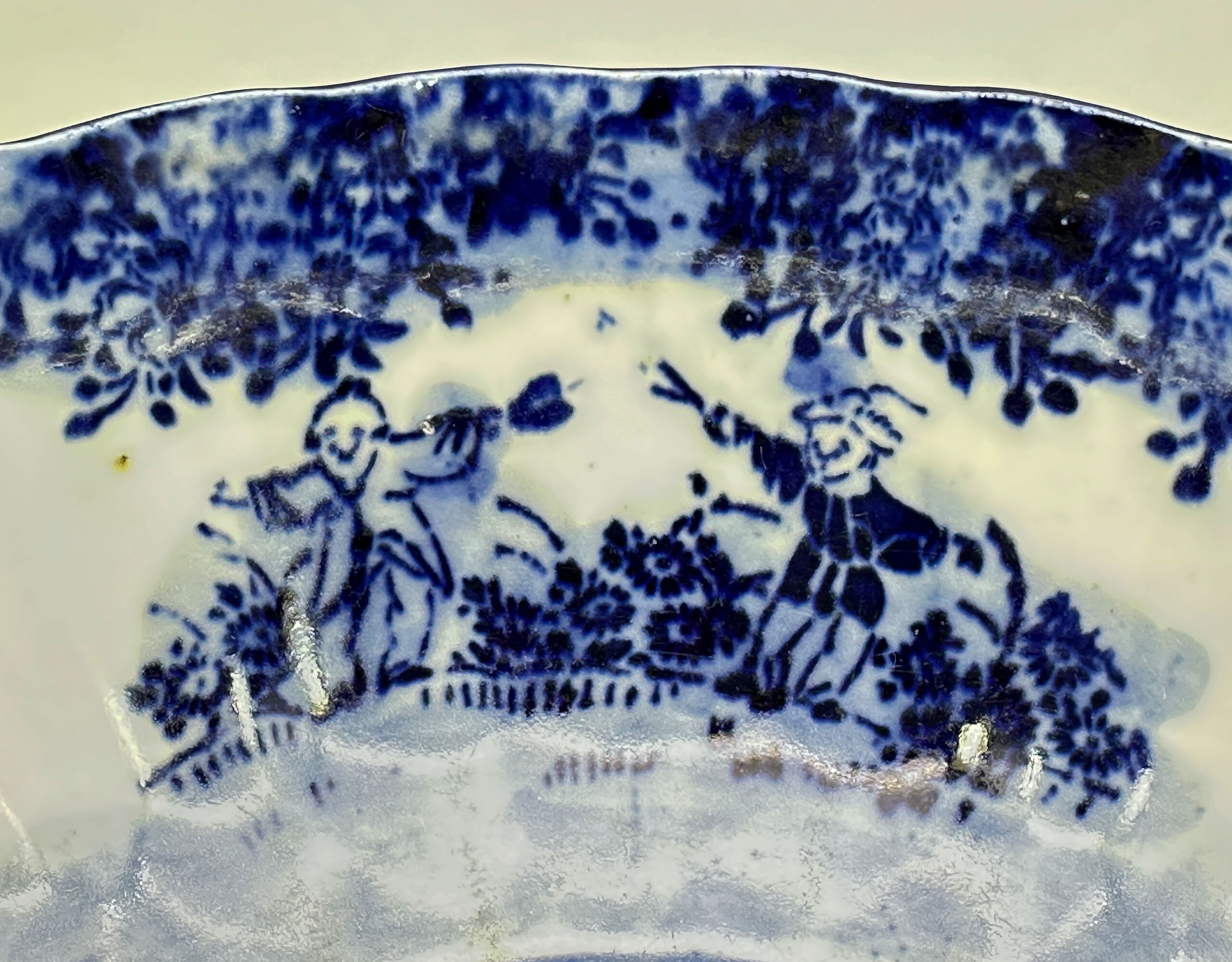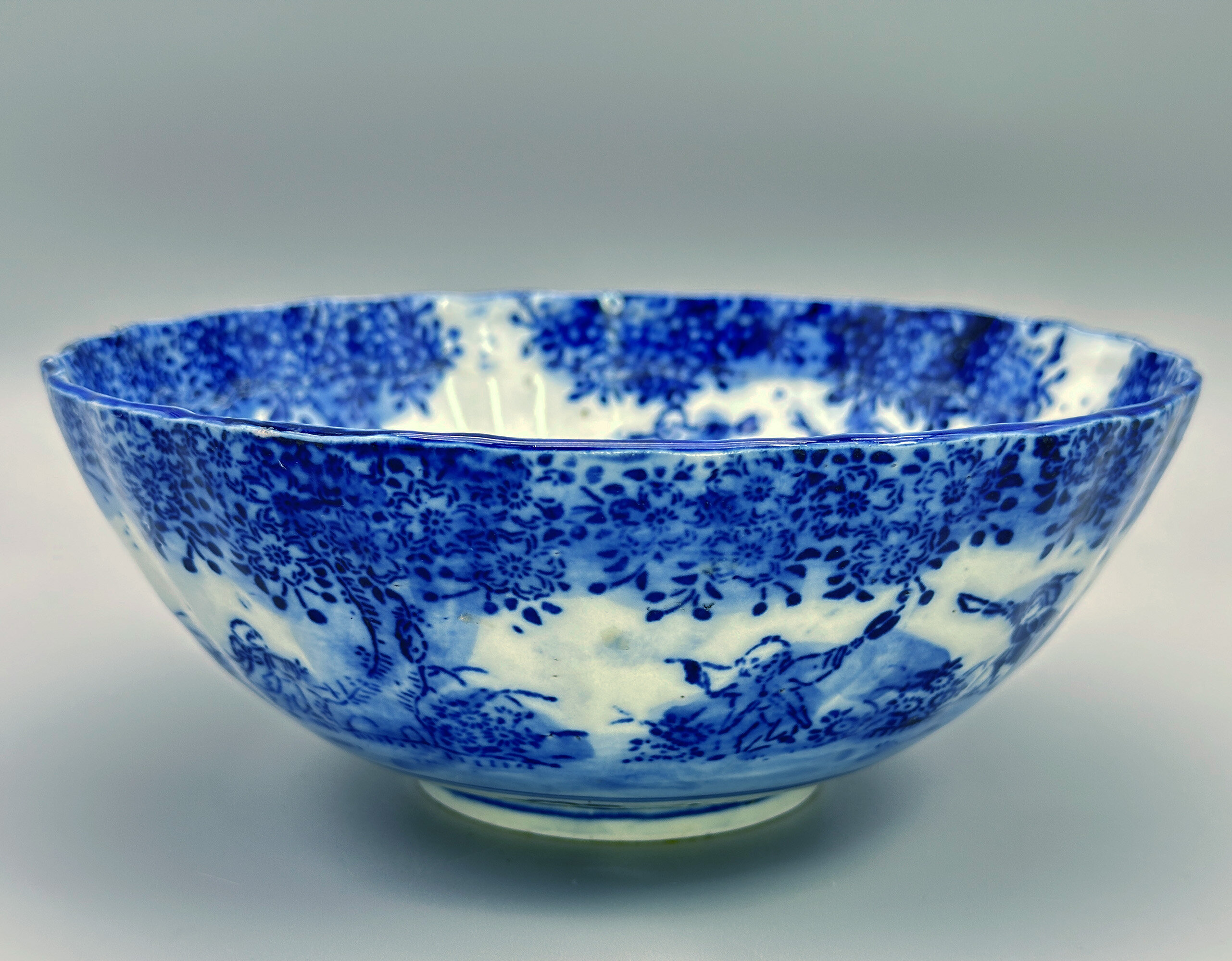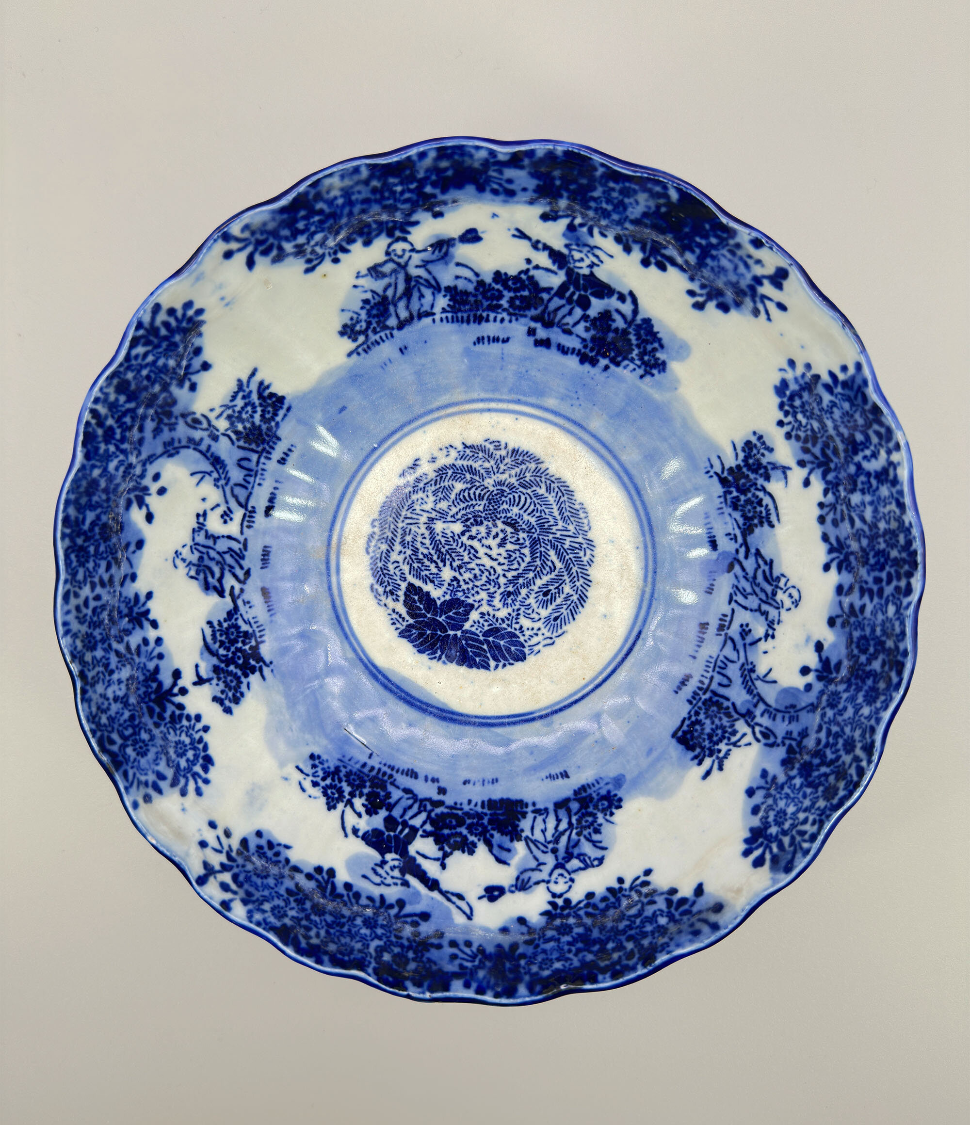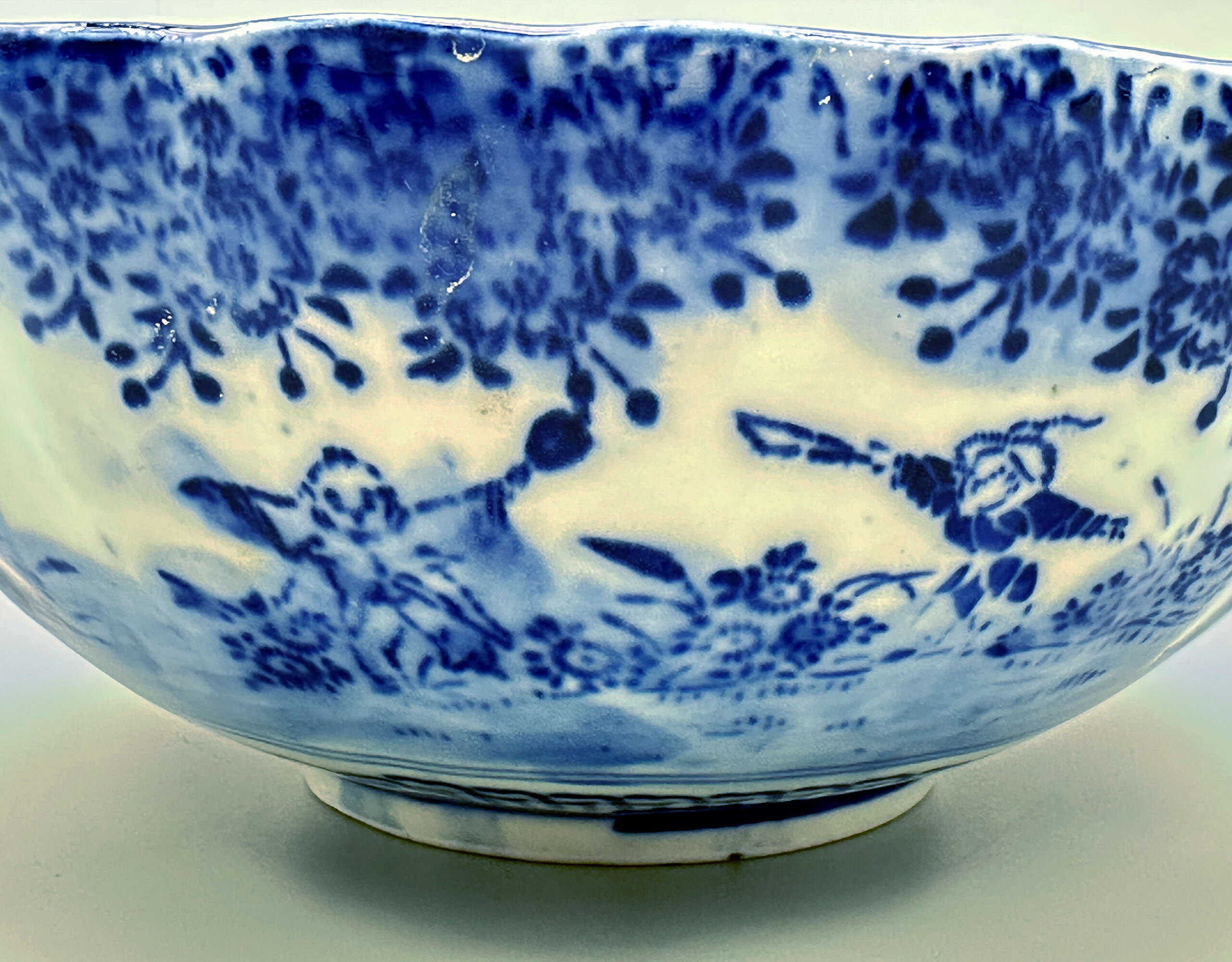 A Japanese bowl the sides curving inwards to the short foot and the rim faintly lobed, decorated in underglaze blue with boys playing in a stylised garden scene below a floral border, the centre interior with a medallion of a ‘ho ho’ bird and leaves. The work here could be termed ‘naif’ and this is due in part to the techniques of decoration which seems to employ stencilled designs rather than hand painted decoration. This can be seen most clearly in image (5). Many pieces in this style, both bowls and plaques, were exported to the West in the early twentieth century and were presumably cheap to purchase on their arrival. Most likely they were made at one of the kilns in the Arita district, the home of many workshops producing wares for export. This is not the grandest of the Japanese pieces made for the West but has a simple charm which can be enjoyed today, as when it was made, at an affordable price!| Size: | Diam 21.5cm, Ht 8.5cm, Base 8.3cm |