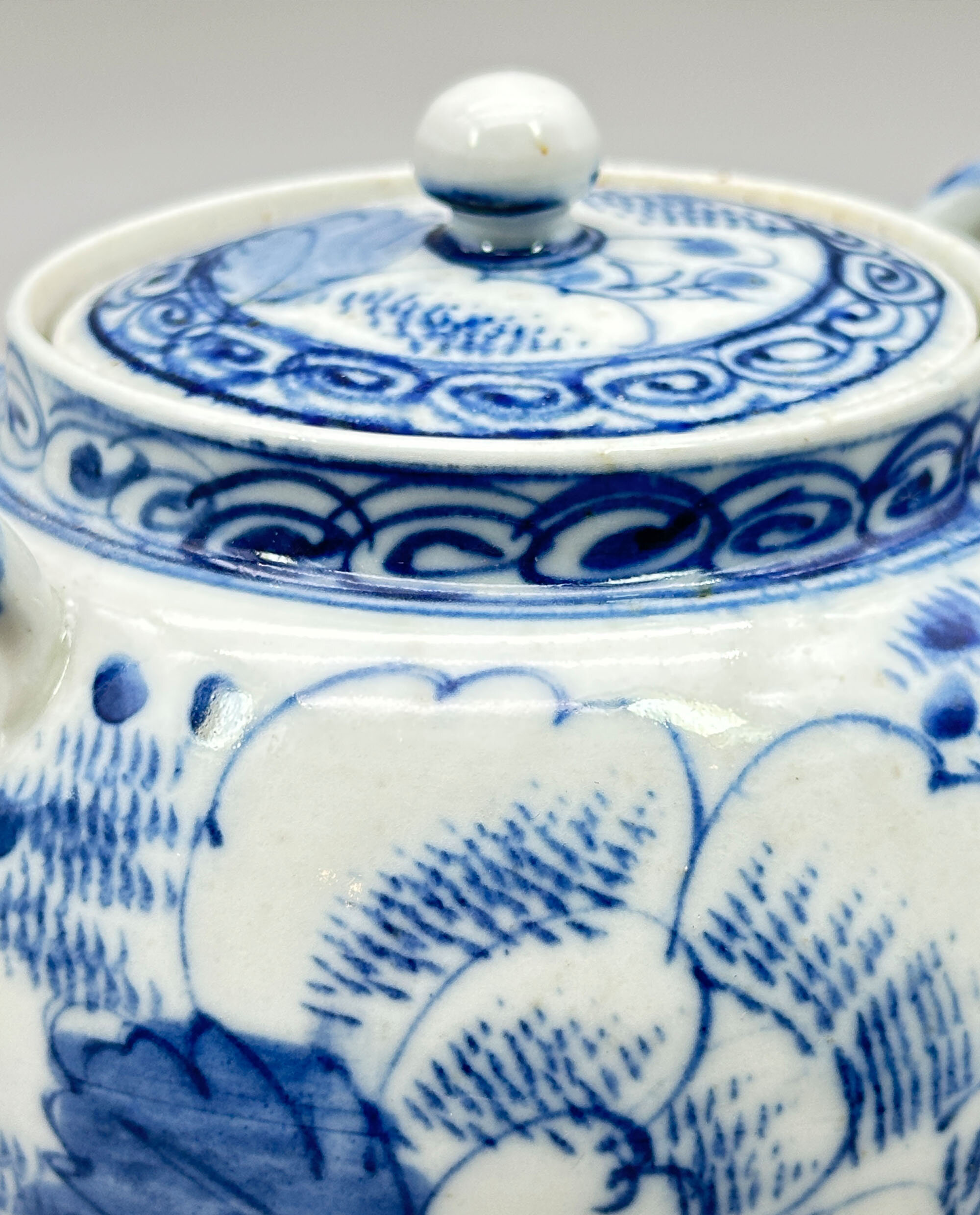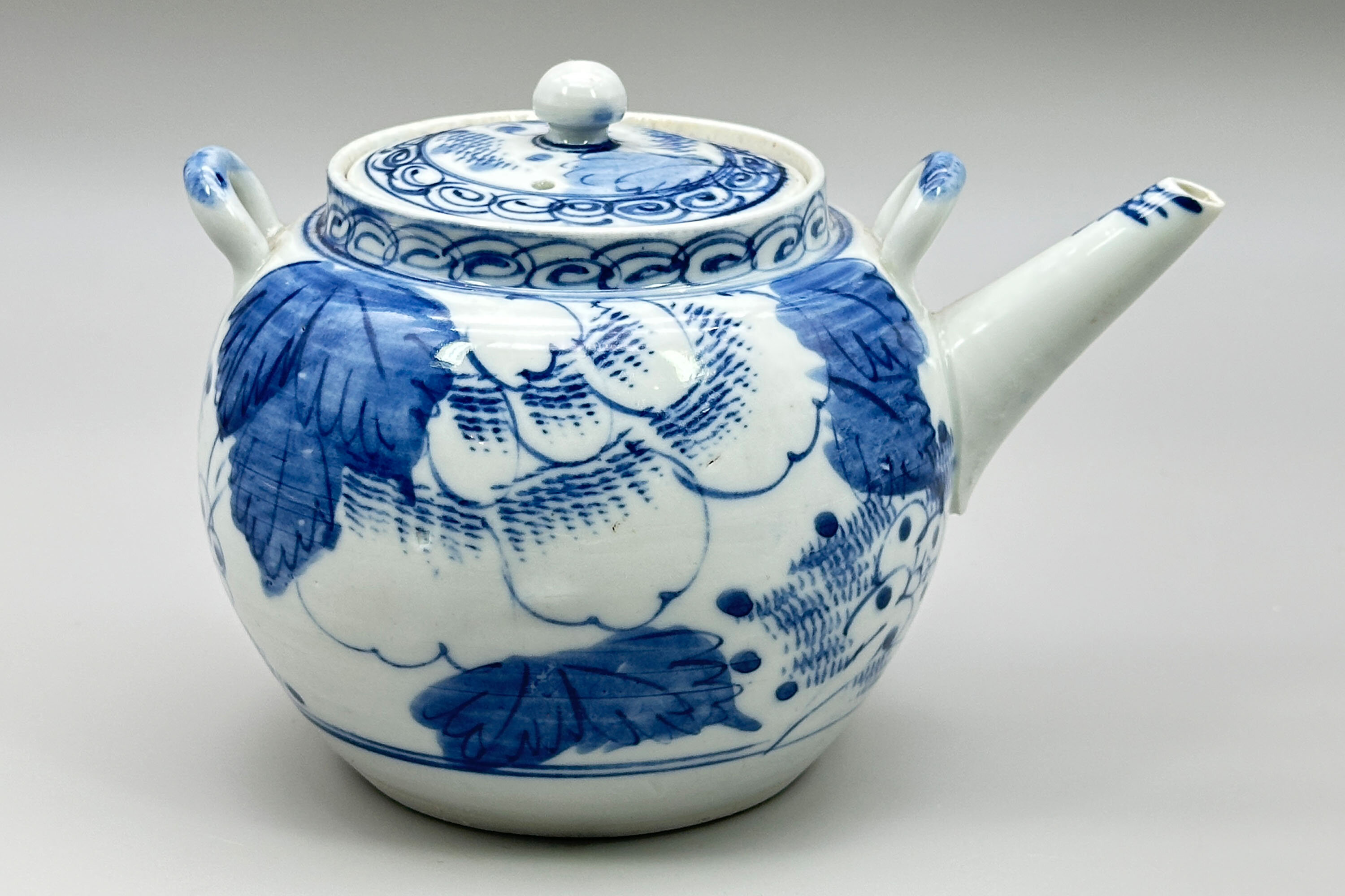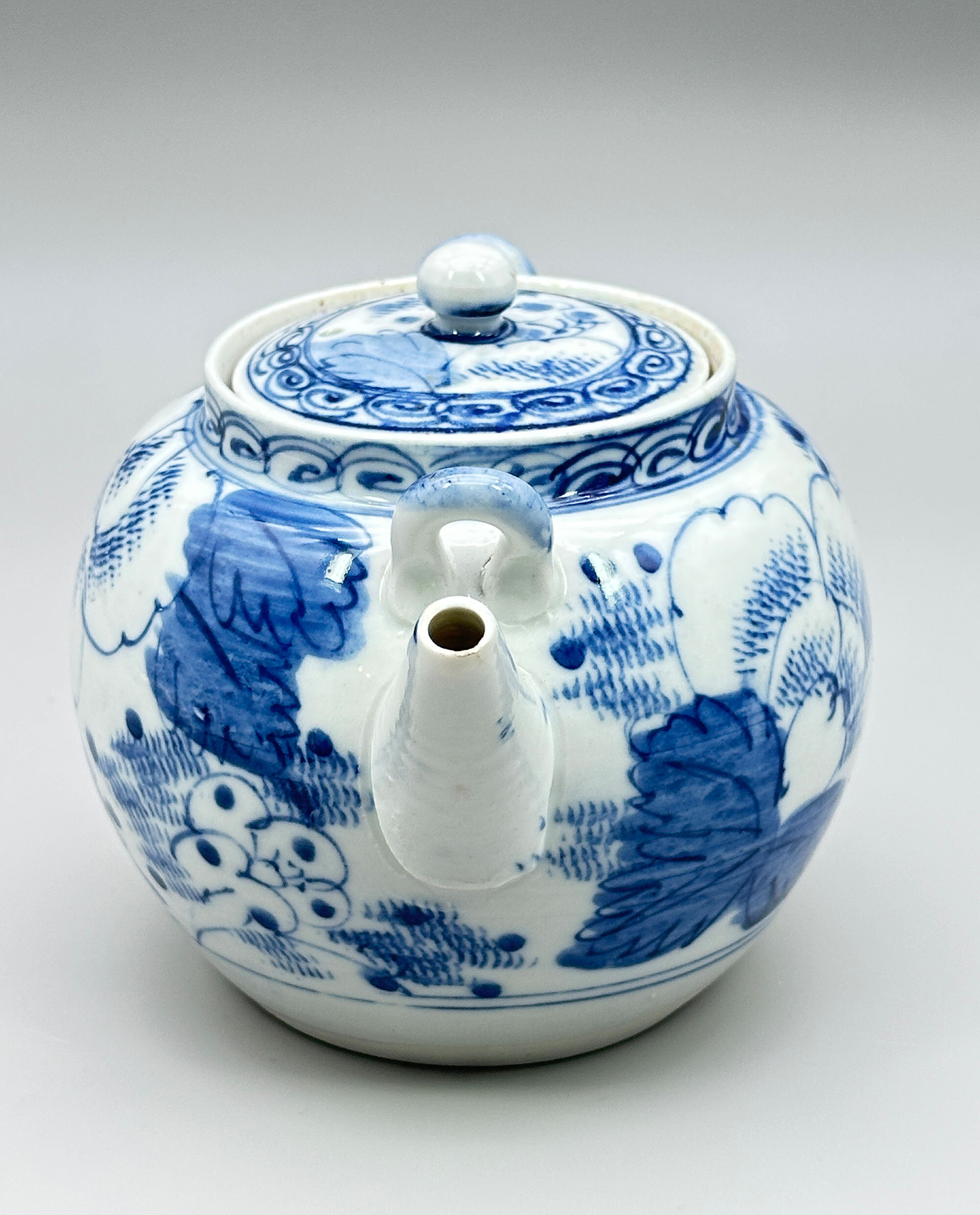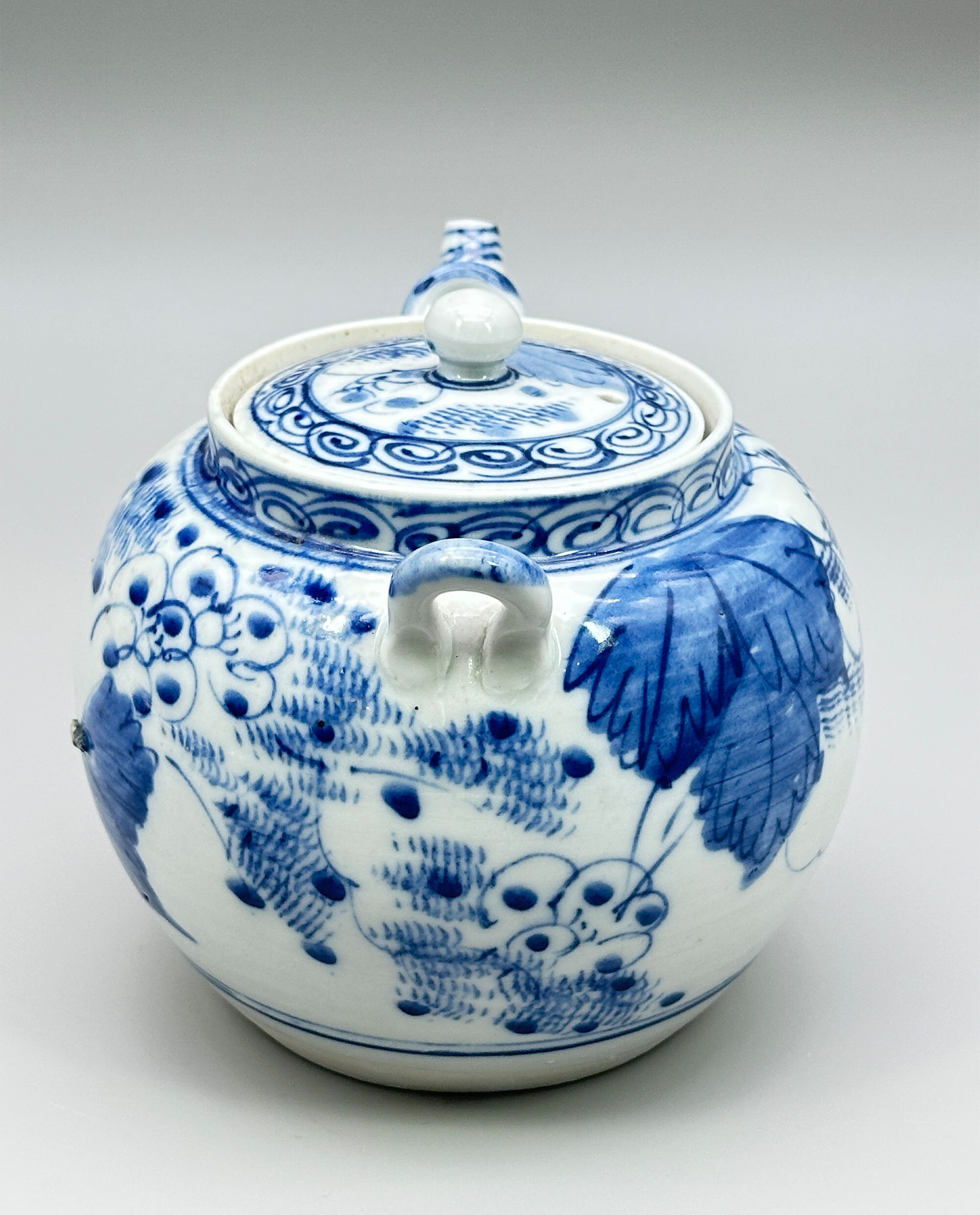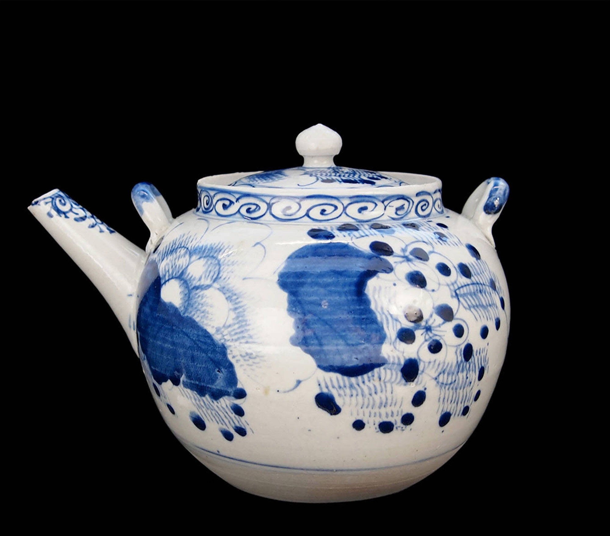 A Japanese ceramic teapot of globular form with a short upright rim and a slightly countersunk lid with a round knob, two lugs for the attachment of a carrying handle and a short straight angular spout, boldly decorated in underglaze blue and white with flowering peony, the rim and cover with a band of whorl pattern, the base flat and unglazed and the interior with a fitted liner or strainer of tapering conical form with a flat bottom and small pieced holes. A similar teapot can be seen in the collection of the University of Idaho (see image 13) where it is described as having been made at the Aizu-Hongo kilns in Japan, situated in the Fukishima prefecture. Teapots in this style were made in large quantities between 1885 and 1911 and many were exported to America appearing in export catalogues of the period. The addition of a liner or strainer is a most unusual feature for an Oriental teapot but was standard for these particular wares. The lugs would have been fitted with a bamboo handle making it easier to handle the piece with hot water inside. A practical design, but this teapot is rather more likely to be admired than used in the present day.| Size: | Teapot : Ht (overall) 12.5cm, Ht (base) 11cm, Width (max) 18cm, Depth (max) 13cm, Base diam 8cm Liner : Ht 6cm, Diam (top) 7.5cm, Diam (base) 4.5cm |