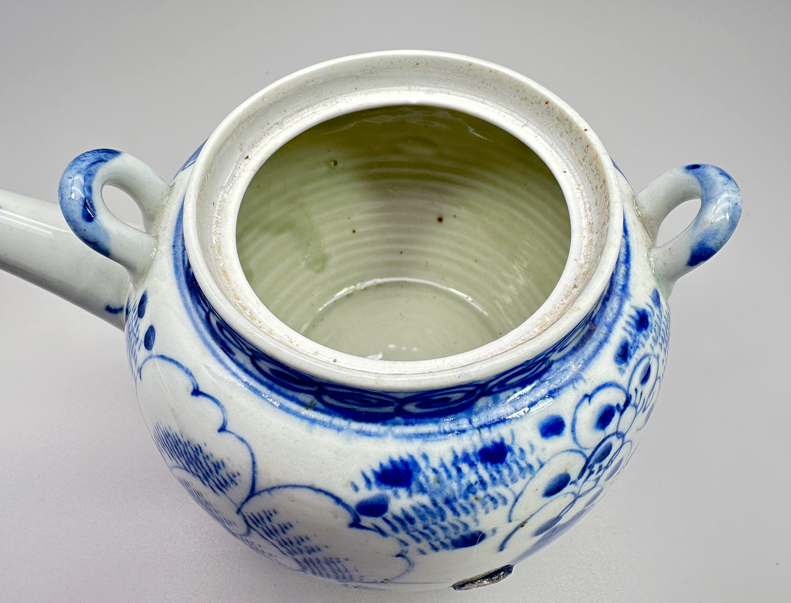 | Condition: | Good condition generally; a small piece of kiln deposit to the surface and the spout with a small chip and crack (see images 11, 12) |