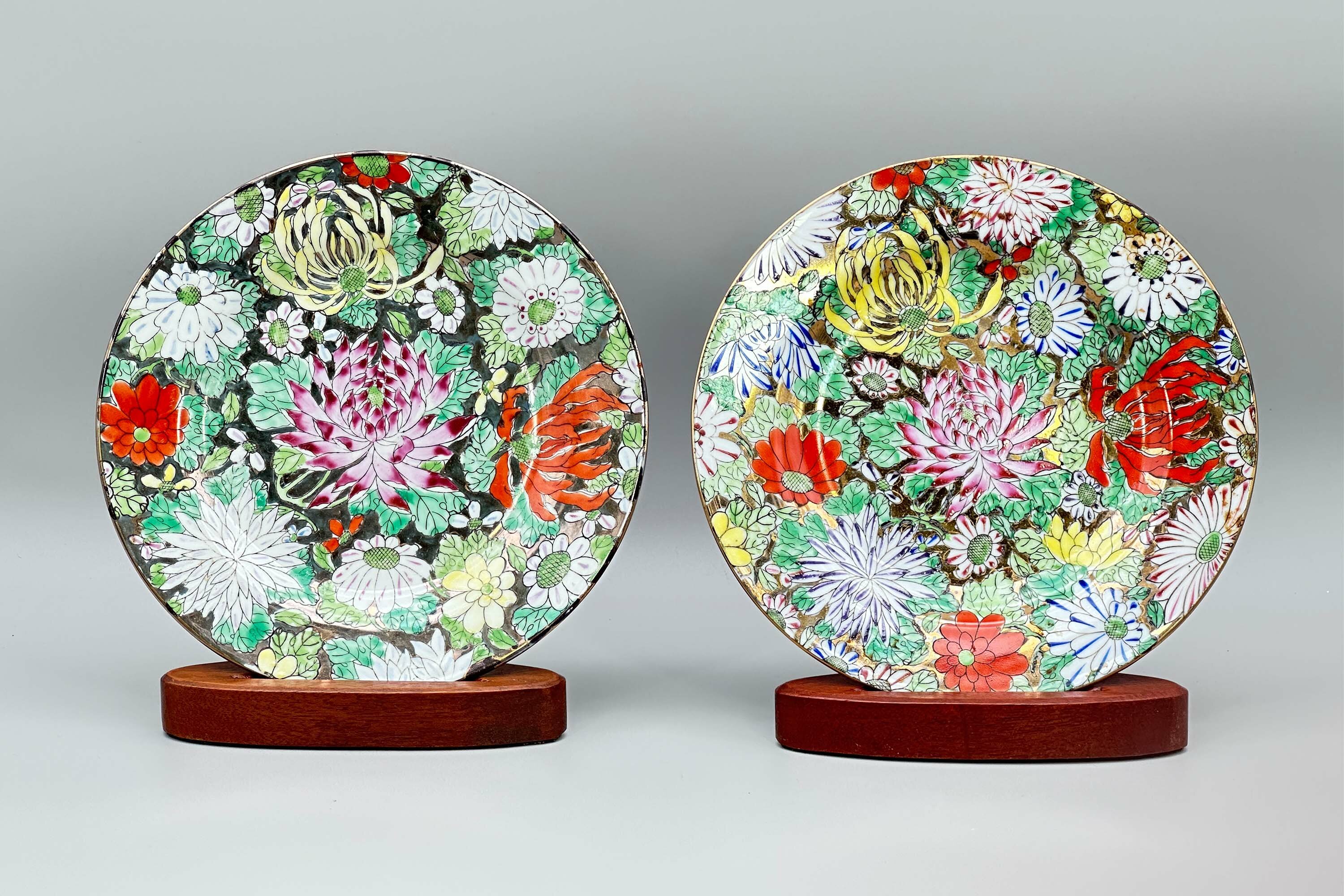 A Japanese ceramic vase of slender bottle form with a near globular body rising to a narrow cylindrical neck, decorated in the ‘Imari’ palette of underglaze blue, iron red and gold with two red enamel ground stylised floral panels on a ground of scrolling peony, the neck with scrolling prunus above a band of repeating chrysanthemum heads and the base with a band of repeating stylised leaves. The paste of the foot and the style of the decoration suggest a dating to the end of the Meiji period (1868-1912) probably around 1900.| Size: | Ht 14.5cm, Width (max) 11cm, Base 6.5cm |