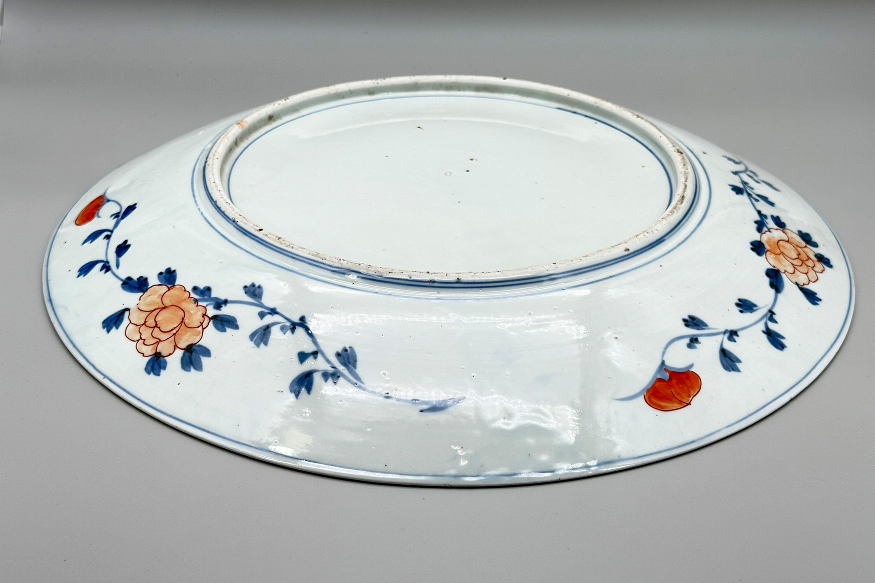 But at their best, the Japanese workshops in the nineteenth century could well match the work of their predecessors and this charger is a prime example. The form is almost that of a very shallow bowl with the sides evenly curving upwards (see image 4) and an unglazed footrim to the reverse. The nineteenth century decorators often created their own designs, but the decoration here follows the originals very closely indeed, even in the colouring of the underglaze blue which has an almost blackish tinge which is also seen in the two earlier examples illustrated. There are three large fan shape panels with flowering peony and three smaller ones with lotus leaf borders and ‘ho ho’ birds, all on a blue ground with stylised gilt floral decoration. One can almost see a wheel here and the design nearly seems to be in motion which was, again, a feature of earlier pieces. The reverse has just three sprays of peony which allows one to see the quality of the glaze.This, combined with the paste of the foot and the general quality of the decoration all point to a mid nineteenth century dating, probably circa 1870 after trade with Japan resumed as a result of the Meiji restoration.