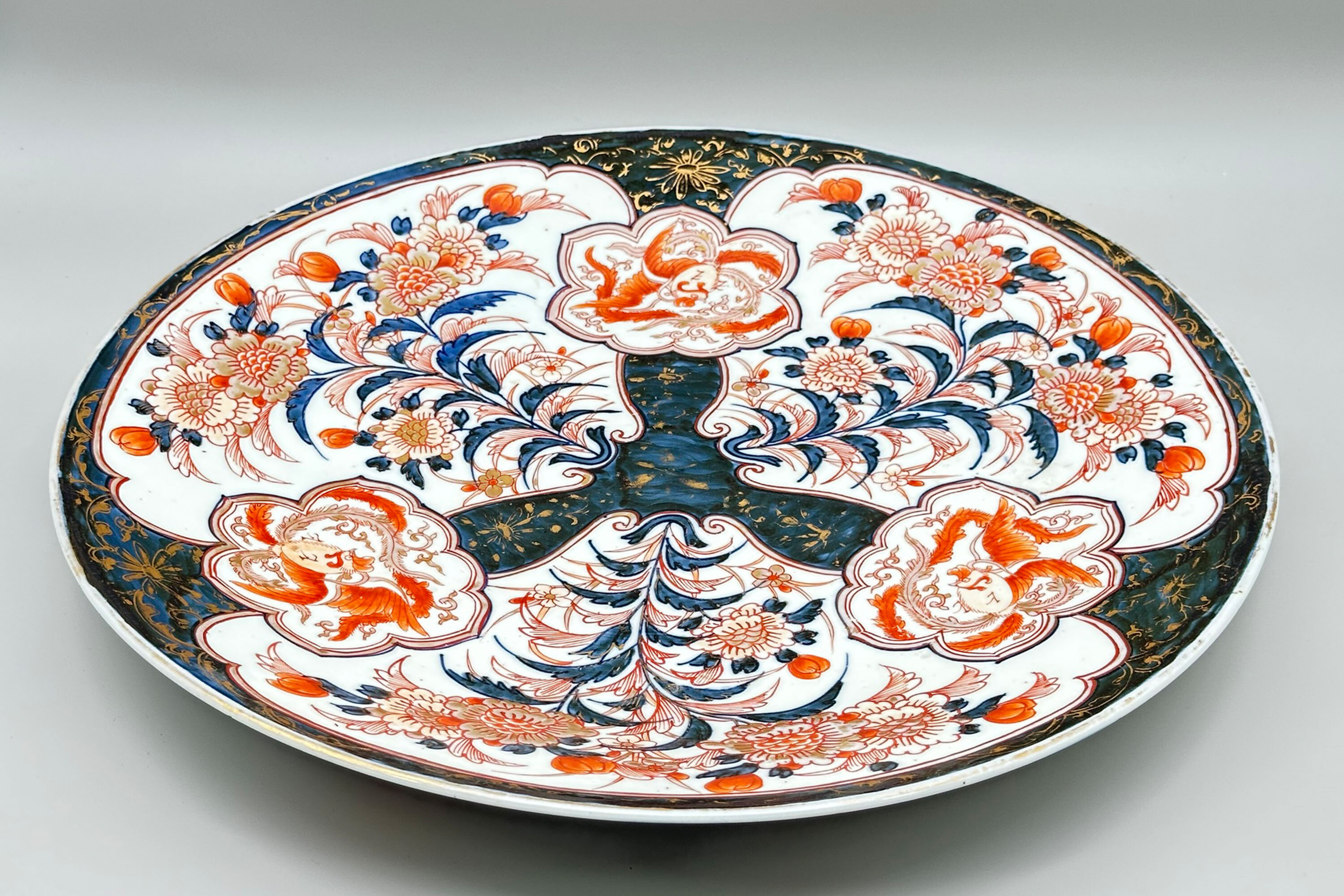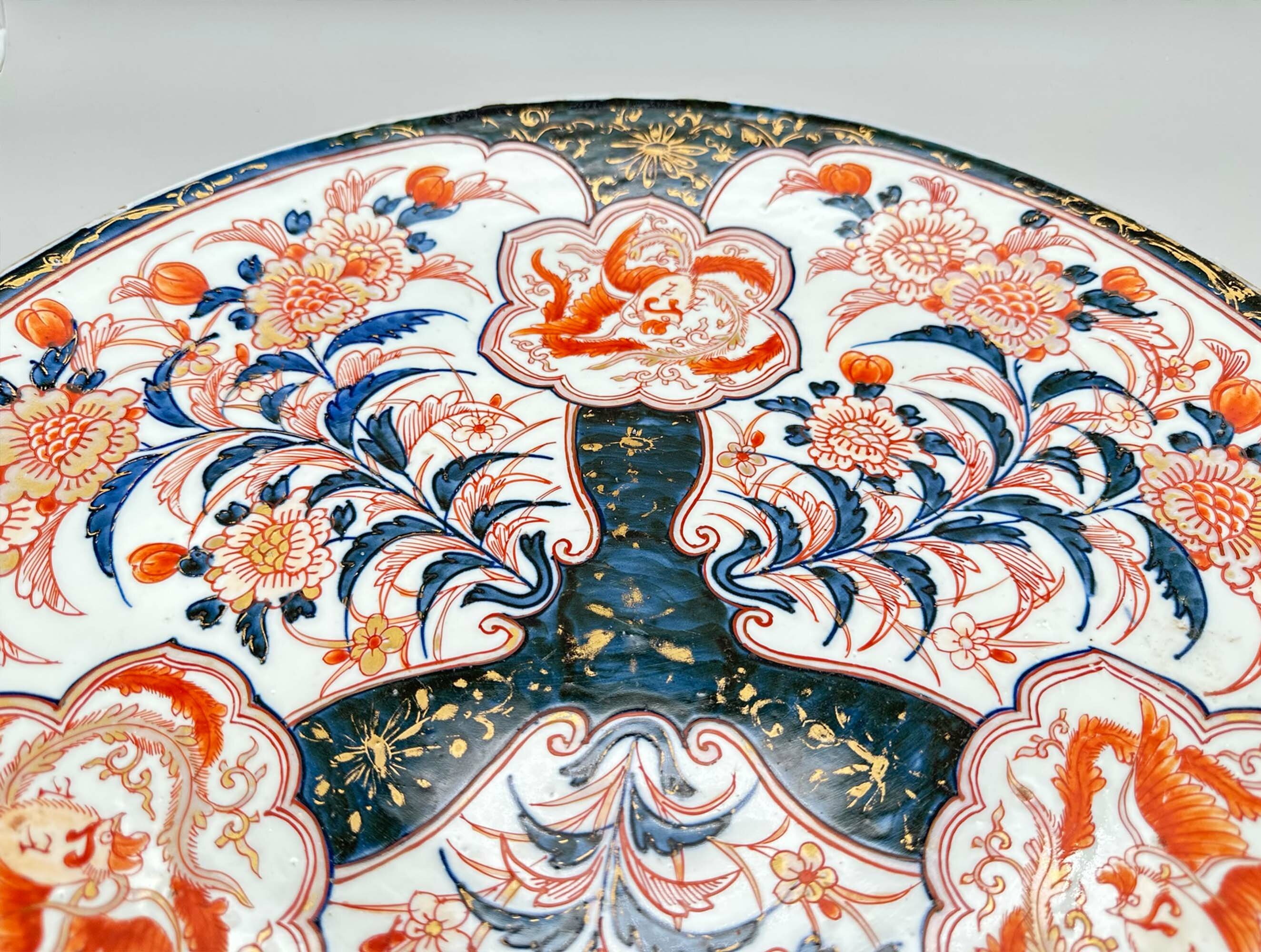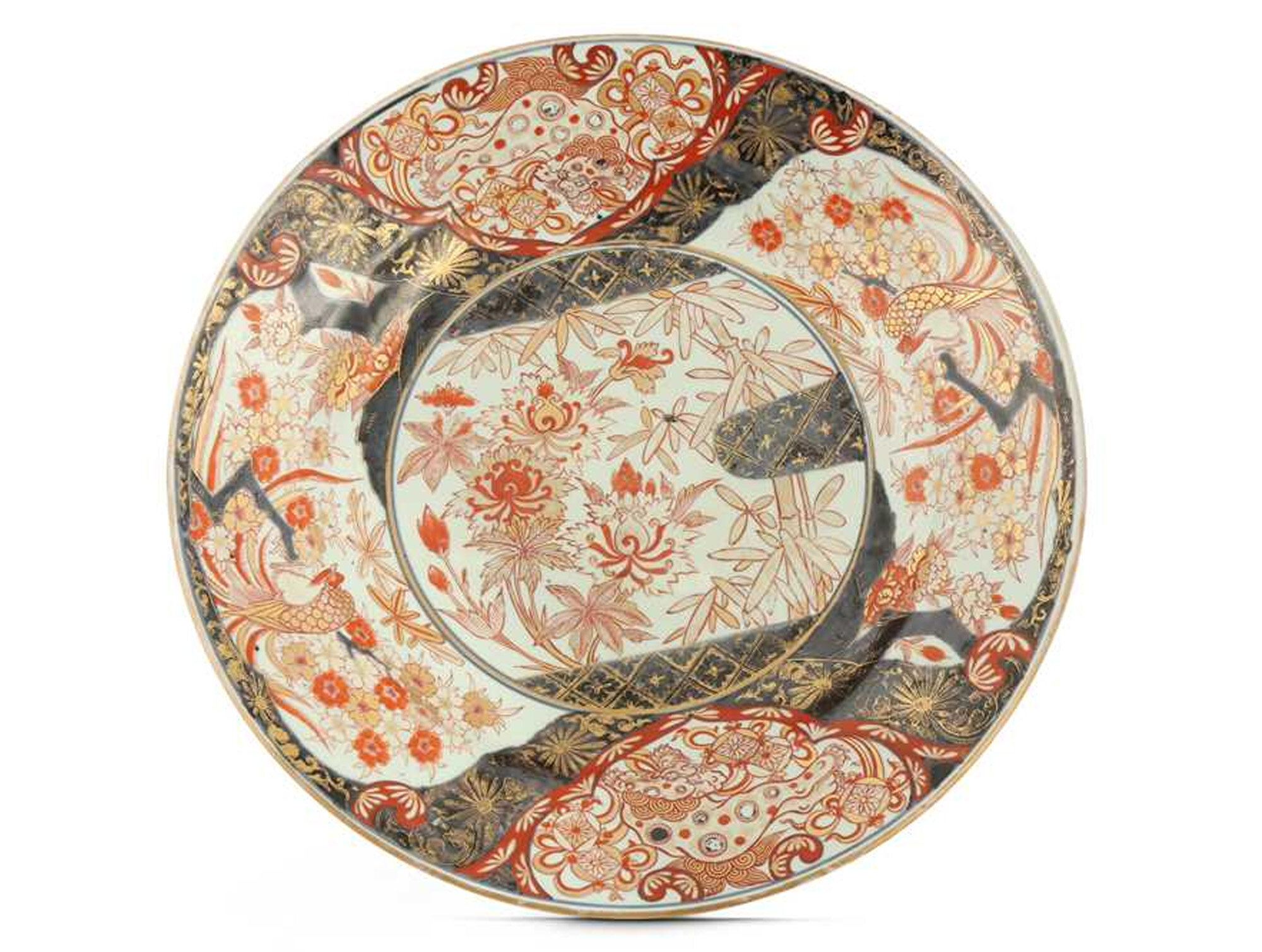 The so called ‘Imari’ porcelains were staple items amongst the ceramics created by the Japanese pottery workshops for export to the West from the mid seventeenth century onwards. Their colourings, most commonly underglaze blue, red and gold, and style of decoration were much imitated, first in China and then in Europe. While the charger featured in this auction was made in the nineteenth century it resembles its earlier predecessors closely and is a more than worthy successor to them.………………………………………………………………………………….....................................................................................………