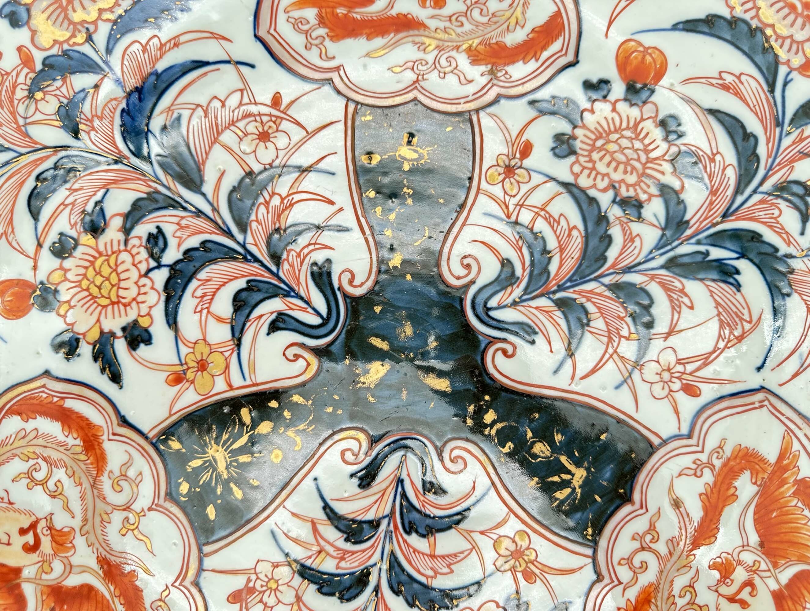 Trade with Japan in the seventeenth century was predominantly directed by the Dutch merchants who had a trading station at Nagasaki. It was their requirements which dictated what the potteries at Arita should make and by the 1660s they were demanding ‘red wares’, the Japanese term for pieces in the colourings of underglaze blue, red and gold, sometimes with additional colours as well. Once made, these porcelains were sent to the port of Imari from where they began their journey to the West and from which they were to take their name. They proved to be immediately popular on their arrival in Holland and the auctions of the cargoes as they arrived were extremely successful. This led to a plentiful supply of chargers, bowls and vases (many with covers and some forming part of a five piece garniture) which were to decorate the royal and aristocratic homes not only of Holland itself but throughout Europe and particularly in Great Britain, where they can be seen today.