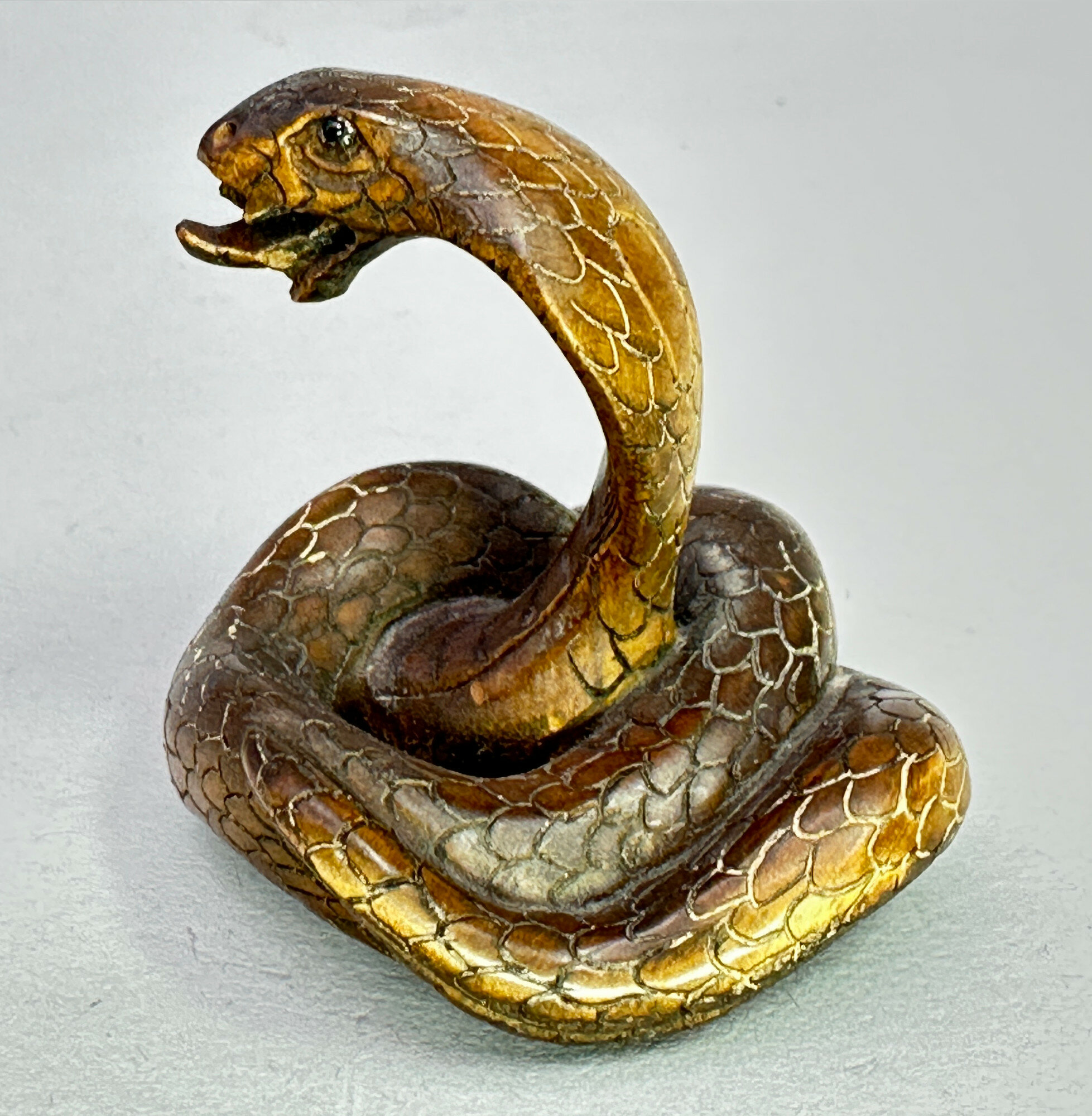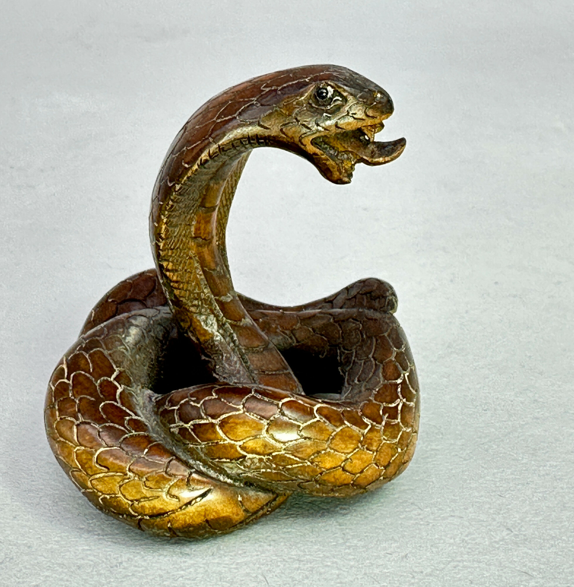 A Japanese boxwood netsuke sculpture of a cobra, seated coiled with its head upraised and mouth open with the tongue protruding, the scale naturalistically rendered even to the underside where there is an incised artist’s mark. The eyes are inset with small hardstones [CHECK] which is an additional sign of the quality of the work here which would have required no small amount of skill to create such an ‘open’ composition. Netsuke were carved toggles used to attach hanging objects, usually okimono, to the sash of a kimono and became the subject of the master carver’s art, sometimes of the very highest class. They were formed from ivory or wood, as here, and usually display the holes through which the fastening cord was threaded but this is not the case here because of the nature of the composition. While there is certainly abundant artistry, the carver’s signature cannot be identified. Netsuke began to fall out of fashion in the nineteenth century as European dress gradually became more popular but a dating to this period seems reasonable.