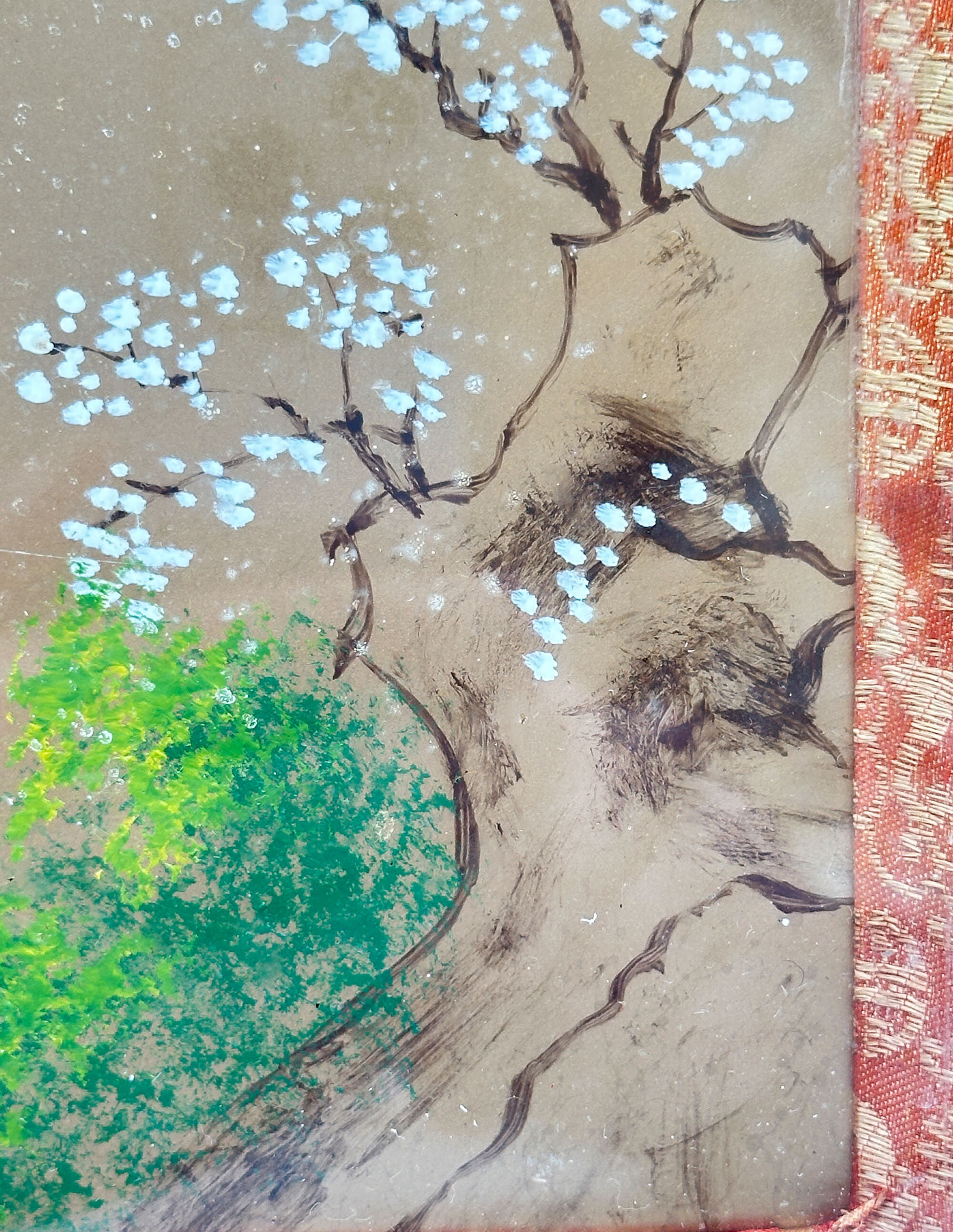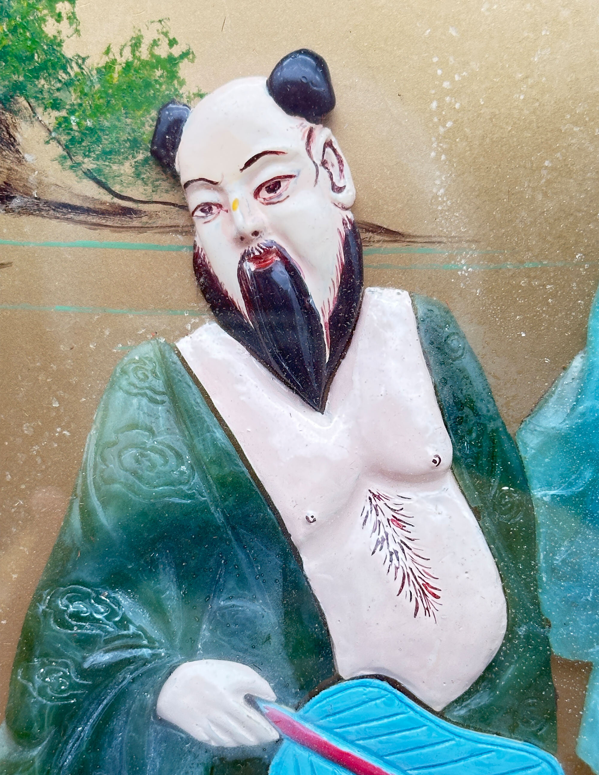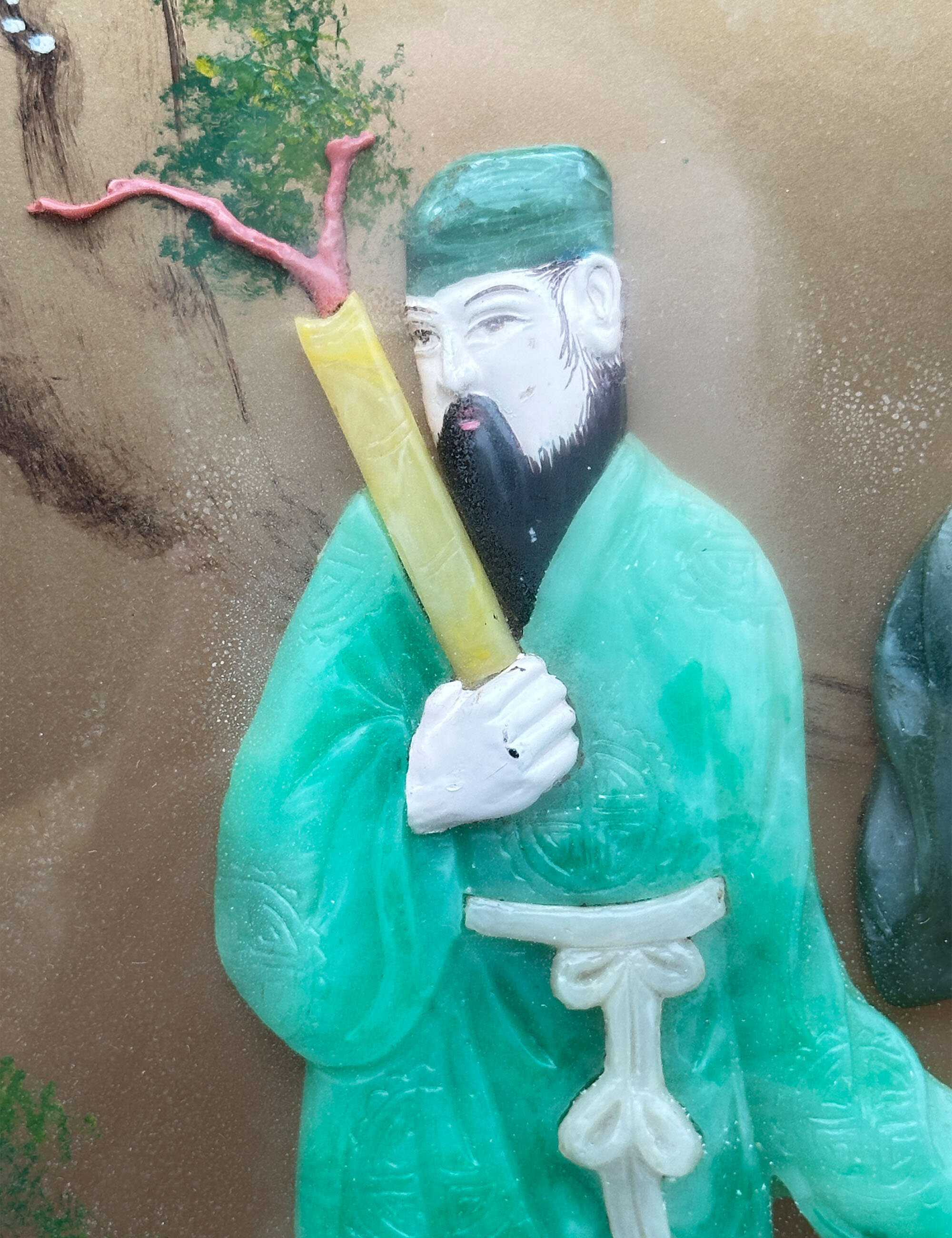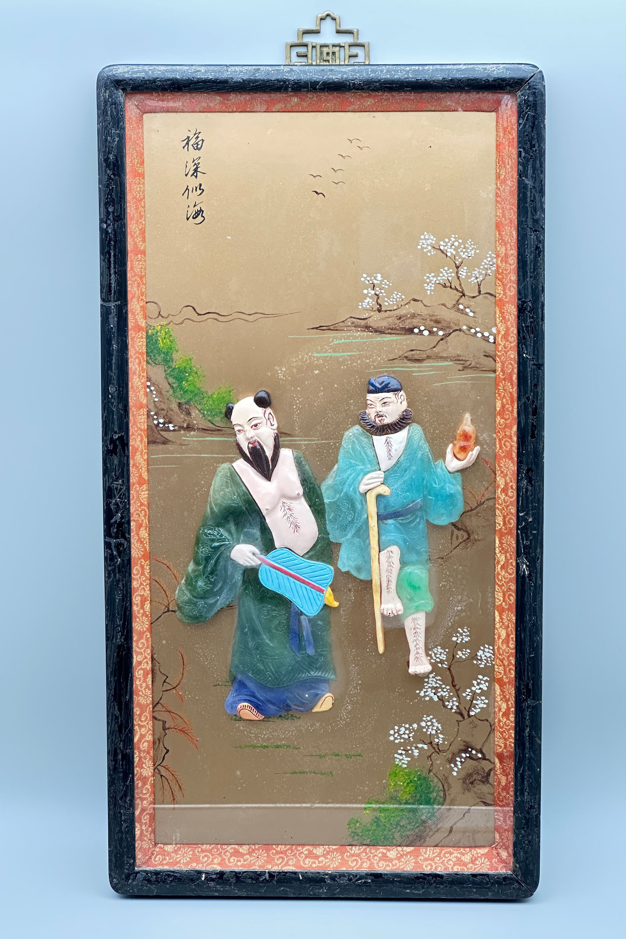 A pair of Chinese lacquer panels, the gold ground with painted decoration and hardstone inlay depicting four of the eight immortals, or Baxian, in a stylised garden scene. Amidst painted rocks and flowering prunus with lakes and mountains in the background stand, on the left plaque, Lan Caihe, the patron of florists and gardeners, and Lü Dongbin, a scholar and poet, and on the right plaque Zhongli Quan, associated with death and the power to create silver and gold, often depicted holding a fan, and Li Tieguai, associated with medicine and easing the suffering of the sick and needy, identified by his iron crutch and calabash bottle. The eight immortals are figures of legend which feature in Chinese mythology and are worshipped by Taoists as well as appearing in secular Chinese culture. They are often depicted in Chinese art and it is possible that we have here two plaques from an original set of four representing them all. That said, the compositions here are well balanced with perhaps a deliberate contrast between the attributes of the figures. Plaques with hardstone inlay are known amongst the items exported to the West in the early twentieth century and sometimes occur as furniture screens. The work here is both colourful and expressive and an excellent example of the genre. The frames with their silk border may be slightly later but are certainly Chinese and well complement the compositions which they surround contributing to a highly decorative ensemble for a contemporary interior.