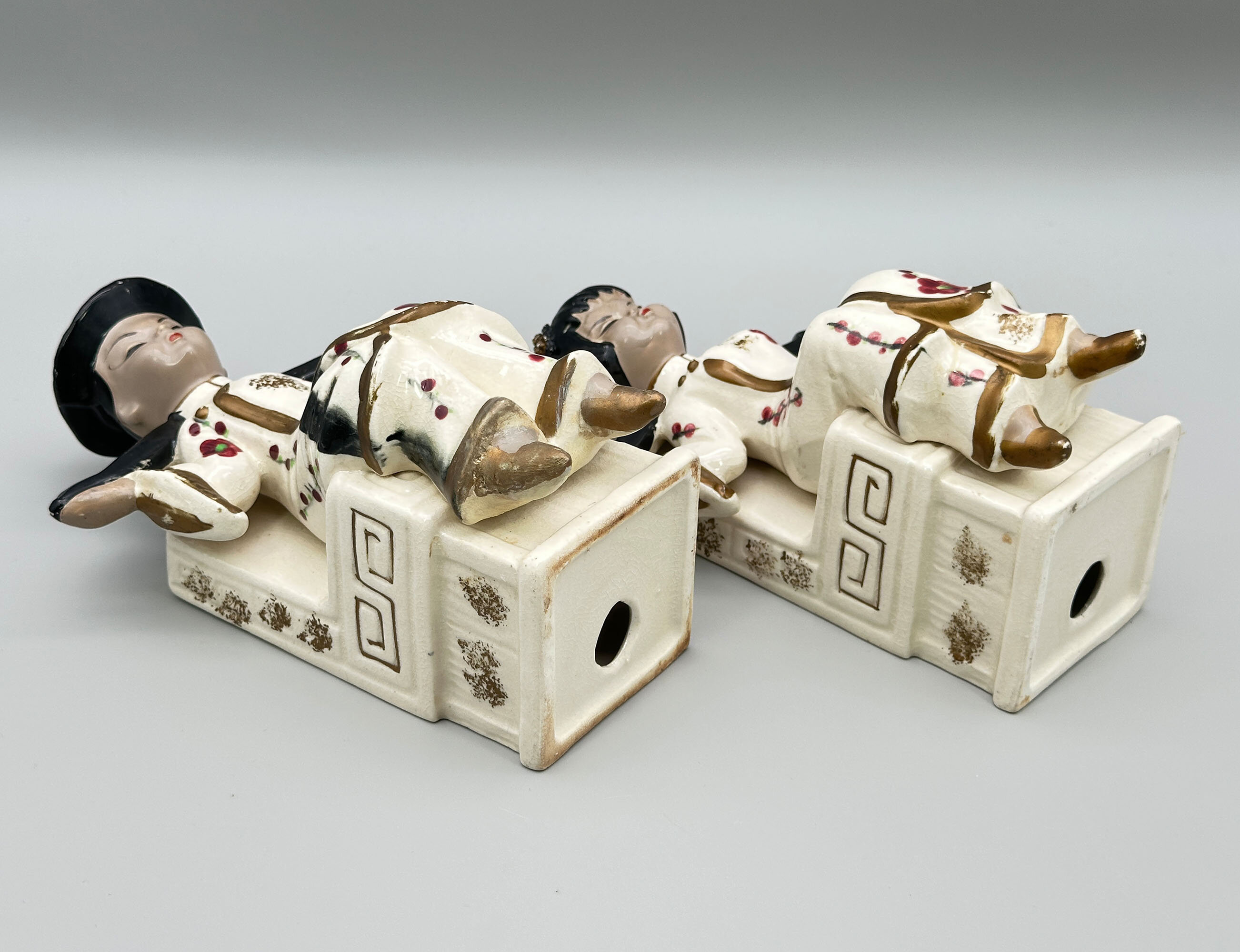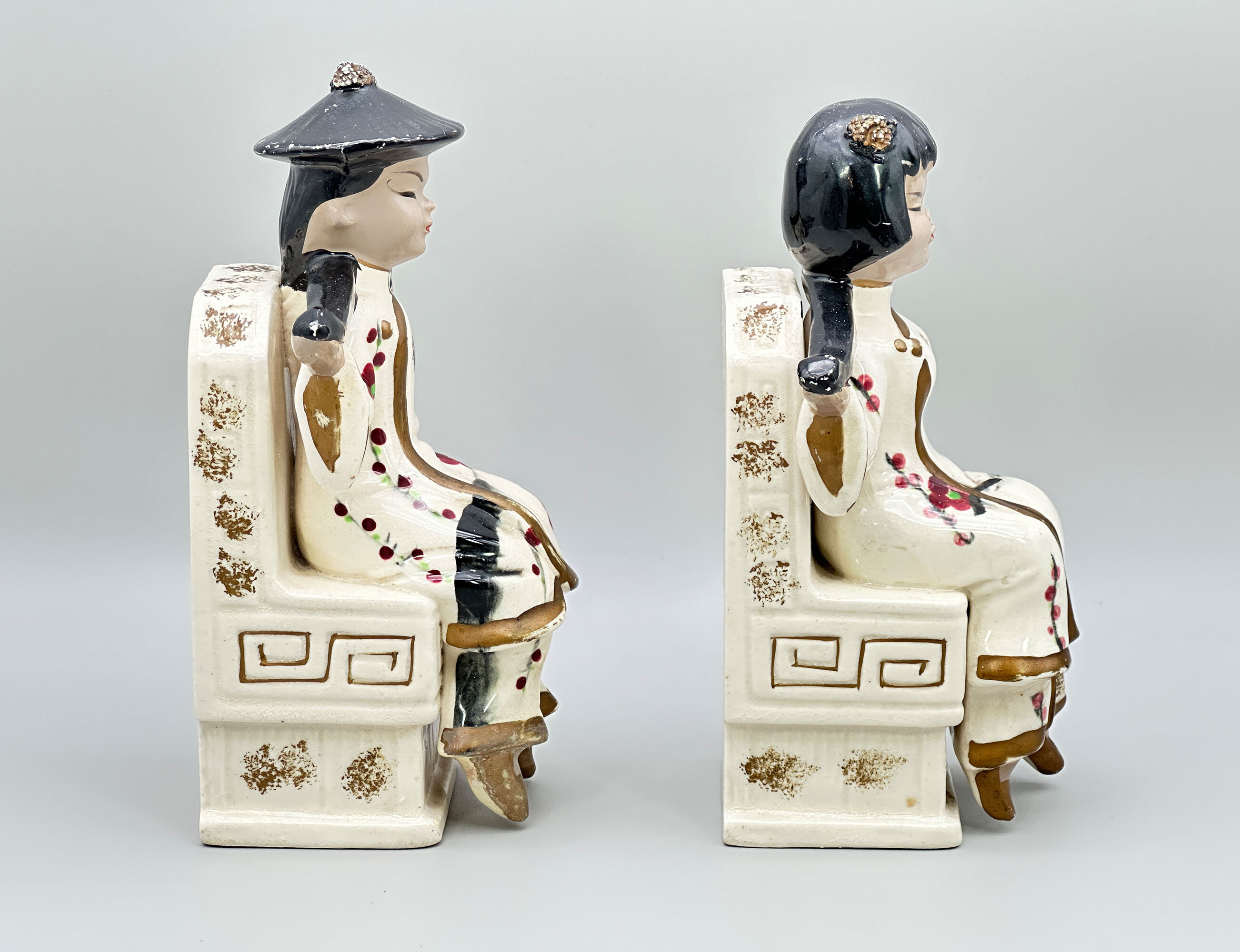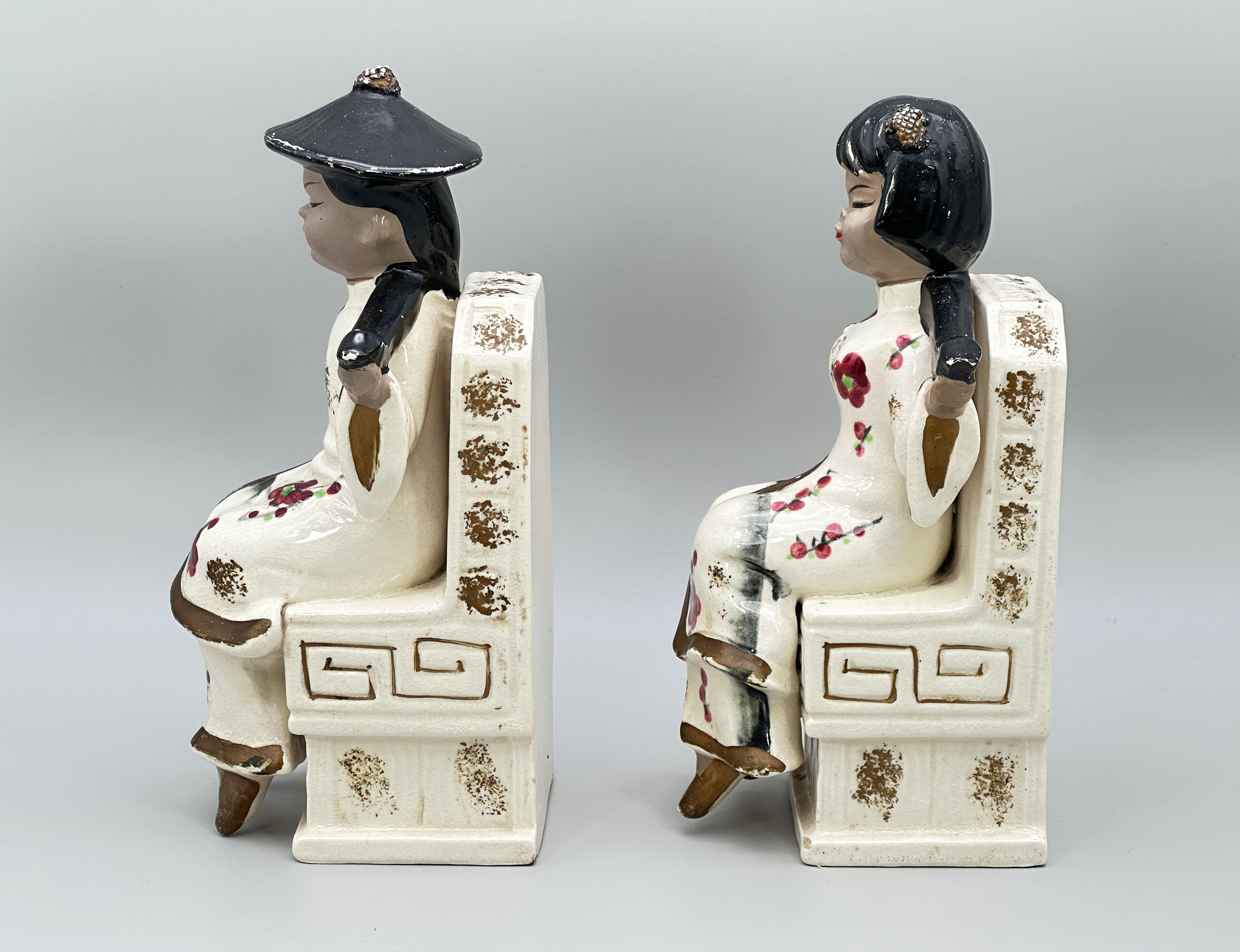 Pair of Japanese ceramic Bookends, seated Boy and Girl, mid C20th