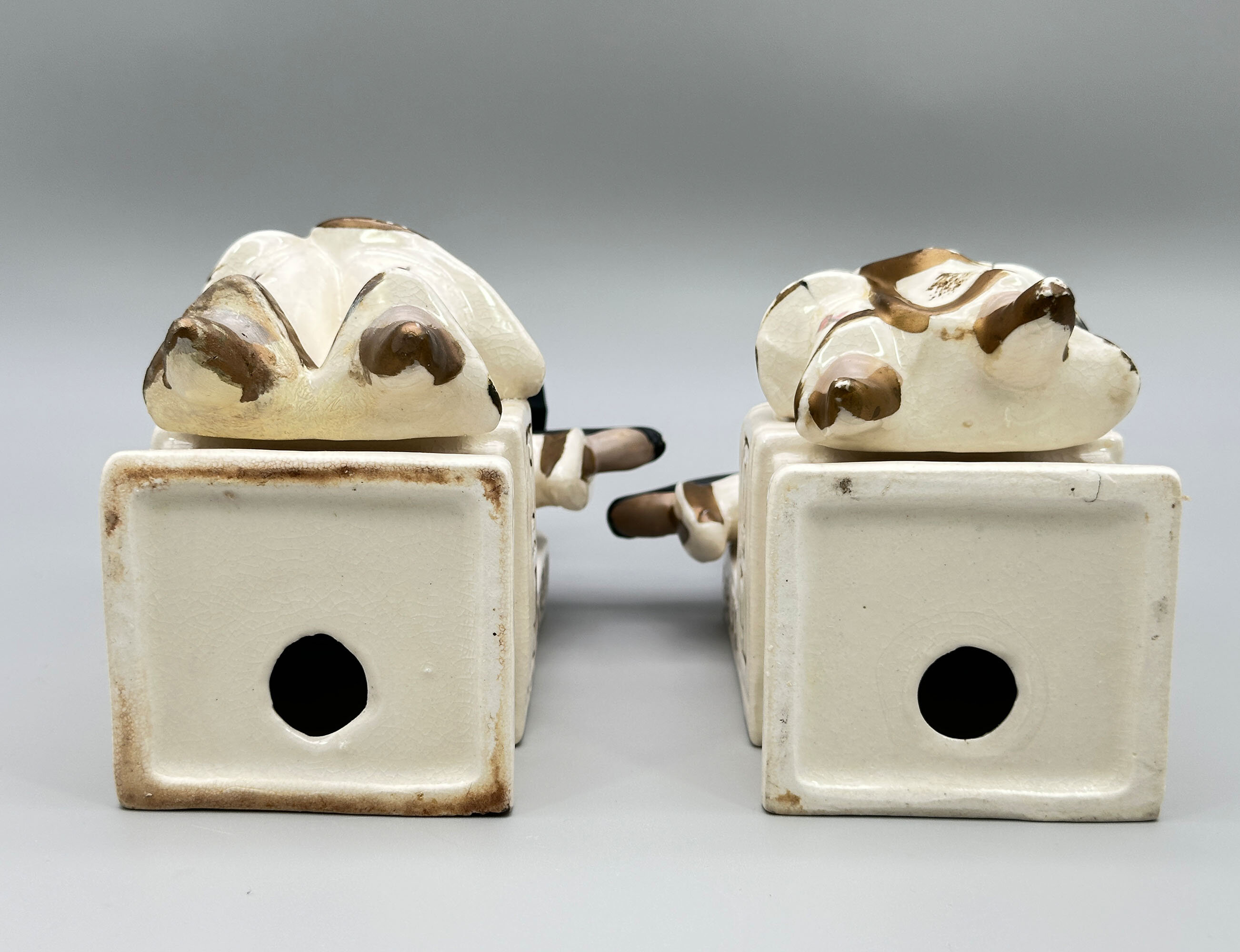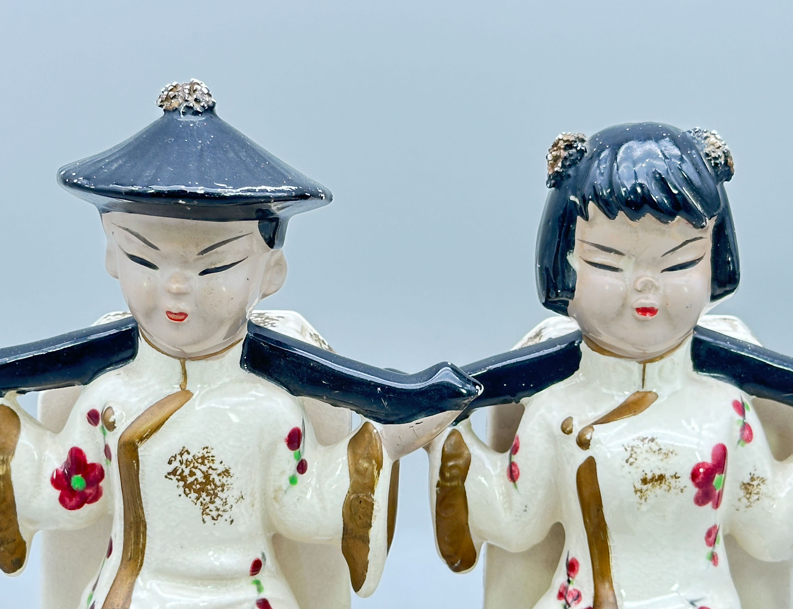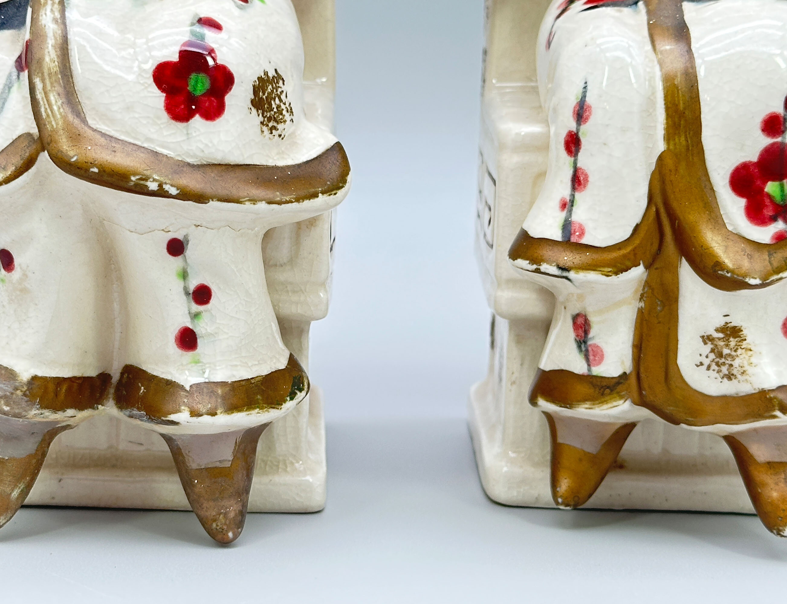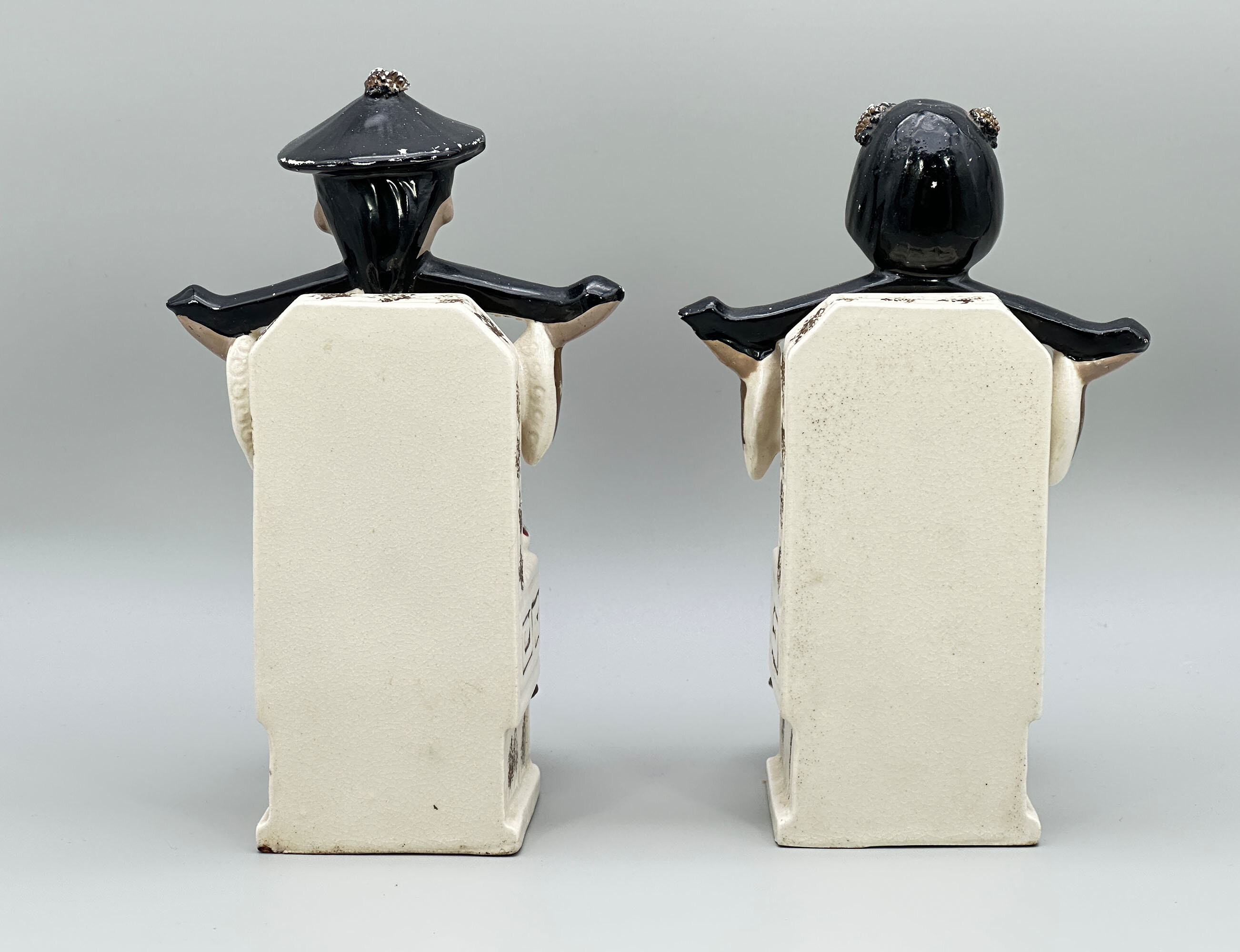 A pair of Japanese ceramic bookends, each modelled as a seated figure, a boy and a girl, dressed in elaborate robes, the boy wearing a typical Oriental conical hat, both holding in their upraised arms a carrier’s ‘yoke’, their throne-like chairs with gilt decoration to the sides. While figures like this were sometimes made in Europe, this pair not only look Japanese but were clearly made there. The style of the decoration and the paste of the foot both confirm this. Dating is probably to the 1950s when Japan was exporting a variety of novelty ceramic items for a Western audience. The two yokes are a strange addition. Normally these are seen with hanging containers attached, usually for water. Image 9 shows a typical and heavily burdened ‘water carrier’ figure from the late nineteenth century. Our pair here can hardly be regarded as taking a rest, so the carrying implements were presumably simply added to enhance the design. The result, though, is extremely pleasing and would more than enhance a small collection of books today.| Size: | Man : Ht (max) 22cm, Width (max) 13cm, Depth (max) 10.5cm, Base 7.5cm x 7cm Woman : Ht (max) 21cm, Width (max) 13cm, Depth (max) 10cm, Base 7.8cm x 7cm |