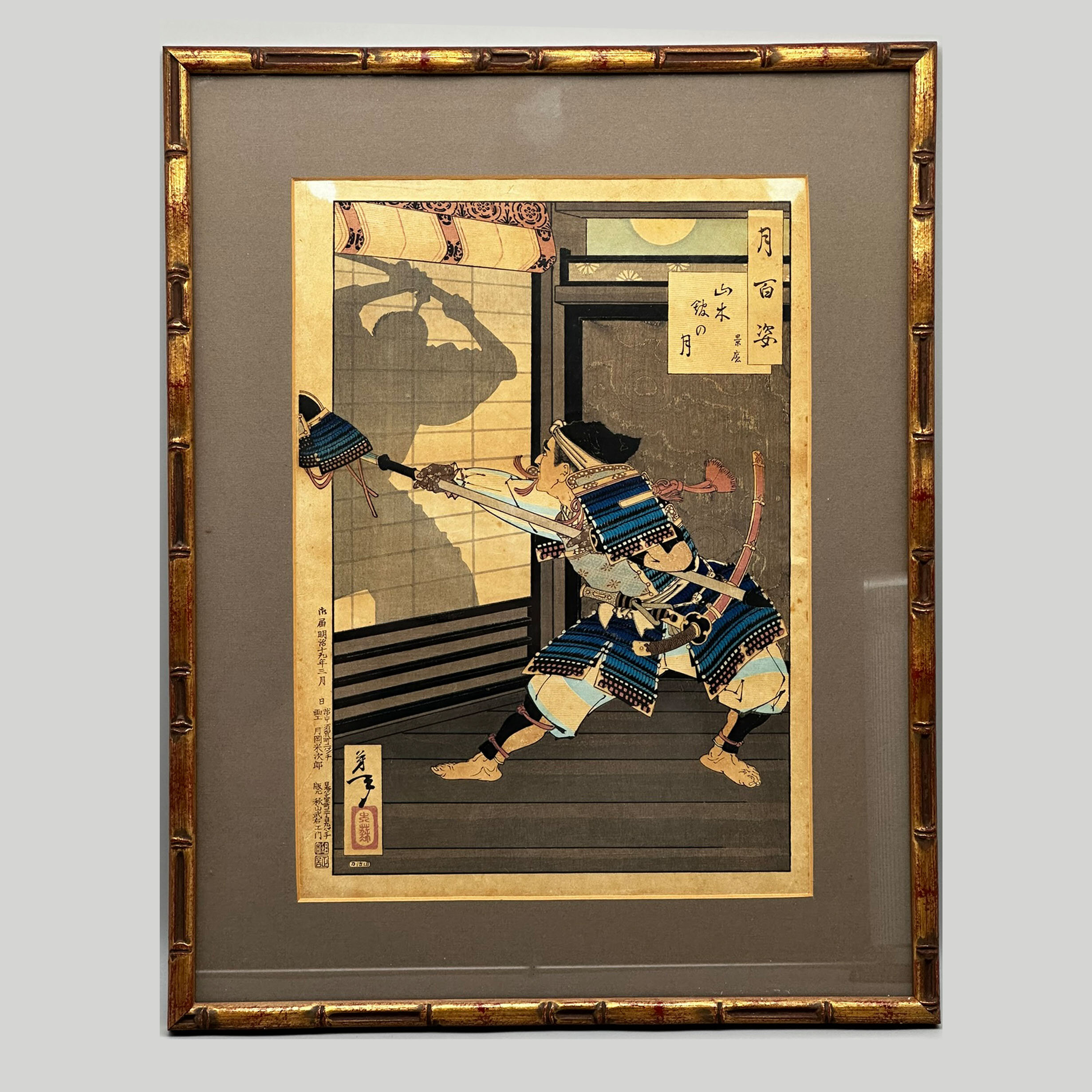 The artist's seal, ‘Taiso’, is printed in red relief within a rectangular cartouche to the lower left and his signature can be seen above (see image 4). The title, ‘Kagekado, Moon of Yamaki Mansion’, appears in the square cartouche to the upper right and the series title, ‘One Hundred Aspects of the Moon’, in the rectangular cartouche next to it (see image 5). On the reverse is affixed an identification note from the British Museum dated 1983 confirming the artist and the subject of the print which appears to have survived in a remarkably fine state of preservation.