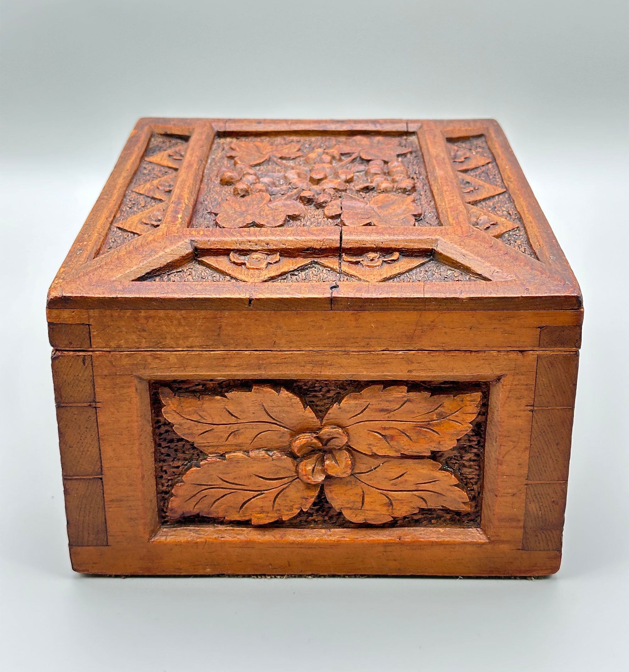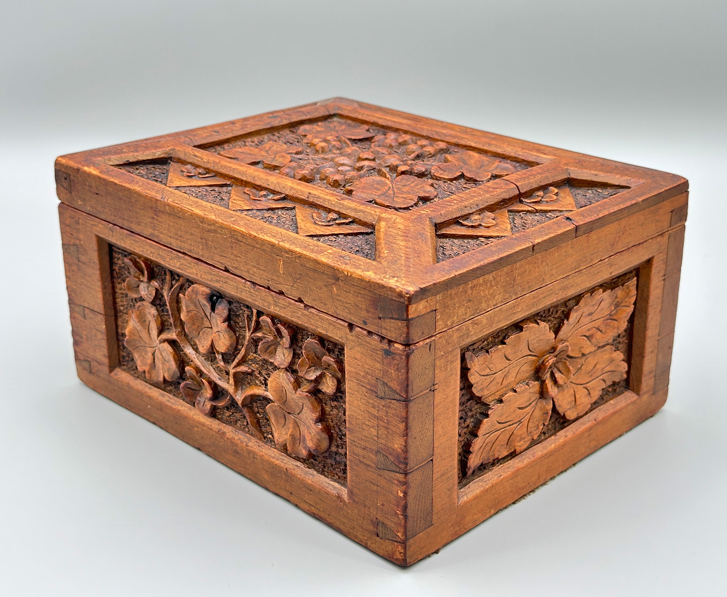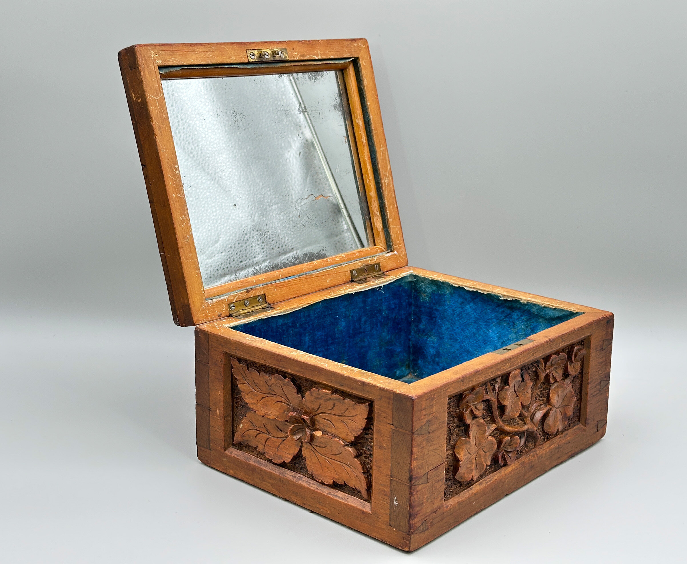 A light brown oak wood box with a hinged lid, the interior lined in blue velvet and the lid with a mirror inset inside, the exterior deeply carved with panels of leaves on a textured ground, the lid in addition with a repeating geometric pattern border, the corners with dovetail joints clearly visible. The work on this attractive box is clearly European (there are other similar examples from India and China) and the naturalistic motifs suggest German work in the well known ‘Black Forest’ tradition which exploited woodland themes including animals. Dating is most likely to the late nineteenth century and this piece well retains its attraction today.| Size: | Width 24.2cm, Depth 19.5cm, Ht (max) 13cm |