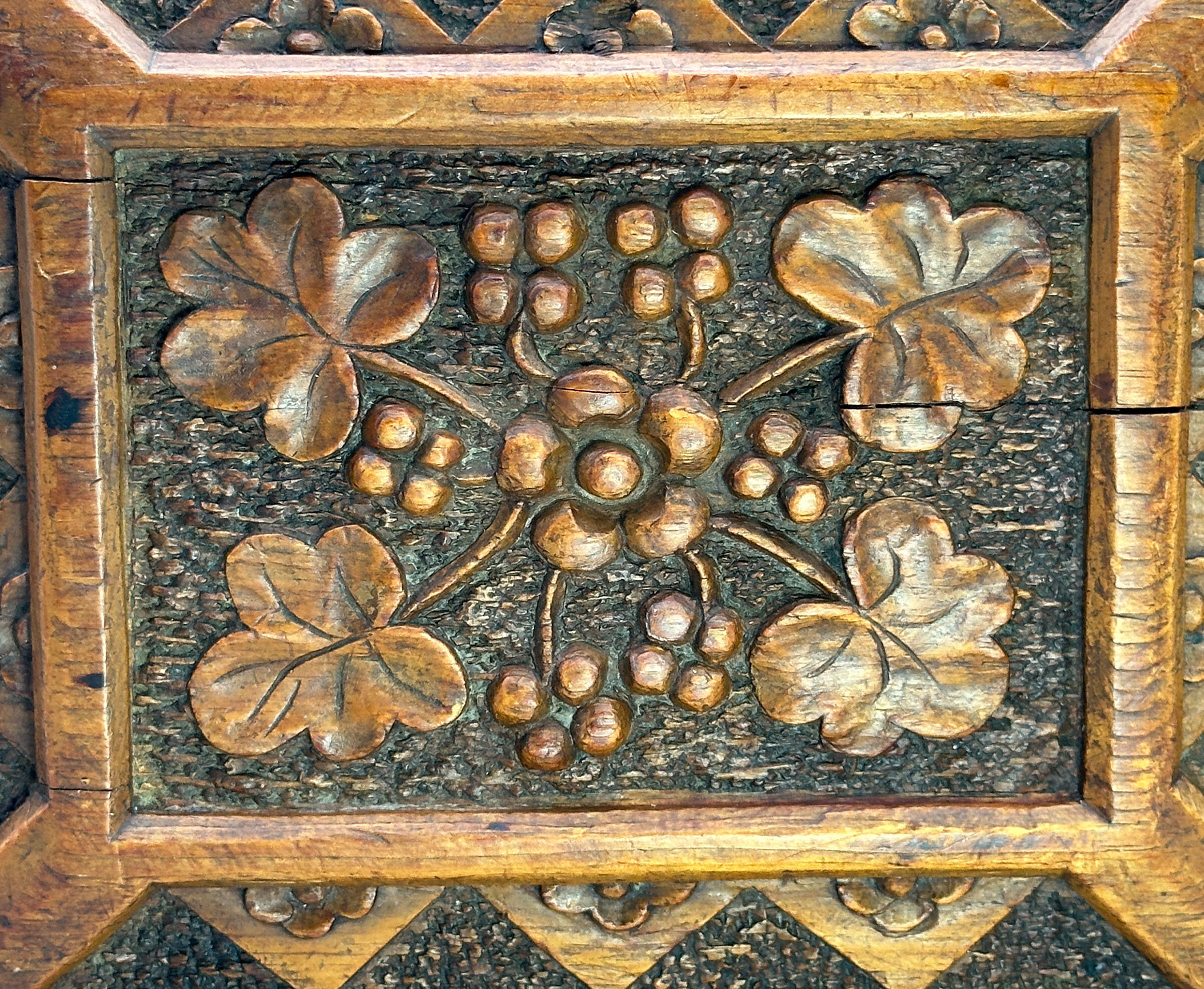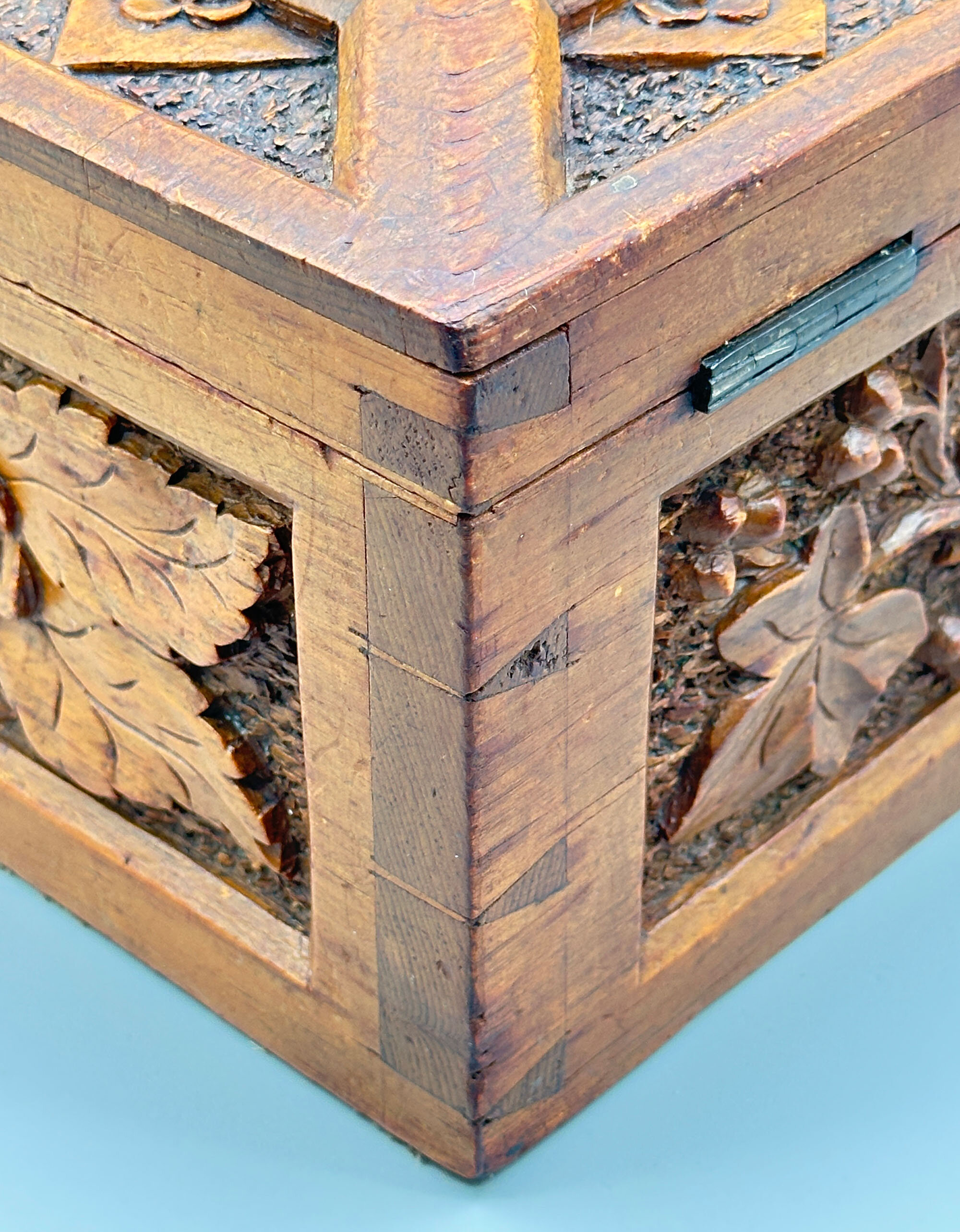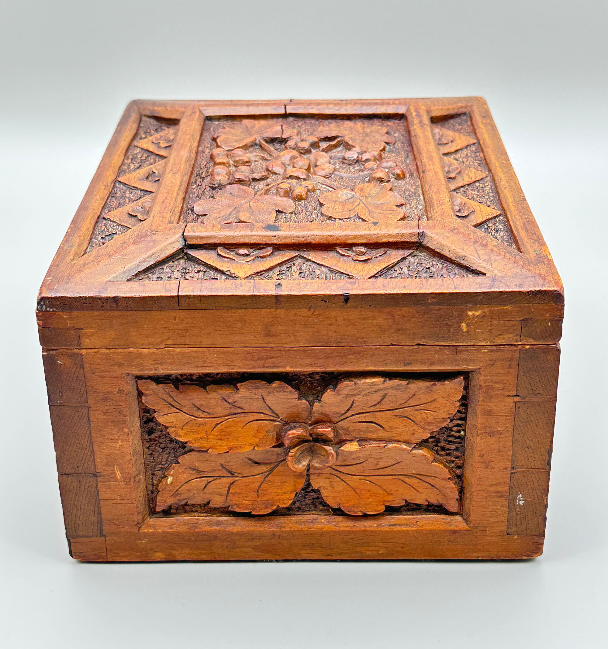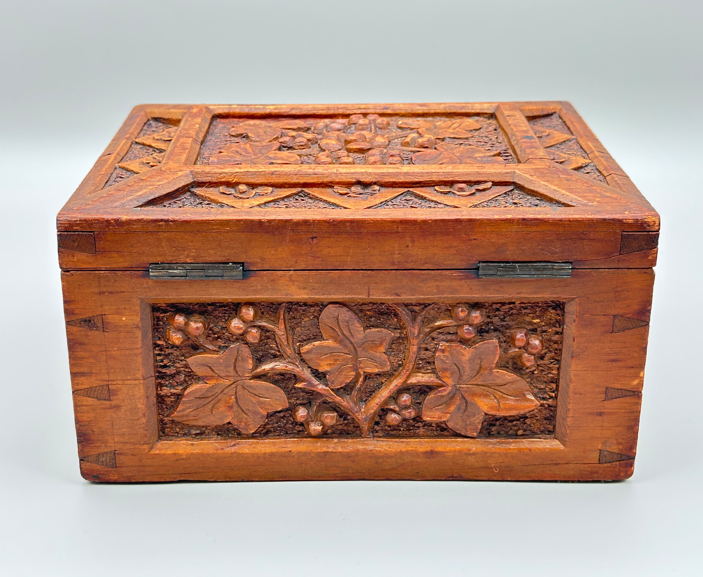 A light brown oak wood box with a hinged lid, the interior lined in blue velvet and the lid with a mirror inset inside, the exterior deeply carved with panels of leaves on a textured ground, the lid in addition with a repeating geometric pattern border, the corners with dovetail joints clearly visible. The work on this attractive box is clearly European (there are other similar examples from India and China) and the naturalistic motifs suggest German work in the well known ‘Black Forest’ tradition which exploited woodland themes including animals. Dating is most likely to the late nineteenth century and this piece well retains its attraction today.| Size: | Width 24.2cm, Depth 19.5cm, Ht (max) 13cm |