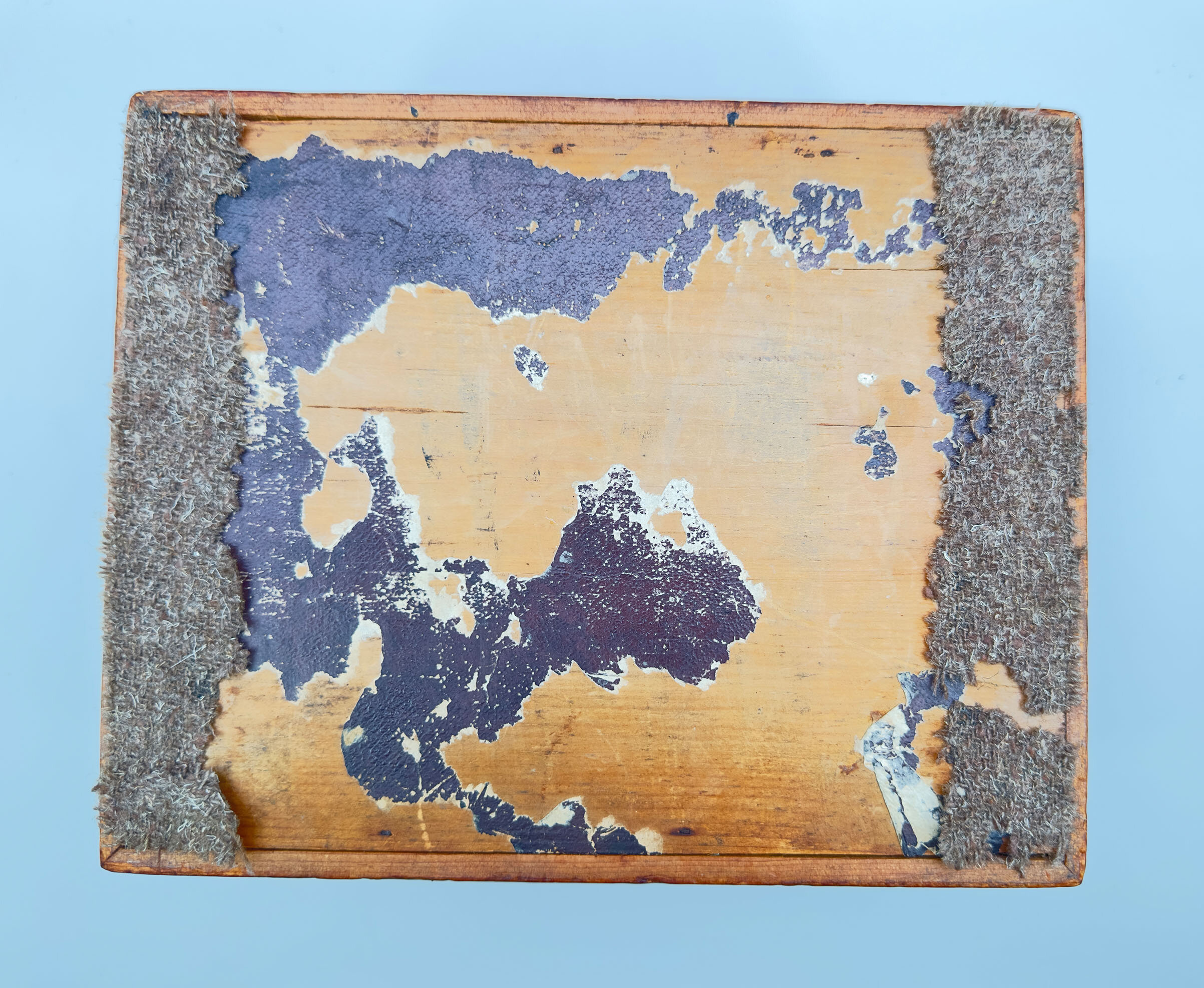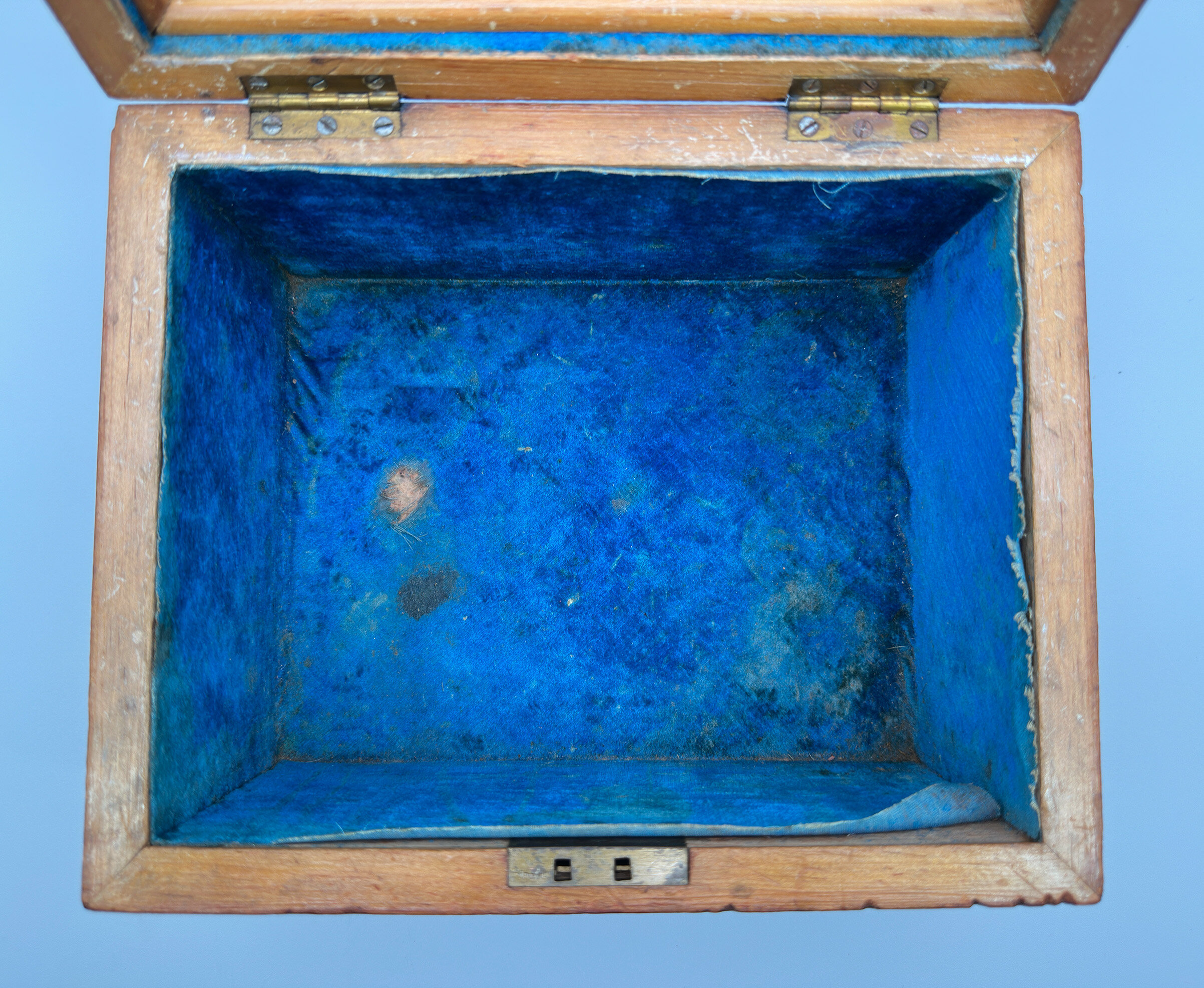 | Condition: | Good condition generally; slight scratches to the interior top edges, mirror silvering slightly defective in places, interior velvet stained/worn, base leatherette finish mainly missing with a later damaged felt covering, key missing. |