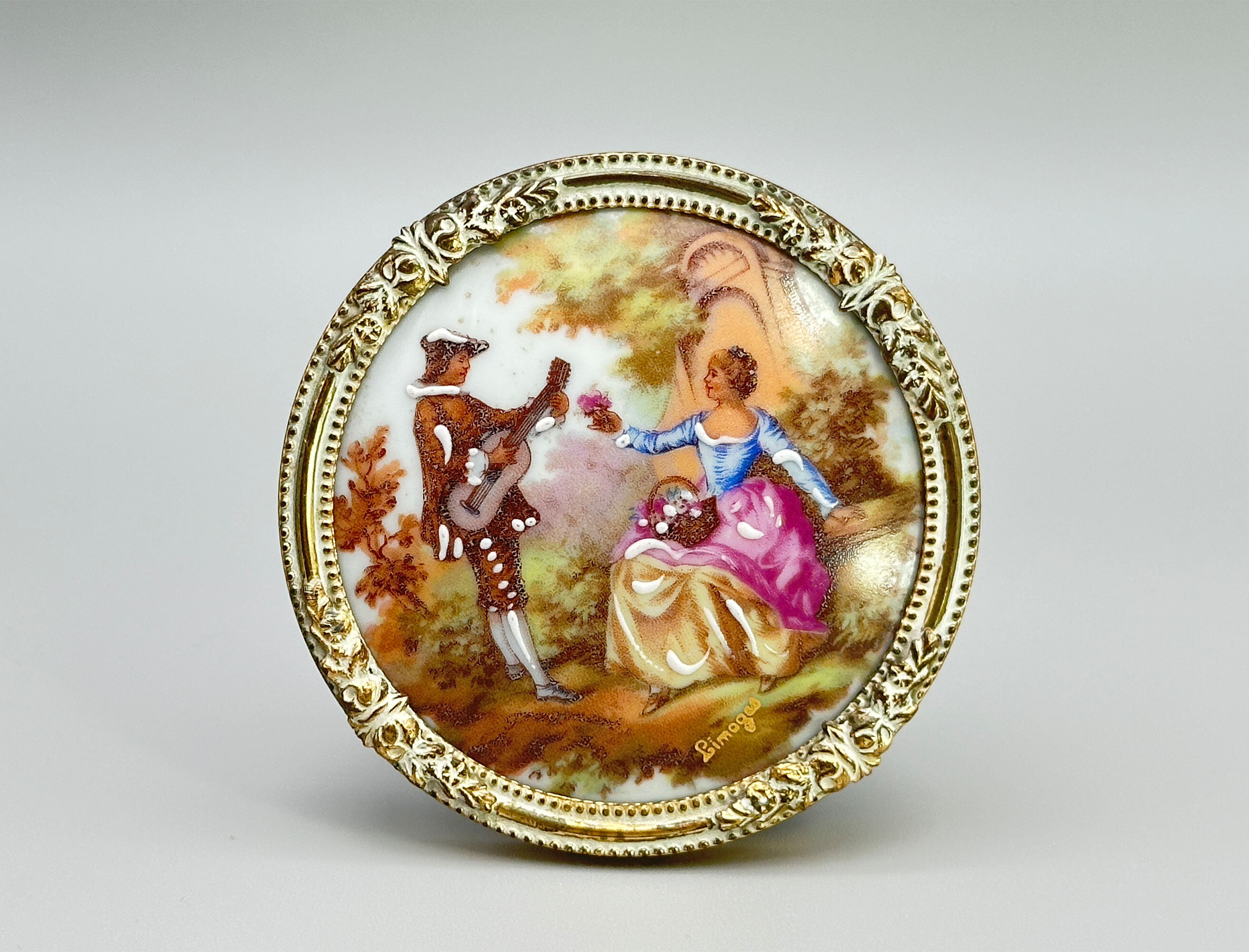 A pair of small salts, pewter and of circular form with brass bands to the top and bottom and inset glass beads in green, red and blue. The rather austere and slightly mediaeval appearance of these salts indicates the influence of the ‘Arts and Crafts’ movement which flourished in Britain from the late nineteenth century to the 1920s. Ornament "must be secondary to the thing decorated", declared the designer Owen Jones, and said there must be “fitness in the ornament to the thing ornamented". Certainly, there are few traces of florid decoration here as is the case with the salt and pepper set elsewhere in this sale. These pieces may date slightly later and there are silver serviette rings in the same format which are hallmarked for 1933 which may explain why they also have a slightly Art Deco feel in their simplicity of design.| Size: | H 3 cm Diameter 4.5 cm |