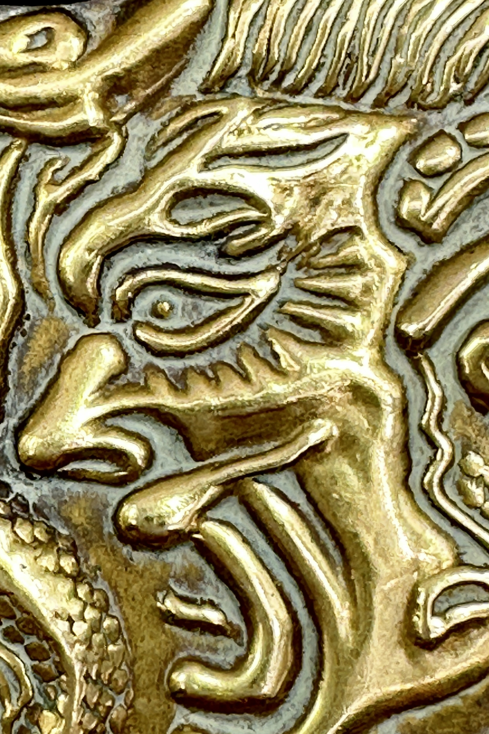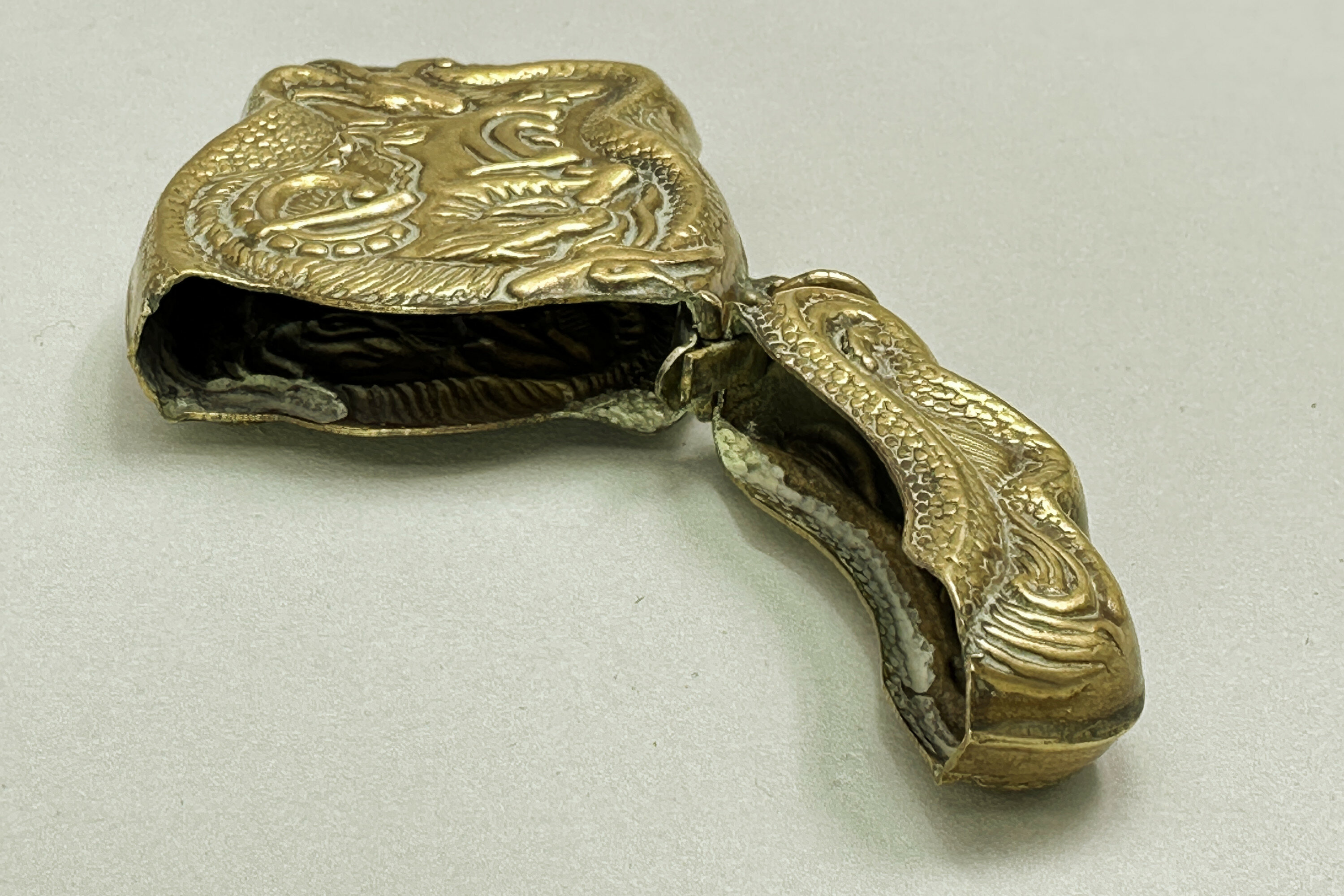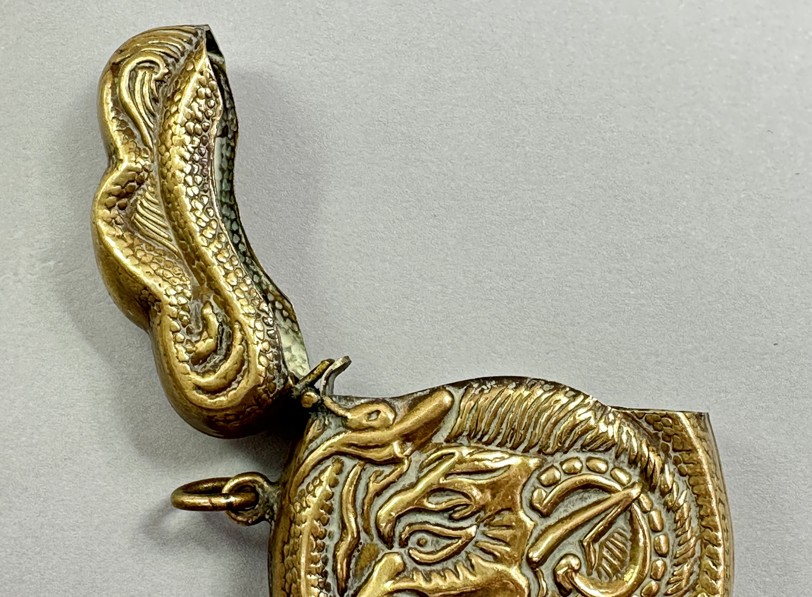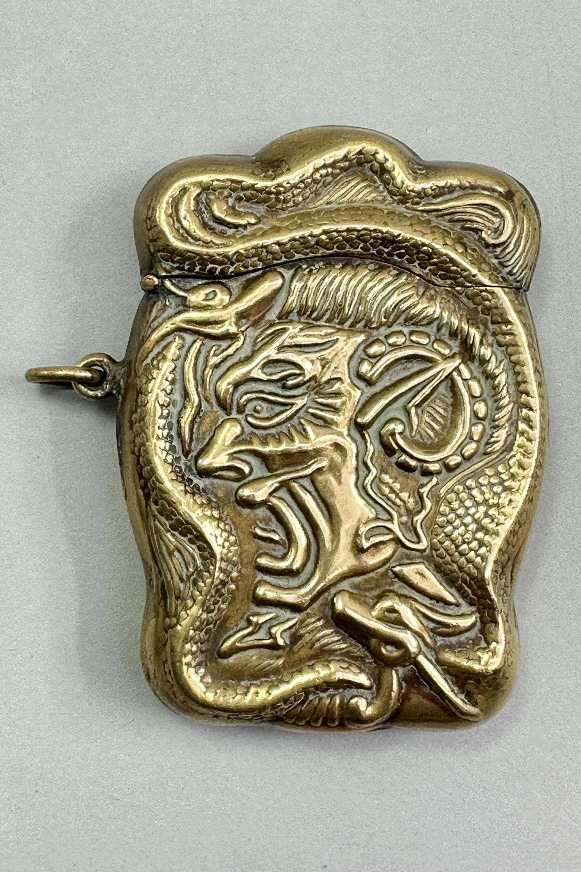A small brass case with a hinged lid of irregular rectangular form decorated in high relief repoussé tecnique with a devil’s head encircled by a snake whose scaly tail continues onto the lid. Repoussé work is a metalworking technique in which a malleable metal is shaped by hammering from the reverse side to create a design in low relief. Other examples of these cases are known with a similar shape and technique and even the devil and snake motif. It is more than likely that this case was designed for matches, the so called 'Vesta Case' of which there is another example in this auction. Like that piece it is fitted with a ring, presumably to allow it to be attached to a watch chain. But other uses could have been intended, possibly for business or visiting cards (the Victorian calling card was much smaller) or perhaps for pills. The style of decoration very much recalls 'Arts and Crafts' pieces made around 1900 and a similar dating seems likely here.| Size: | na |