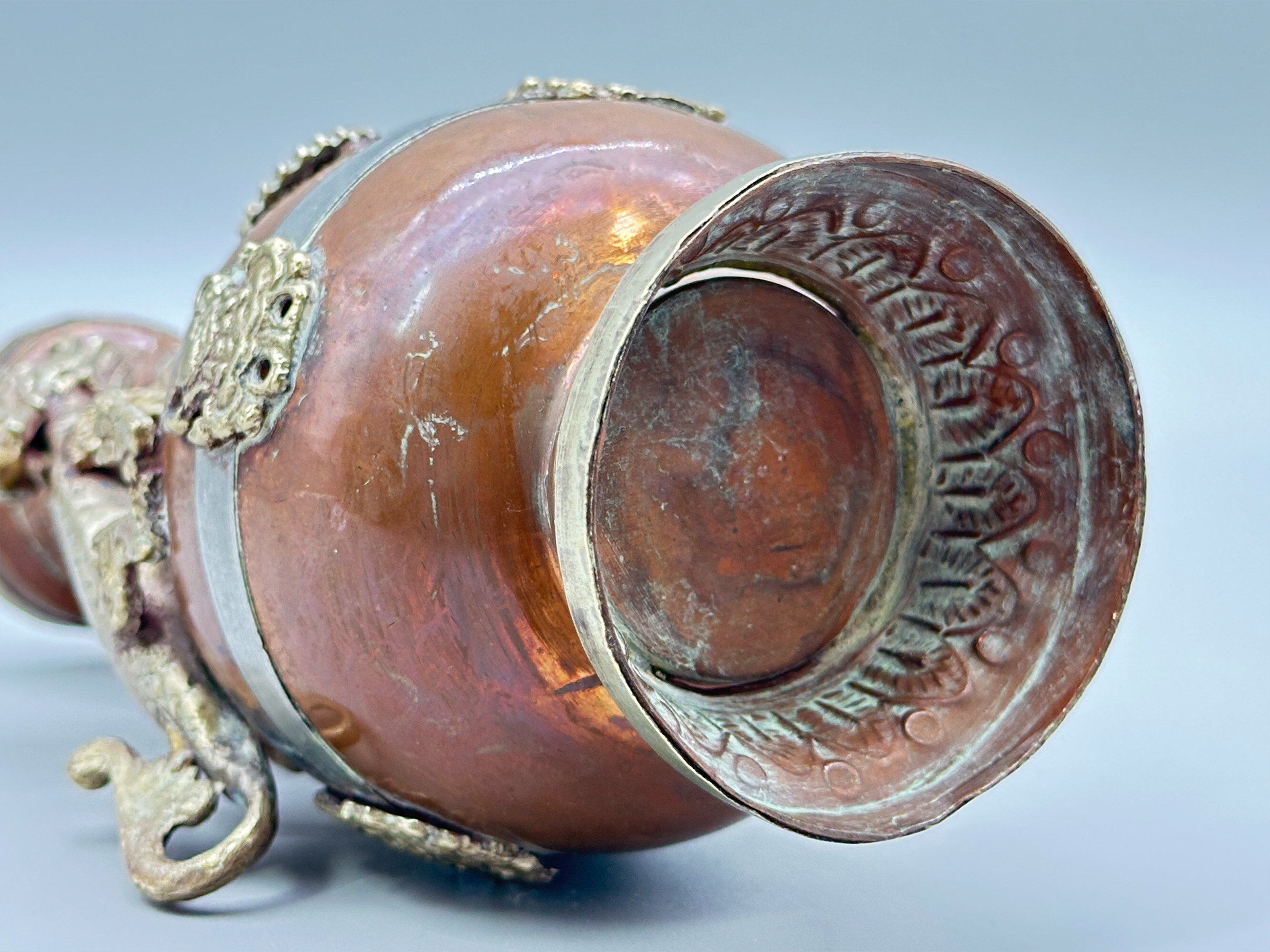 A copper vase with a globular body above a spreading foot and below a neck formed from two cones, one inverted, separated by a broad raised circular band, decorated with two applied dragons crawling upwards, each with a glass roundel below, the neck with hammer punched circles, the body surrounded by a white metal band with stylised brass mask heads and the foot with an incised design of repeating plantain leaves, the base countersunk.There are many elements of Chinese design here, in particular the climbing dragons, but the neither the materials used nor the work itself give any indication of Chinese workmanship. India, Nepal and Tibet have been suggested for similar vases and of these Tibet seems the most likely although Nepal is, of course, a near neighbour. These vases seem to have been a provincial imitation of Chinese work but retain a naif charm of their own. Dating is most likely to the early twentieth century.