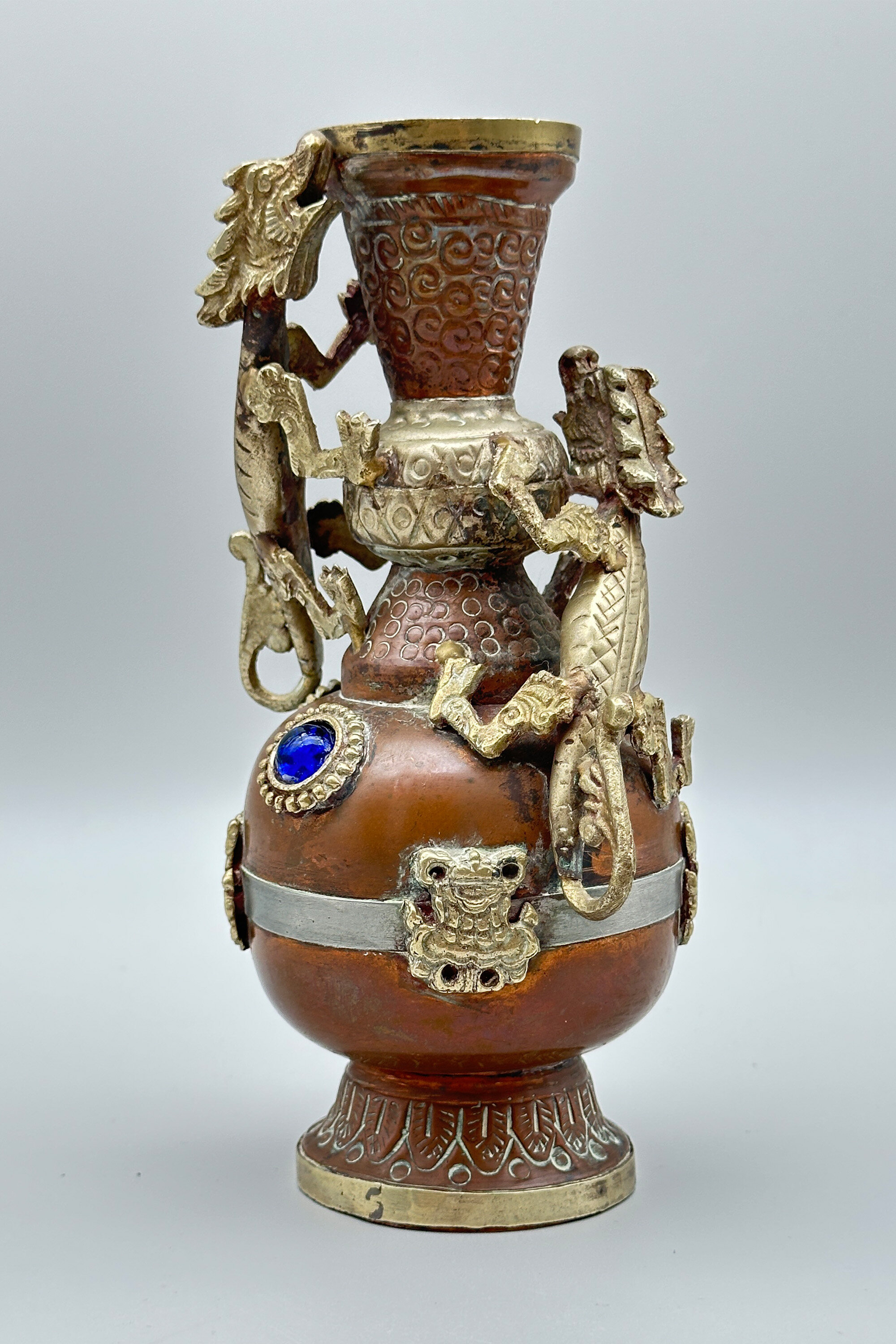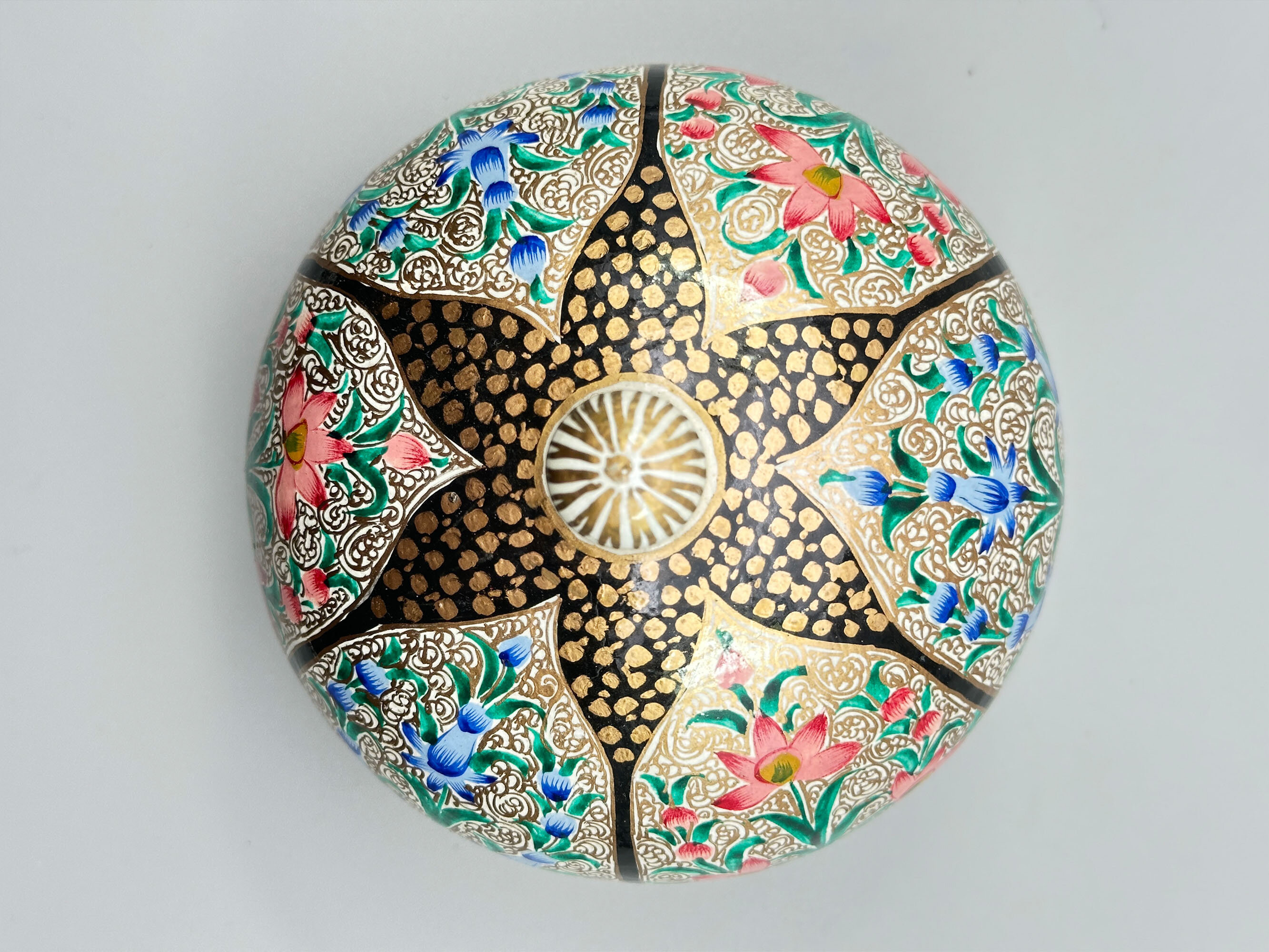 An attractive papier-mâché box and cover of slightly compressed globular form, the cover with a knob finial, and the base and lid with a mating small triangular section to ensure a secure fit, finely decorated in polychrome colourings with panels of stylised lotus on a gilt scroll ground, the top with gilt cells on a black ground and the base with a band of repeating gilt stylised lotus leaves, the interior and underside finished in black. The style of the decoration here is typical of the papier-mâché wares produced in Kashmir in the nineteenth and twentieth centuries which were known for their fine and elaborate floral decoration. Round trinket boxes were a particular speciality and this is a good example which probably dates to the early twentieth century.| Size: | Ht (max) 9cm, Ht (box) 3.5cm, Diam (max) 10cm, Base 5.8cm |