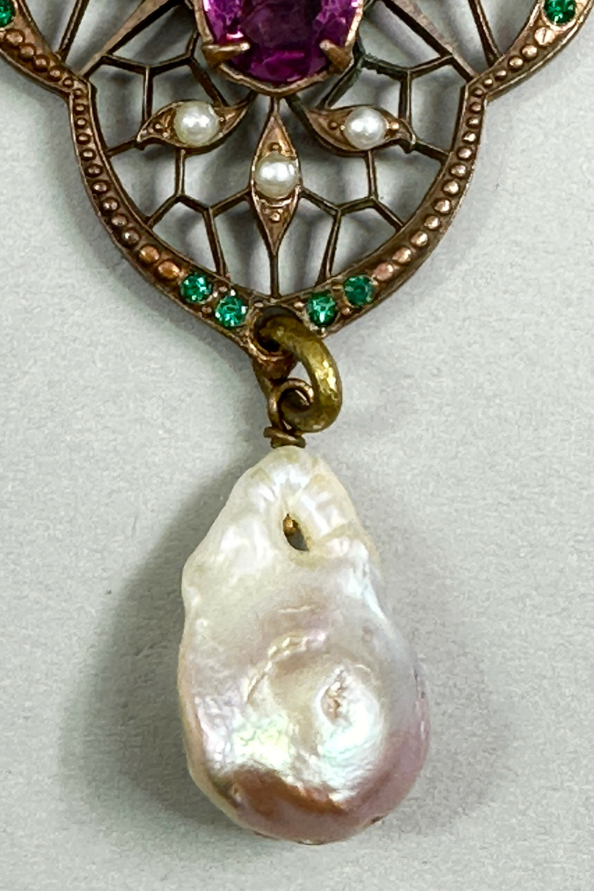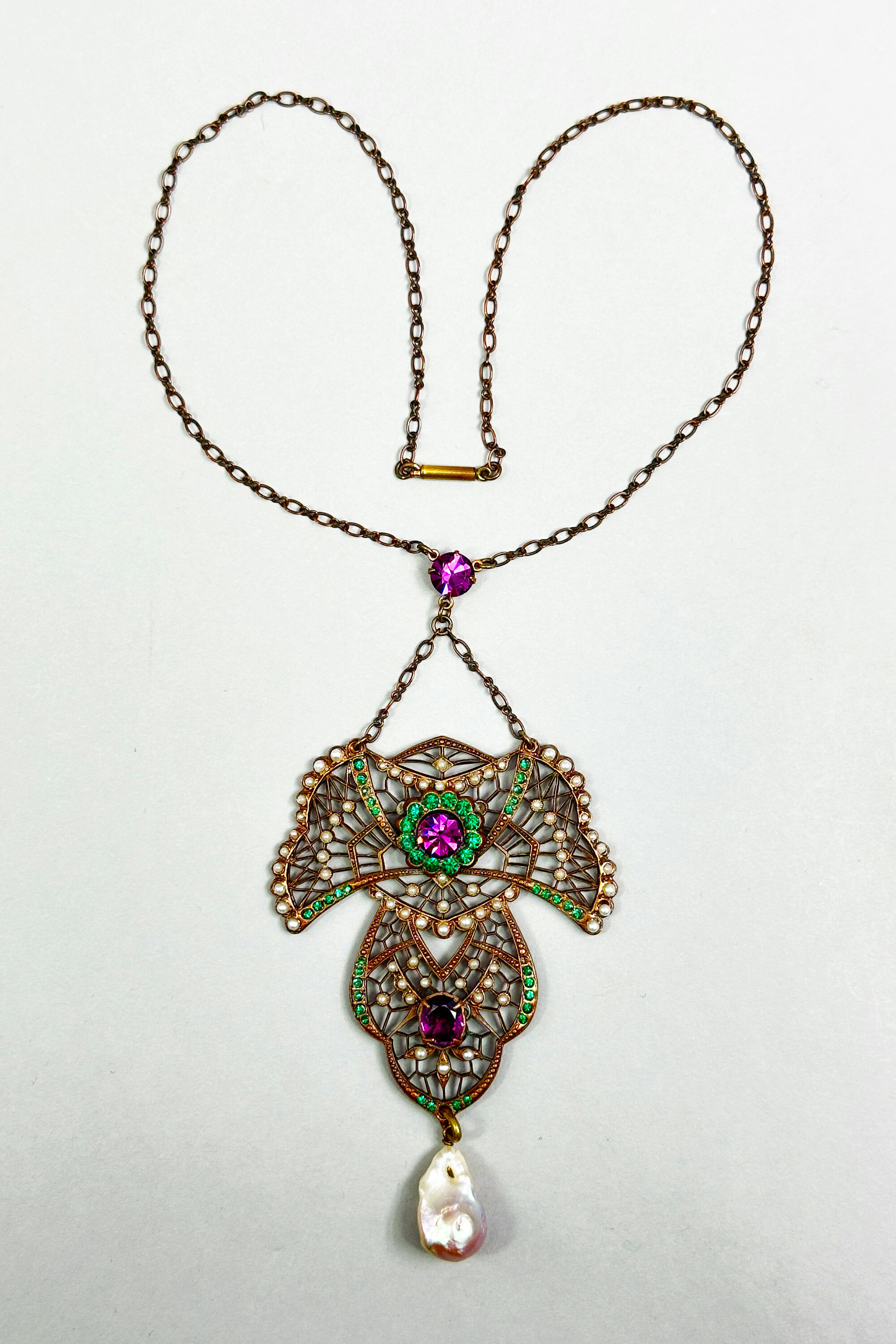 This is a very rare necklace that is in a lariat design. The central pendant has a lace design set with real seed pearls and paste stones. There is also a large teardrop shaped natural fresh water pearl.| Size: | Necklace is 40 cm long, central pendant is 6 x 5.6 cm (without pearl drop) |