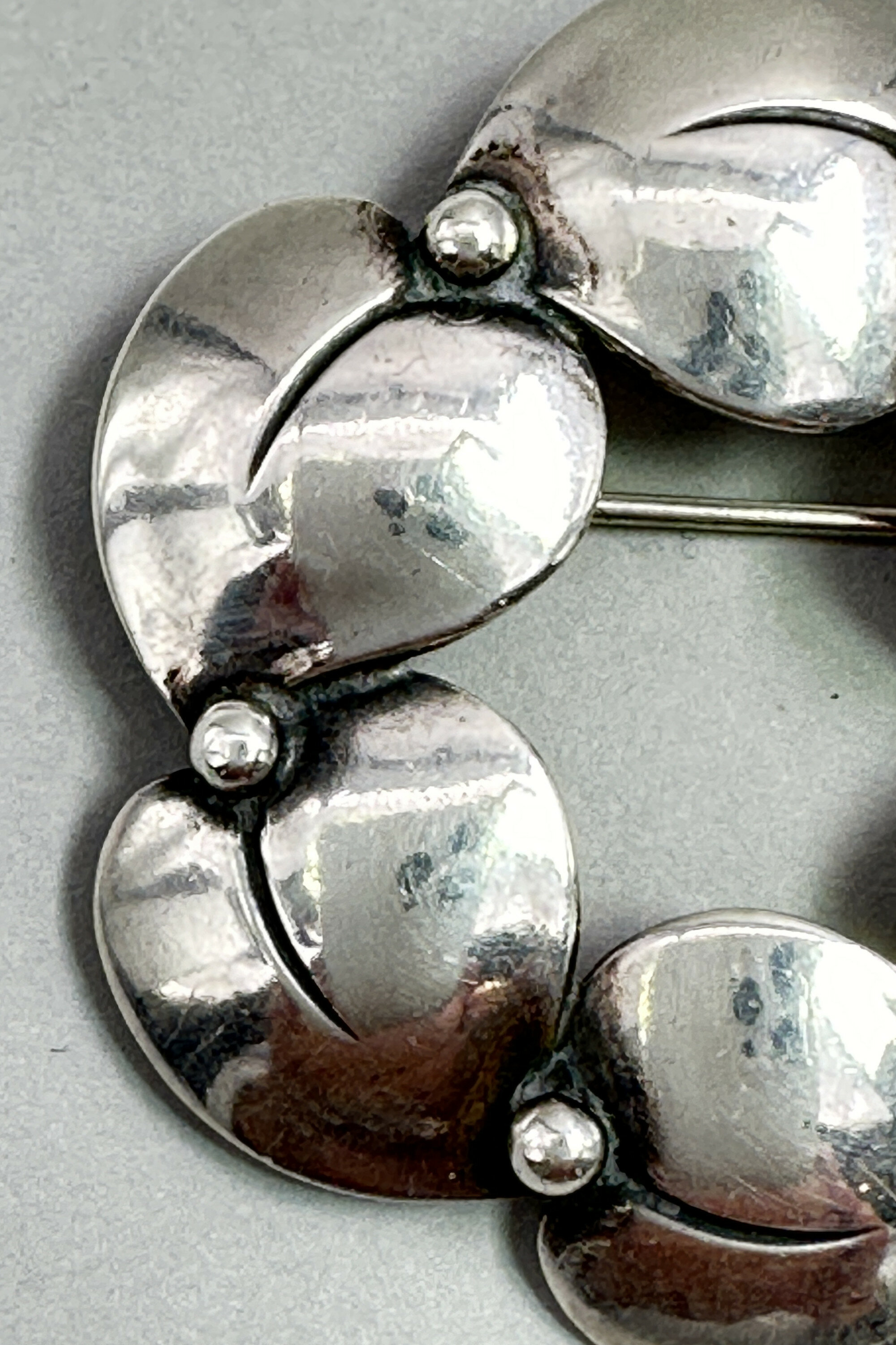 This is a wonderful quality silver brooch made by Danish silversmiths Niels Erik From. It is in a characteristic Danish wreath design typical of the modernist designs developed by the firm in the 1970s. Established in 1931, the company took its name from its founder Niels Erik From (1908-1982) and initially concentrated on pieces in the style of the Danish Arts and crafts movement, later adapting to the changing fashions of the time. Niels Erik From's son joined with his father in the 1960s and continued the success of the business, running it himself for a few years after his Father's death but finally closing down in the late 1980s. The firm's designs remain highly collectible and this brooch is an excellent example of their later work. It marked ' Sterling' 'Denmark' 'N.E.From' '925 S'.| Size: | 3.79 diameter |
