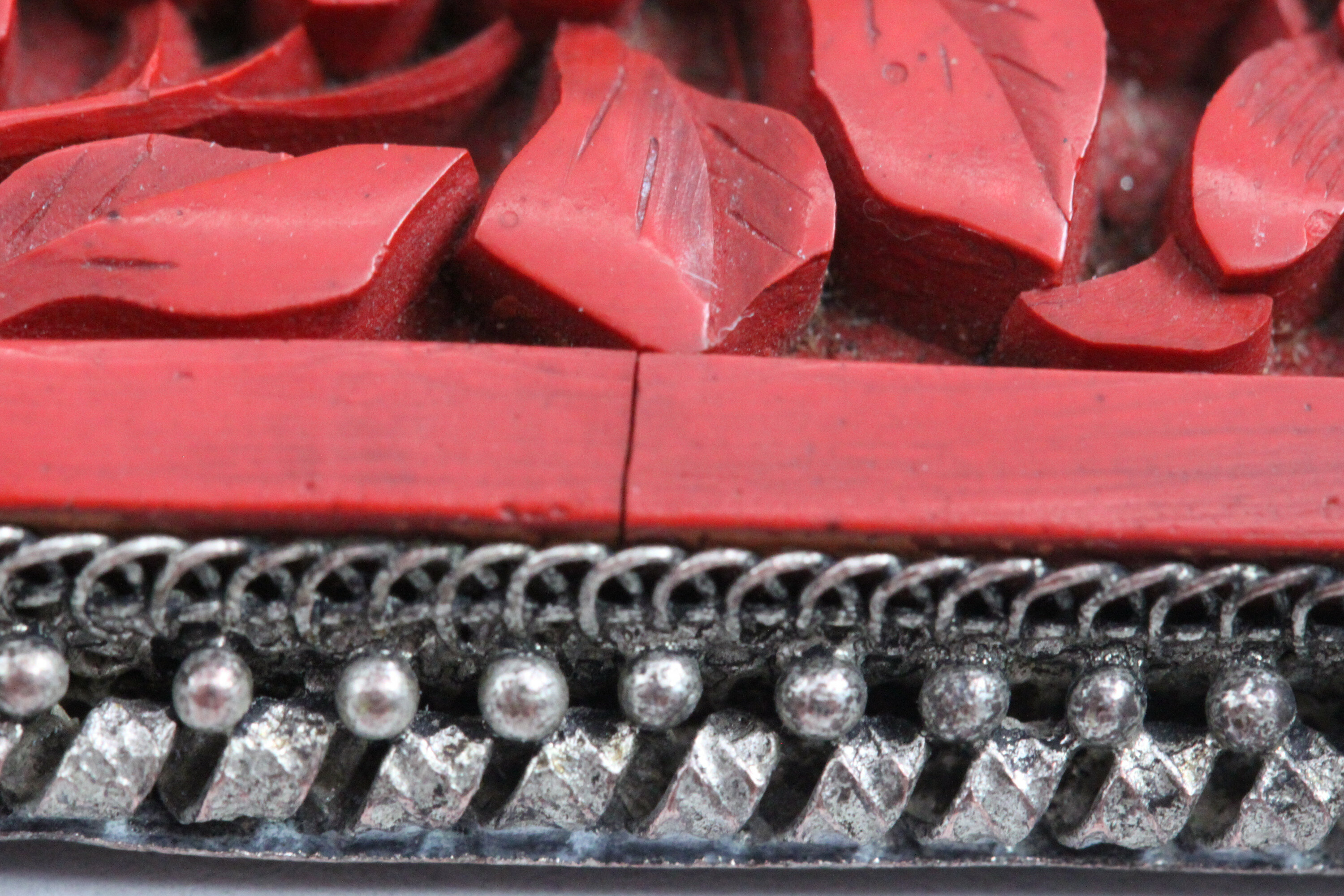 This is a large carved cinnabar lacquer brooch that was very typical of the 1930s. The carefully detailed plaque, modelled with peony blooms, is mounted in silver with a filigree work border.| Size: | 5.5 x 3.7 cm |
