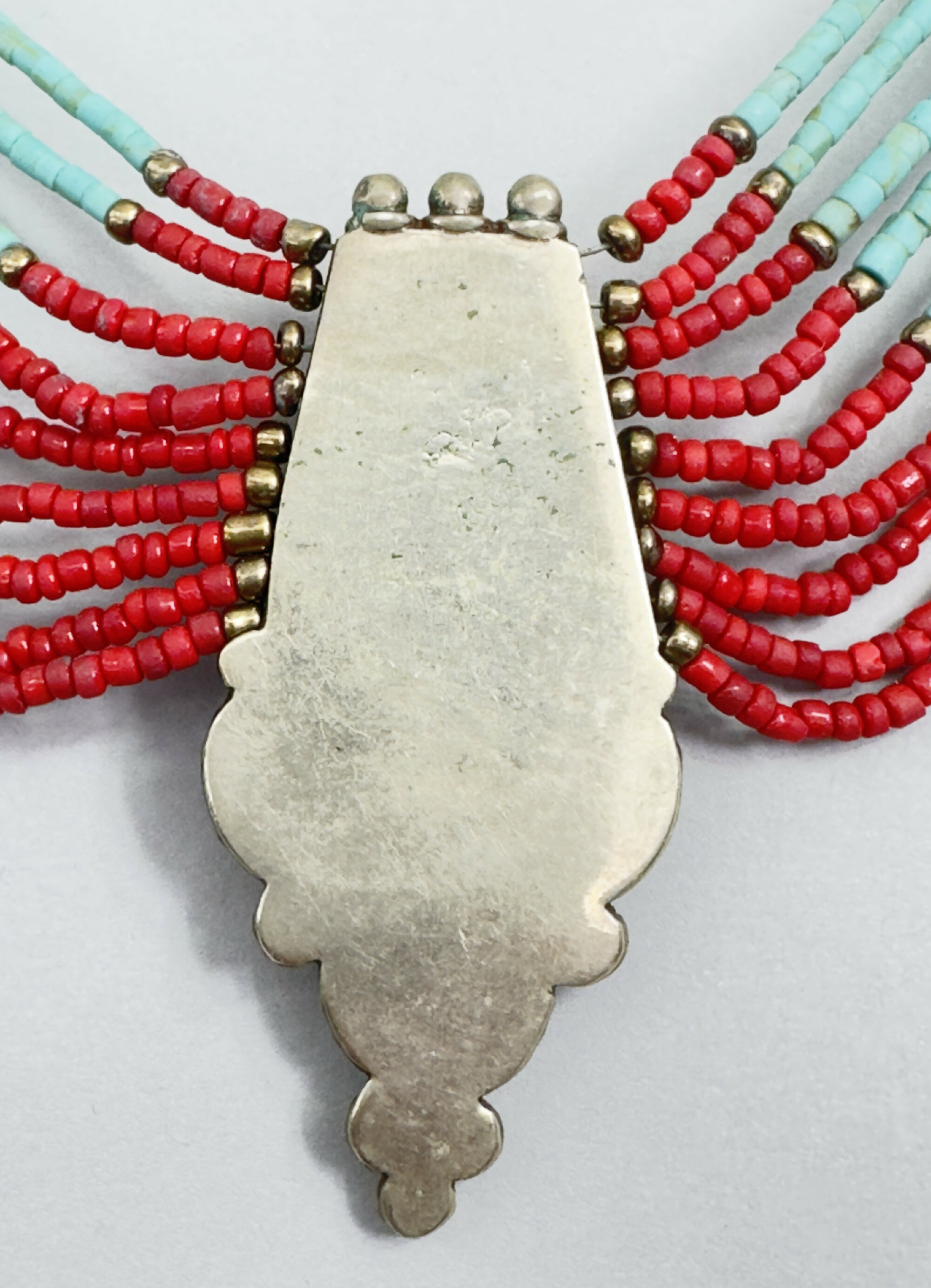 This a very elegant necklace comprising a central pendant with a typical Berber design with turquoise and coral mosaic inlay. This pendand is connected with nine strands of coral and turquoise micro beads. This design is repeated all the way around with a further 4 connecting stations.| Size: | Central pendant is 55 x 25 mm, 40 cm lengh |