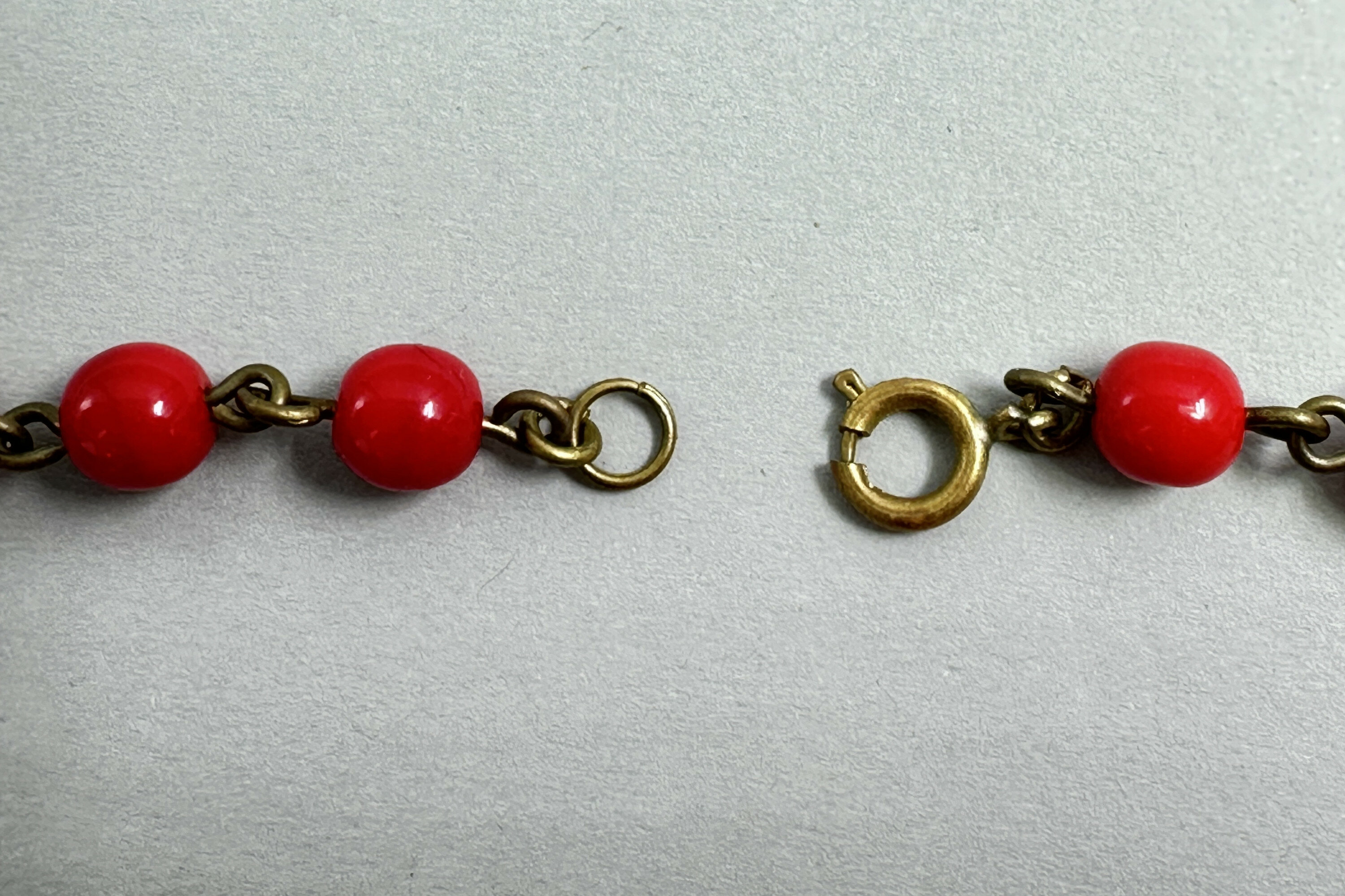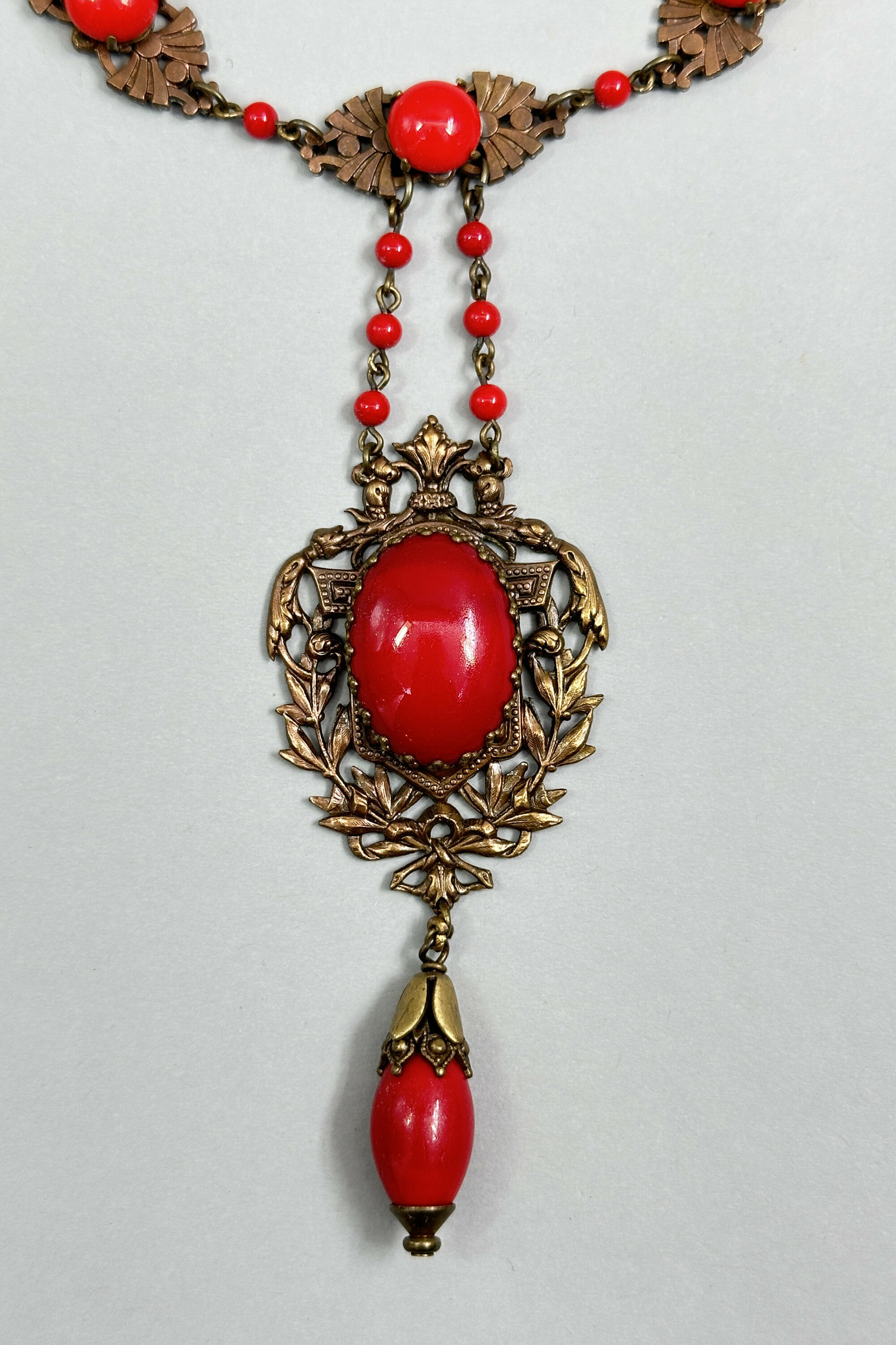 This is a beautifully designed necklace that features a central lariat pendant set with red glass stones. The necklace has corresponding red beads.| Size: | Central pendant 5.3 x 3.6 cm, drop is 8.9 cm Necklace is 40 cm long |